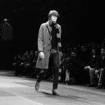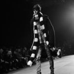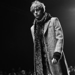 L’écharpe ultralongue est le détail que l’on retrouve le plus souvent, portée de façon à accompagner le mouvement, elle ne fait le tour du cou qu’une fois et descend le long du corps jusqu’aux genoux.