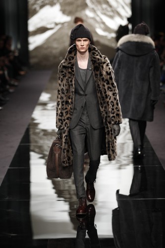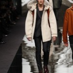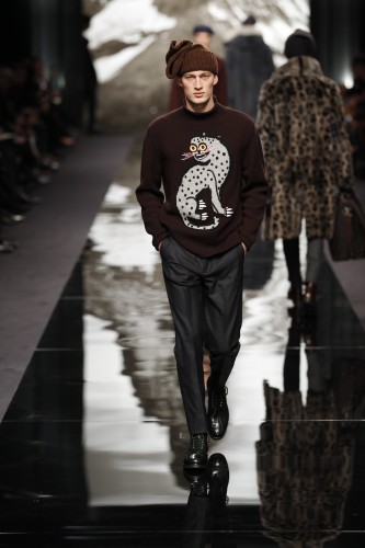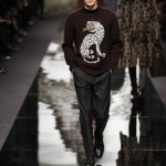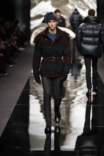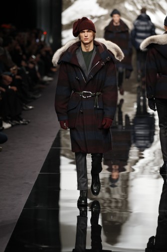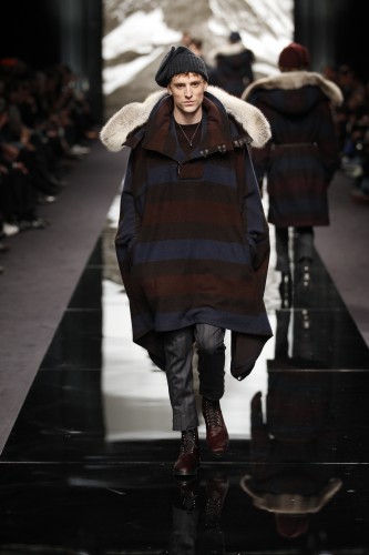 Ce défilé qui s’assimile a une ascension de l’Himalaya est en crescendo. Plus nous avançons, plus les looks qui nous sont proposés sont chauds et adaptés a la rudesse des hauteurs. Après un manteau en fourrure aux imprimés léopards (et son pull clin d’œil) , les doudounes viennent se mêler à la danse ainsi que les ponchos a rayures et capuches doublées.