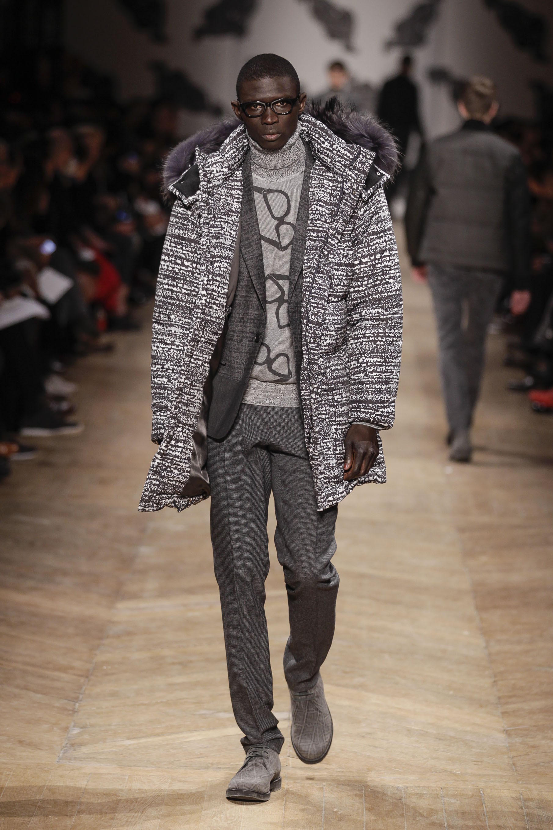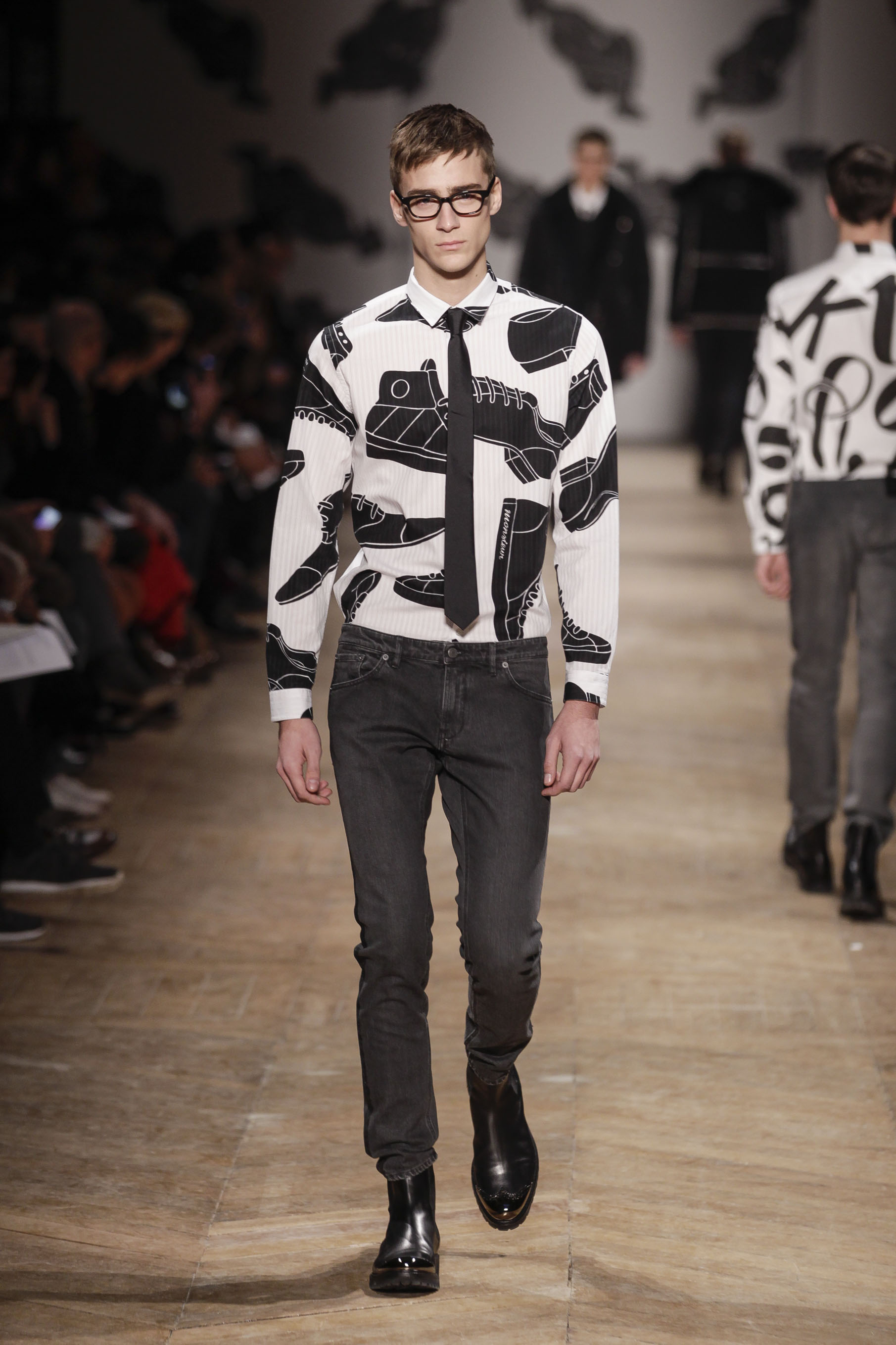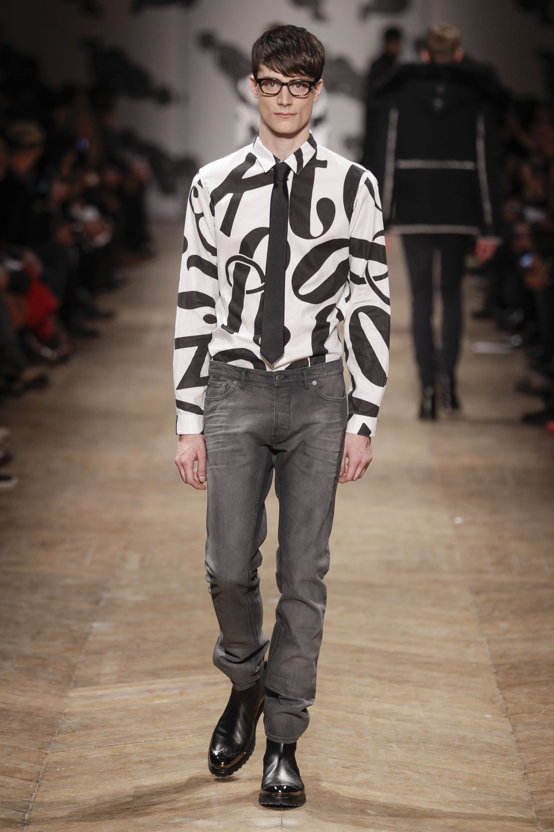 Silhouettes pointues et mélange de matière se retrouvent tout au long de la collection et les pièces doublées sont aussi présentes. Les imprimés sont la dose de fantaisie la plus évidente de cette collection : format XL ou mini, l’imprimé Monsieur, créé en partenariat avec l’artiste néerlandais Piet Parra, un autre imprimé en forme de lunettes et finalement un imprimé qui représente un parachutiste, sont justement injectés au fil des vêtements.