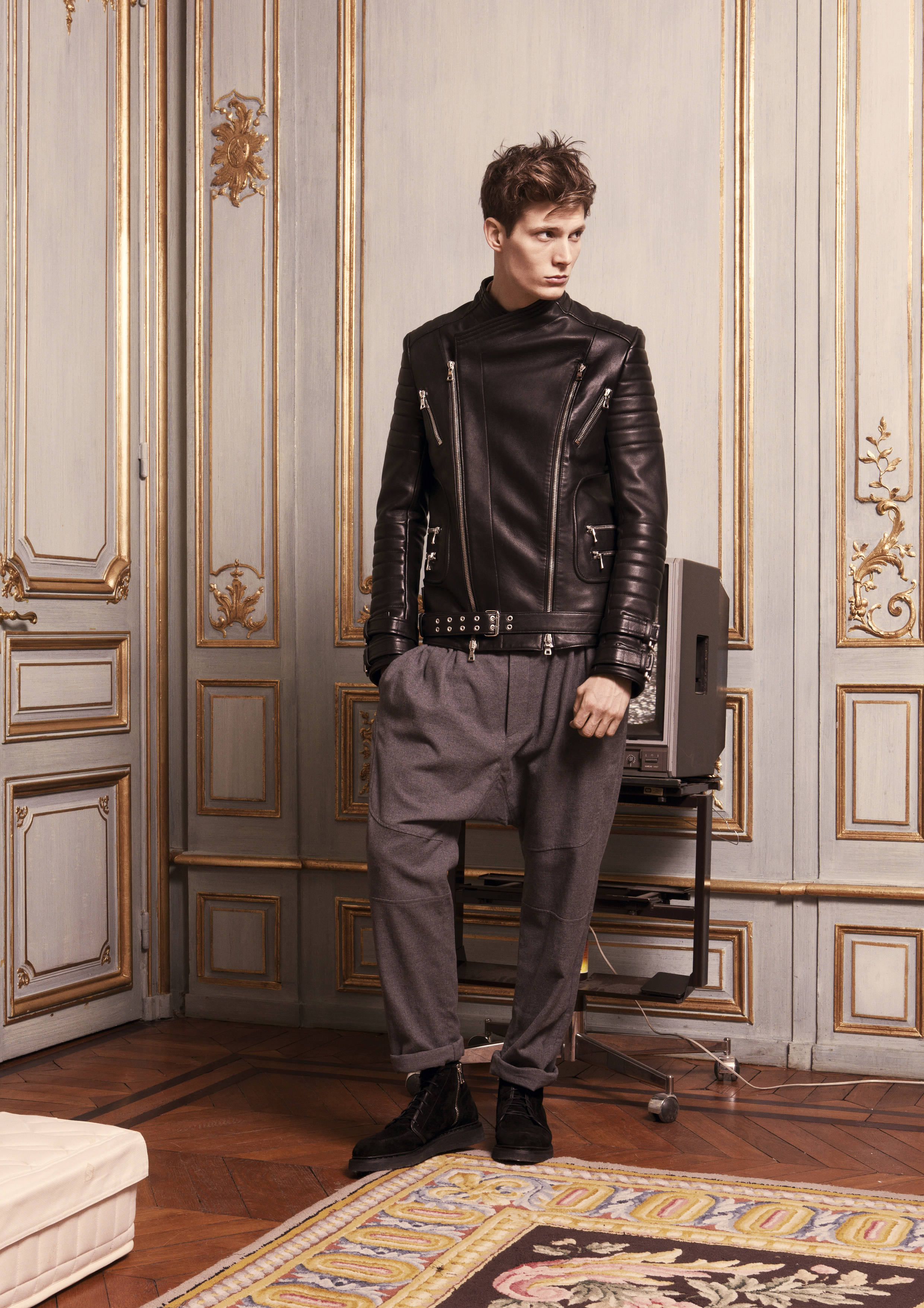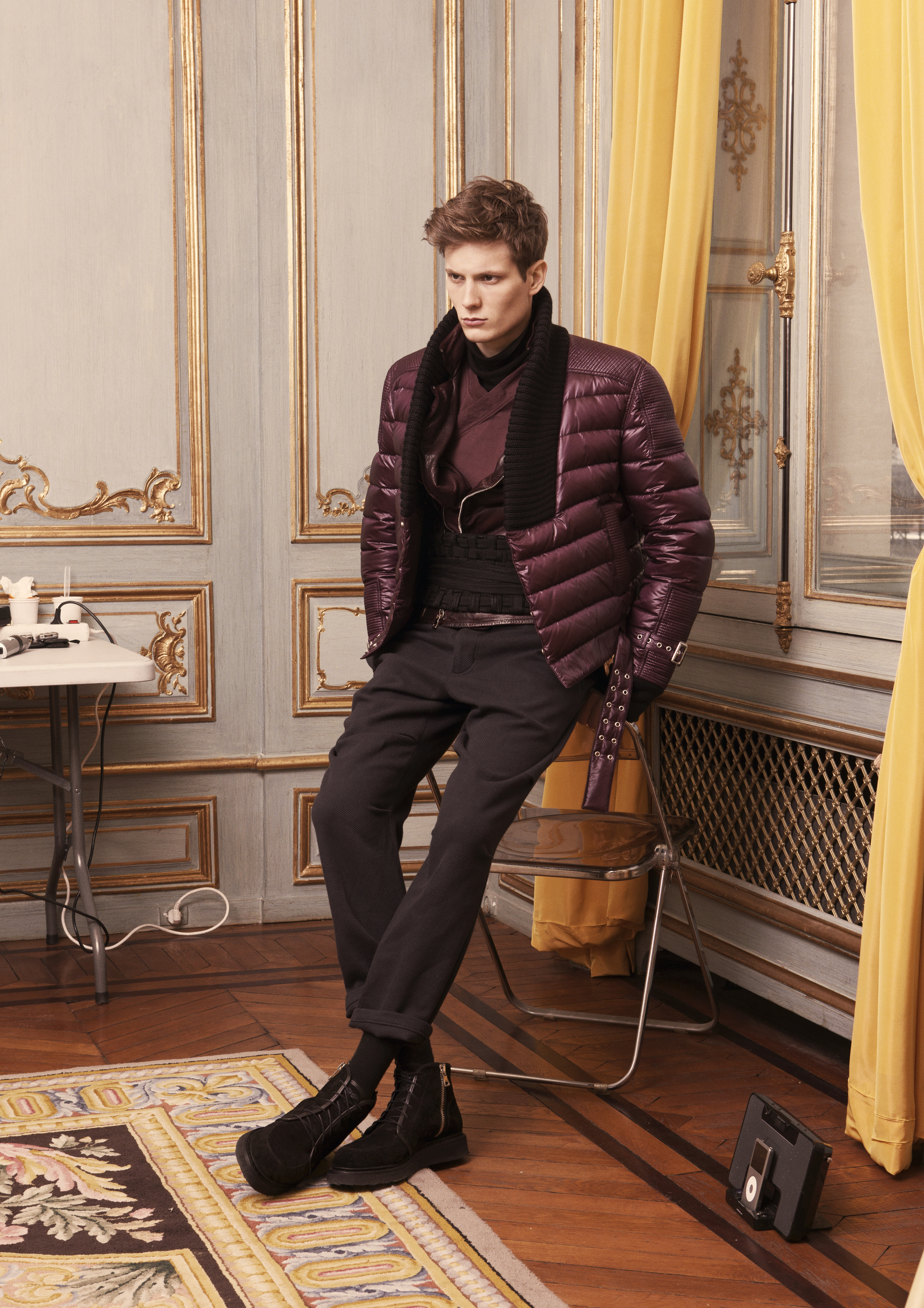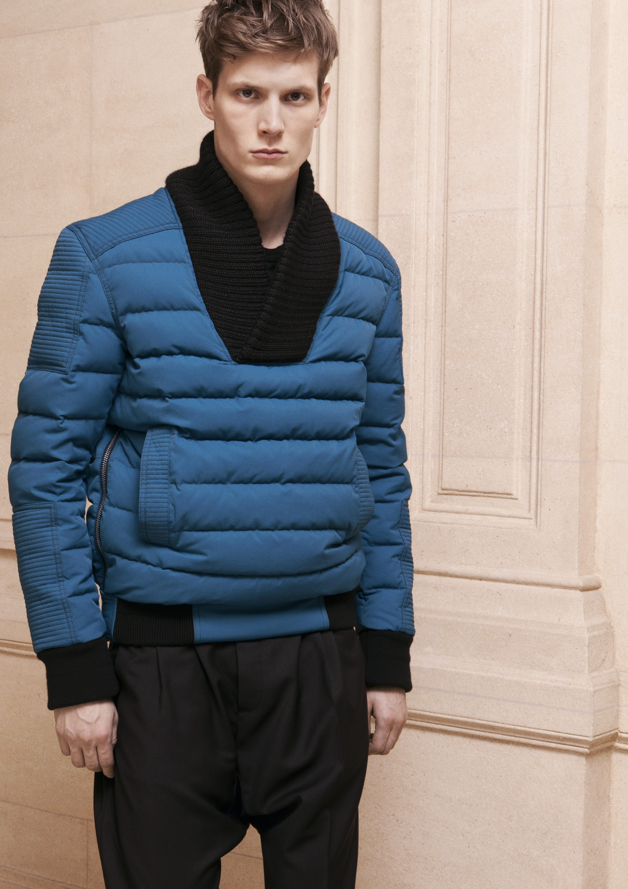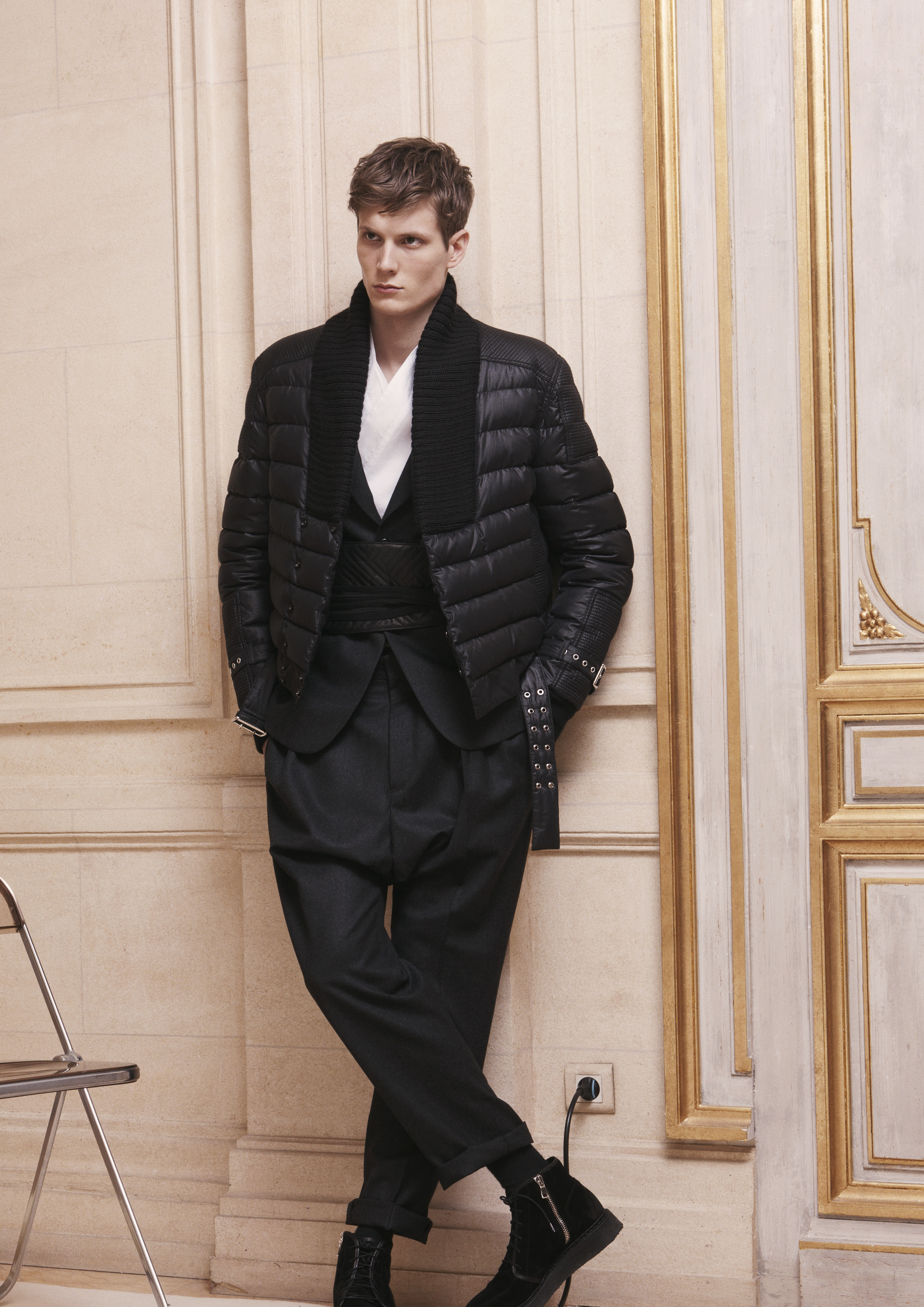 L’homme Balmain se démarque aussi par son appréciation des matières matelassées que l’on retrouve sur les doudounes a col en laine façon pull, mais aussi un perfecto, les teintes monochromes et les pantalons type sarouel.