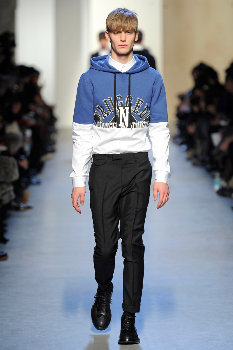 Tons sombres et vêtements inspires du streetwear, Kris Van Assche, prodige de la mode pour homme nous emmène dans un univers ou les dress codes s’entremêlent pour créer une esthétique nouvelle. Des bandes extraites de jogging a capuche viennent briser le côté monotone d’un costume trop sérieux, l’effet de surprise est de rigueur.