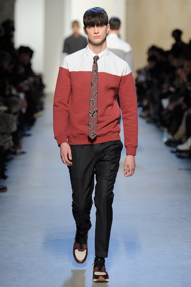 Les vêtements sont composés de plusieurs parties : une chemise comprendra plusieurs sections comme si le col, la poitirine et le bas étaient chacun extraits d’autre vêtements et avaient été cousus ensemble au dernier moment. Le créateur, au delà de jouer sur le mélange de matière, s’attaque aussi a la géométrie des vêtements et les bandes et les jeu de symétrie sont a l’honneur.