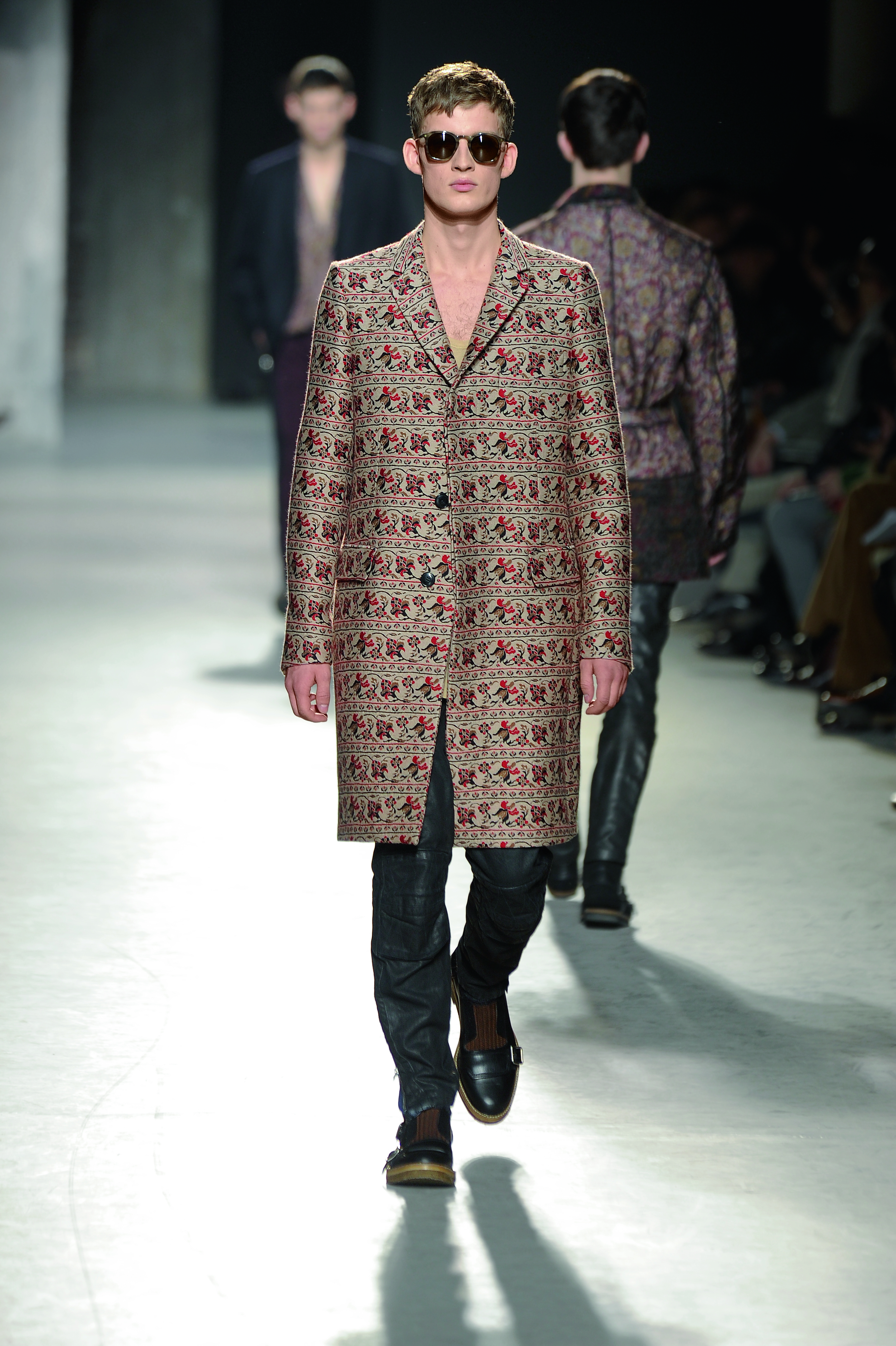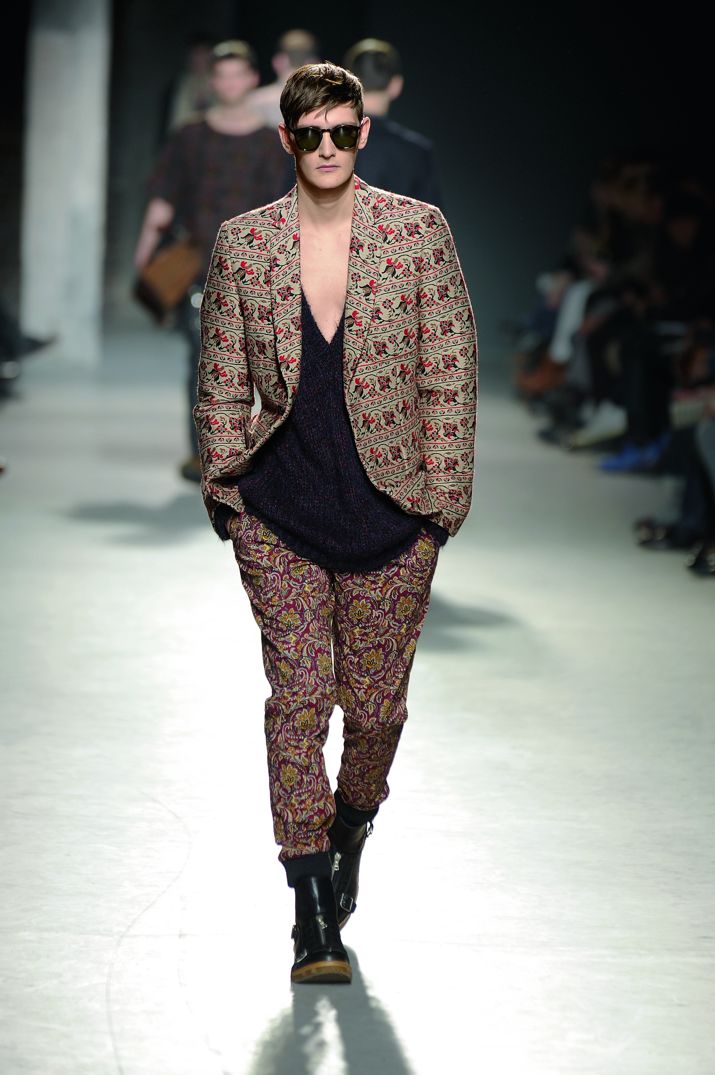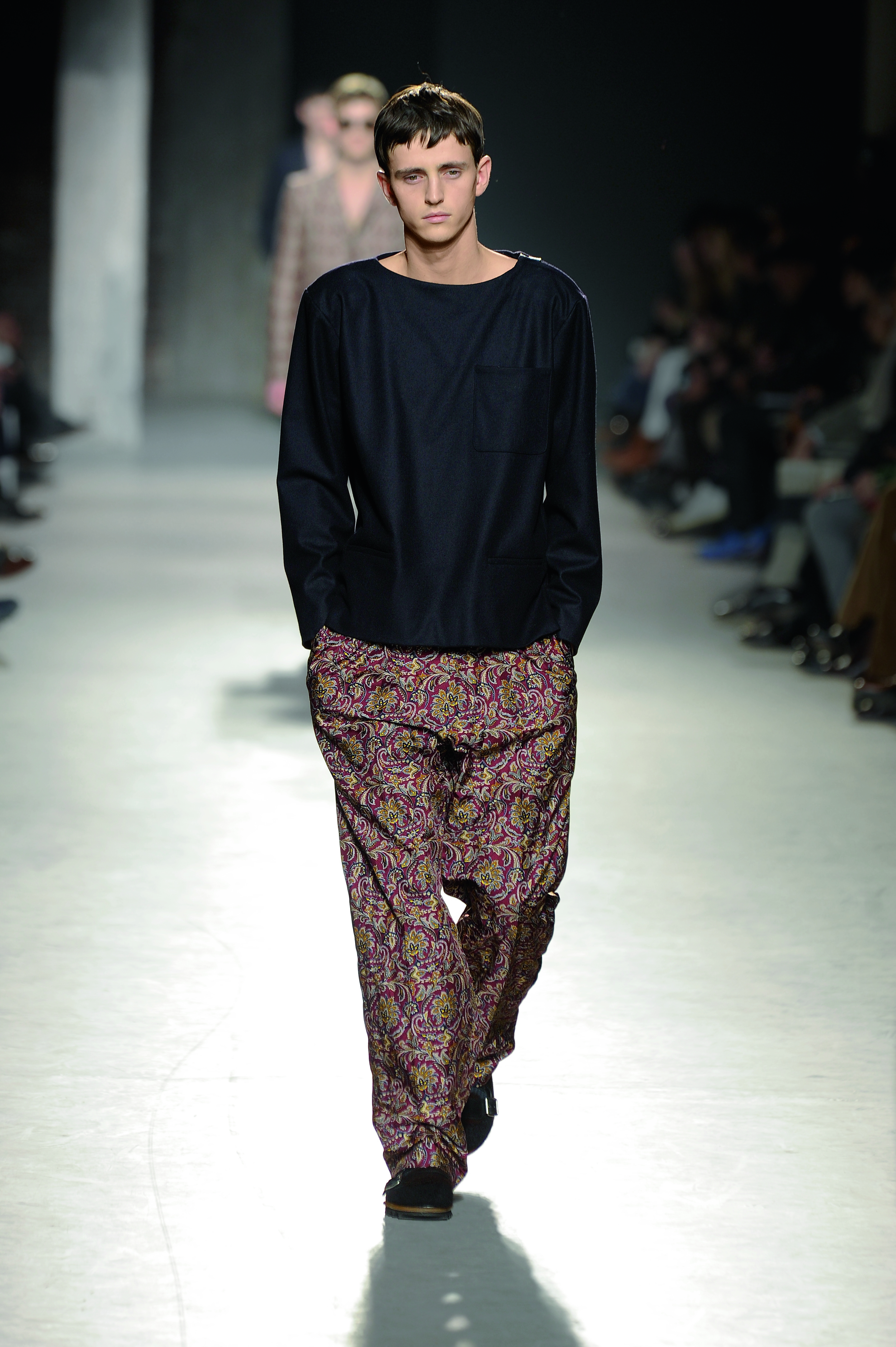 Manteaux en brocade et bottines à boucle, l’homme Dries Van Noten a tout du dandy décontracté mais exigeant. Il ose même le mélange des imprimés sur certains looks (une tendance que l’on retrouve chez la femme).