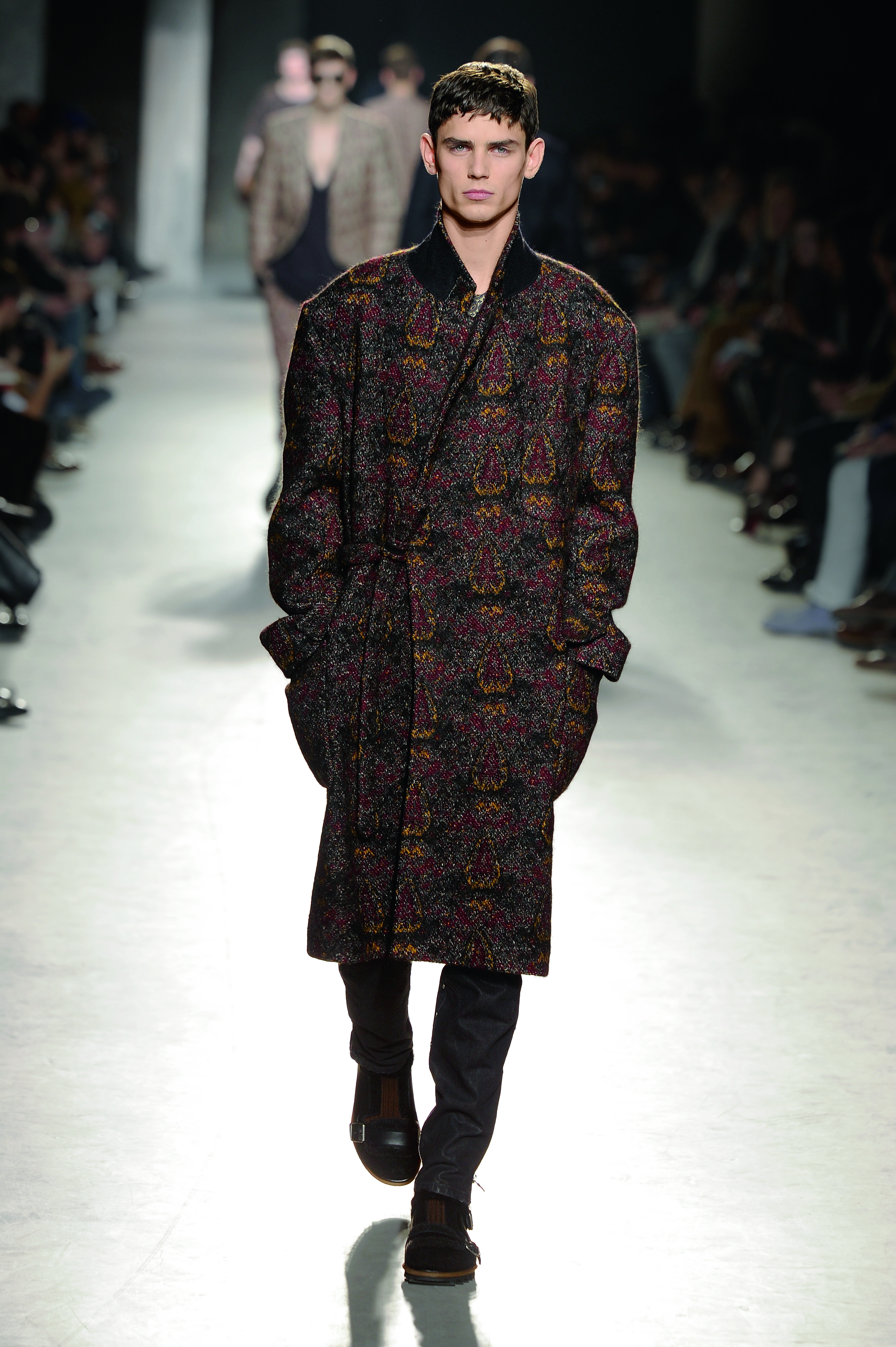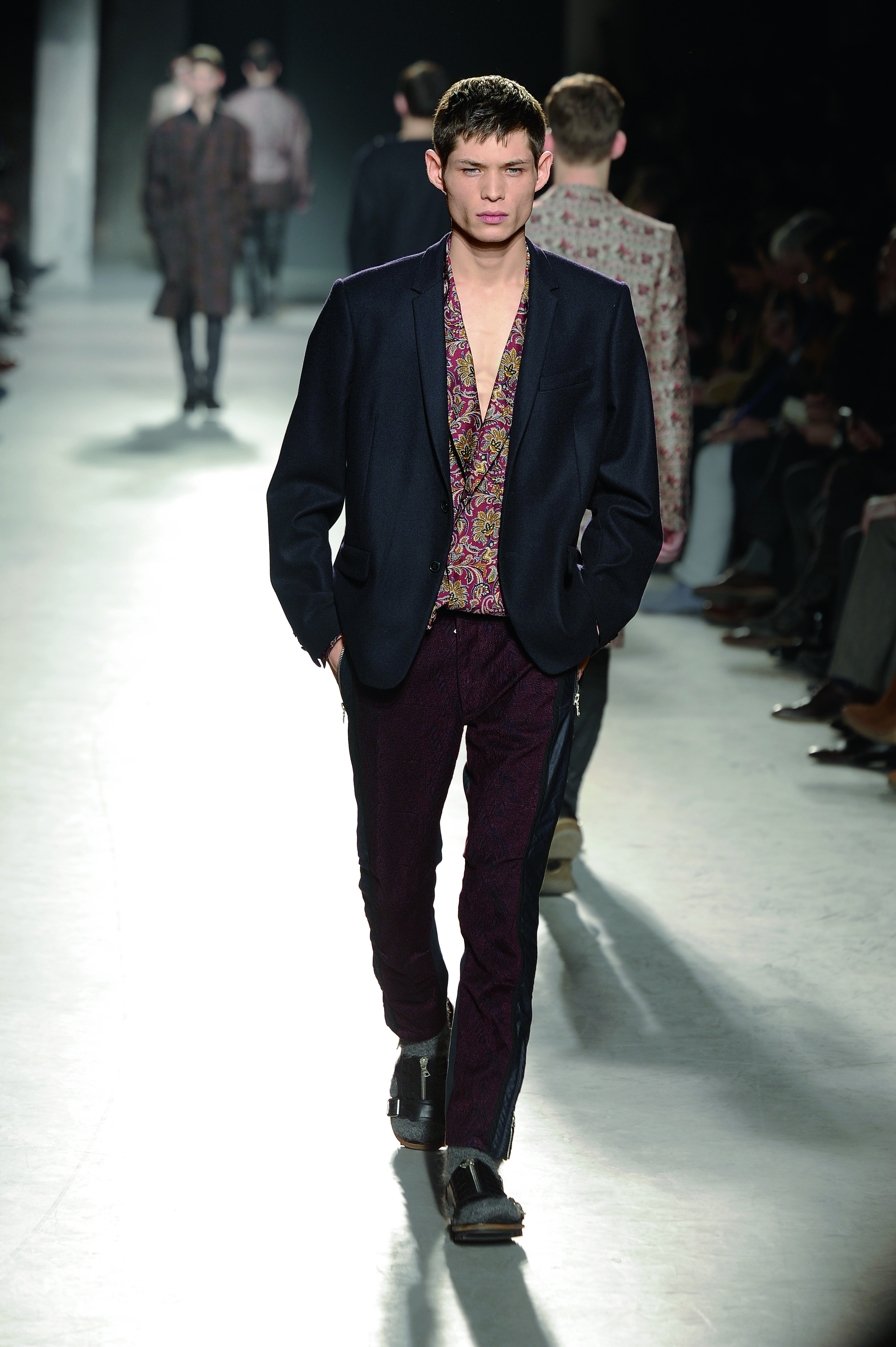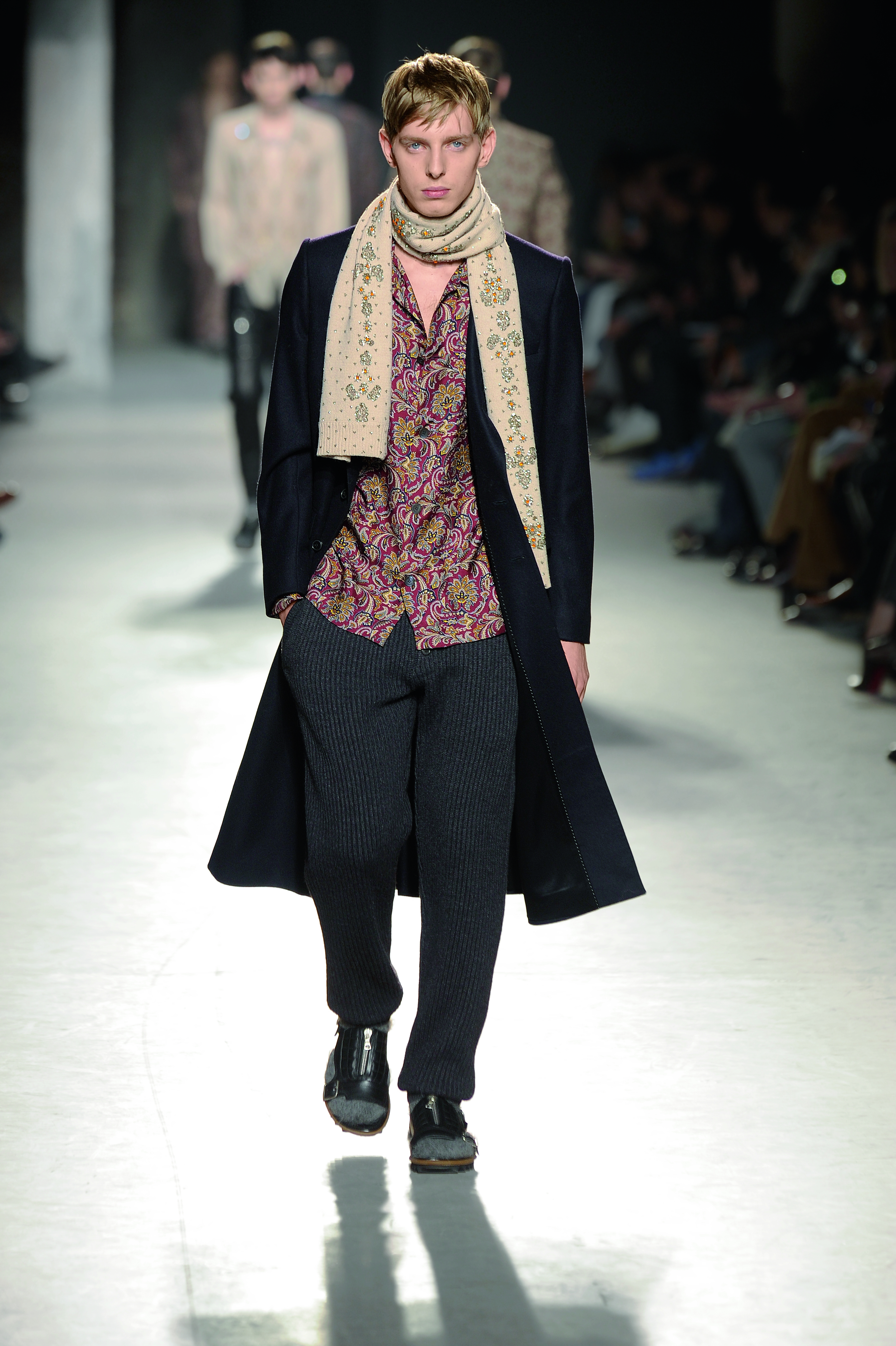 Créateur belge connu pour la délicatesse et la poésie de ses créations, Dries Van Noten interprète le vetement masculin de façon romantique et bohème pour l’hiver 2013/2014.