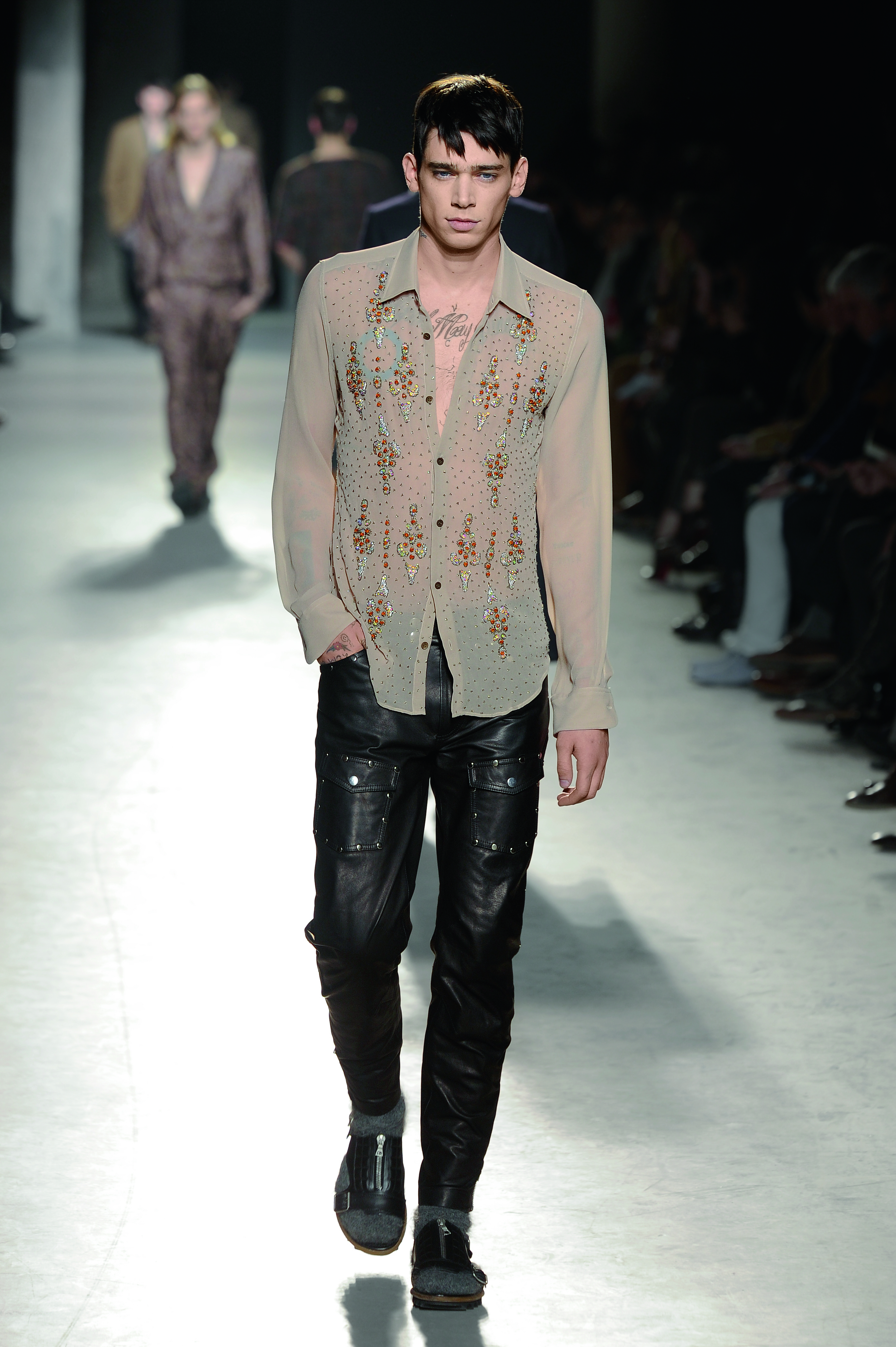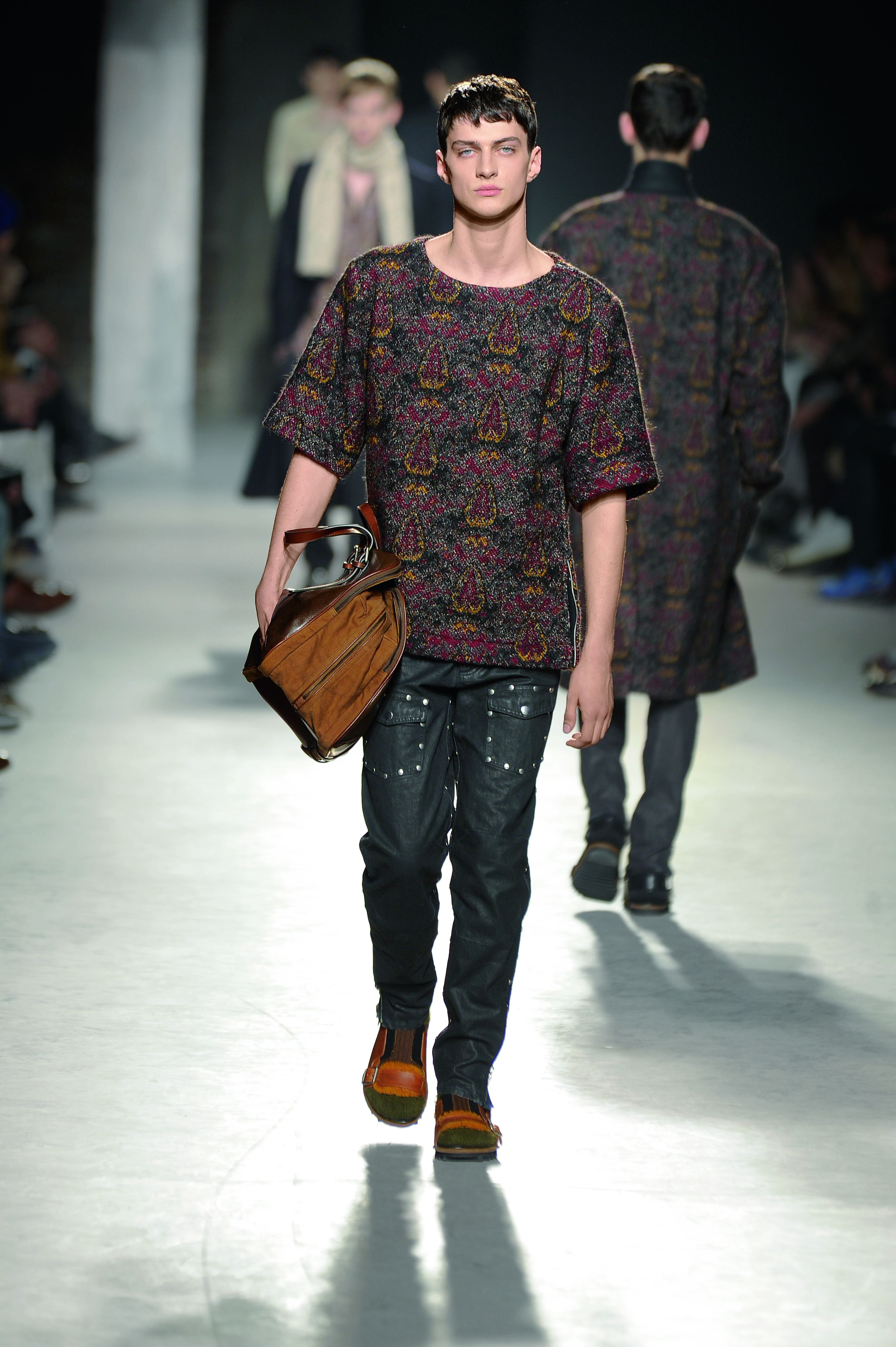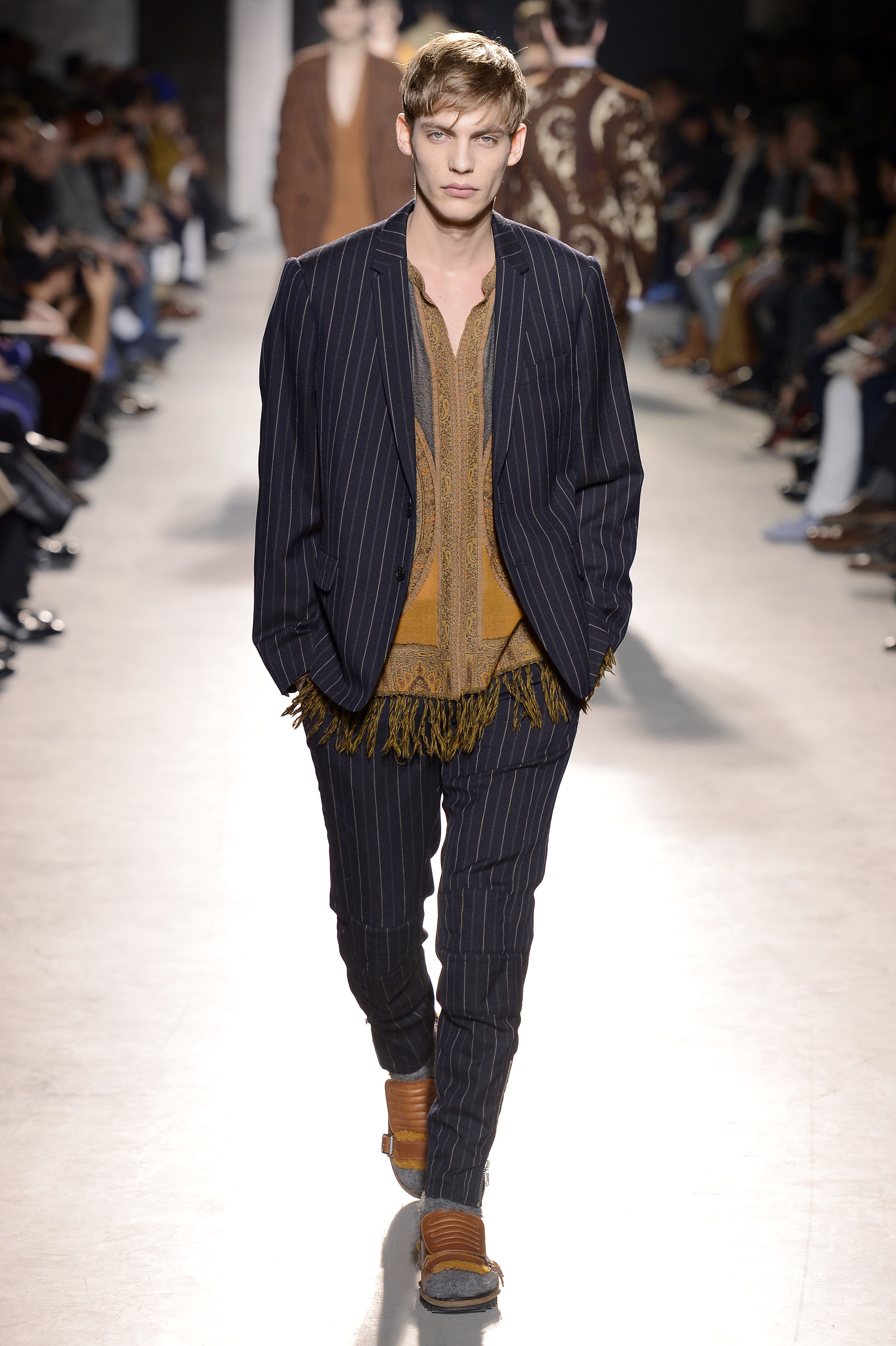 Créateur belge connu pour la délicatesse et la poésie de ses créations, Dries Van Noten interprète le vetement masculin de façon romantique et bohème pour l’hiver 2013/2014.