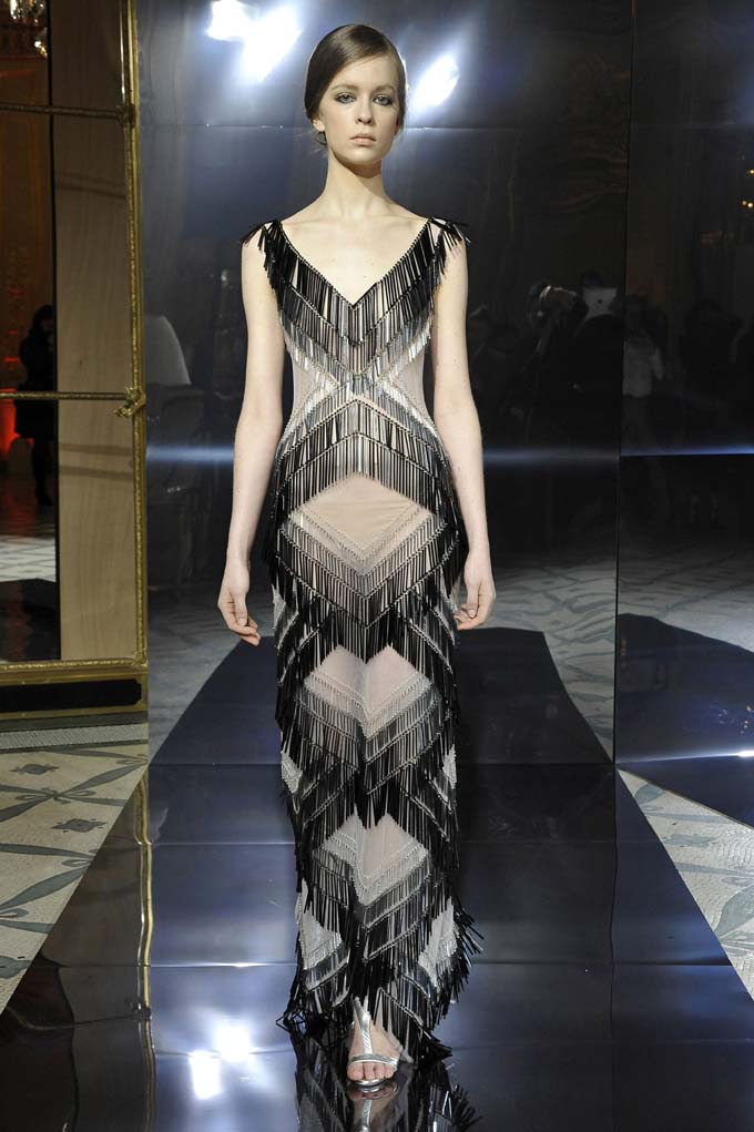 L’association de pompons et de franges, clin d’oeil vibrant à l’allure Garçonne, évoque d’emblée l’insolence des Années Folles. Les imprimés Art Déco s’amusent d’effets visuels éclectiques à travers des jeux de broderies et des correspondances de lignes droites et graphiques. Imprégné par le concept du « Less is more », le créateur offre ainsi une collection élégante, surprenante de simplicité, bien que riche de tonalités chatoyantes et scintillantes, pour une mode haute