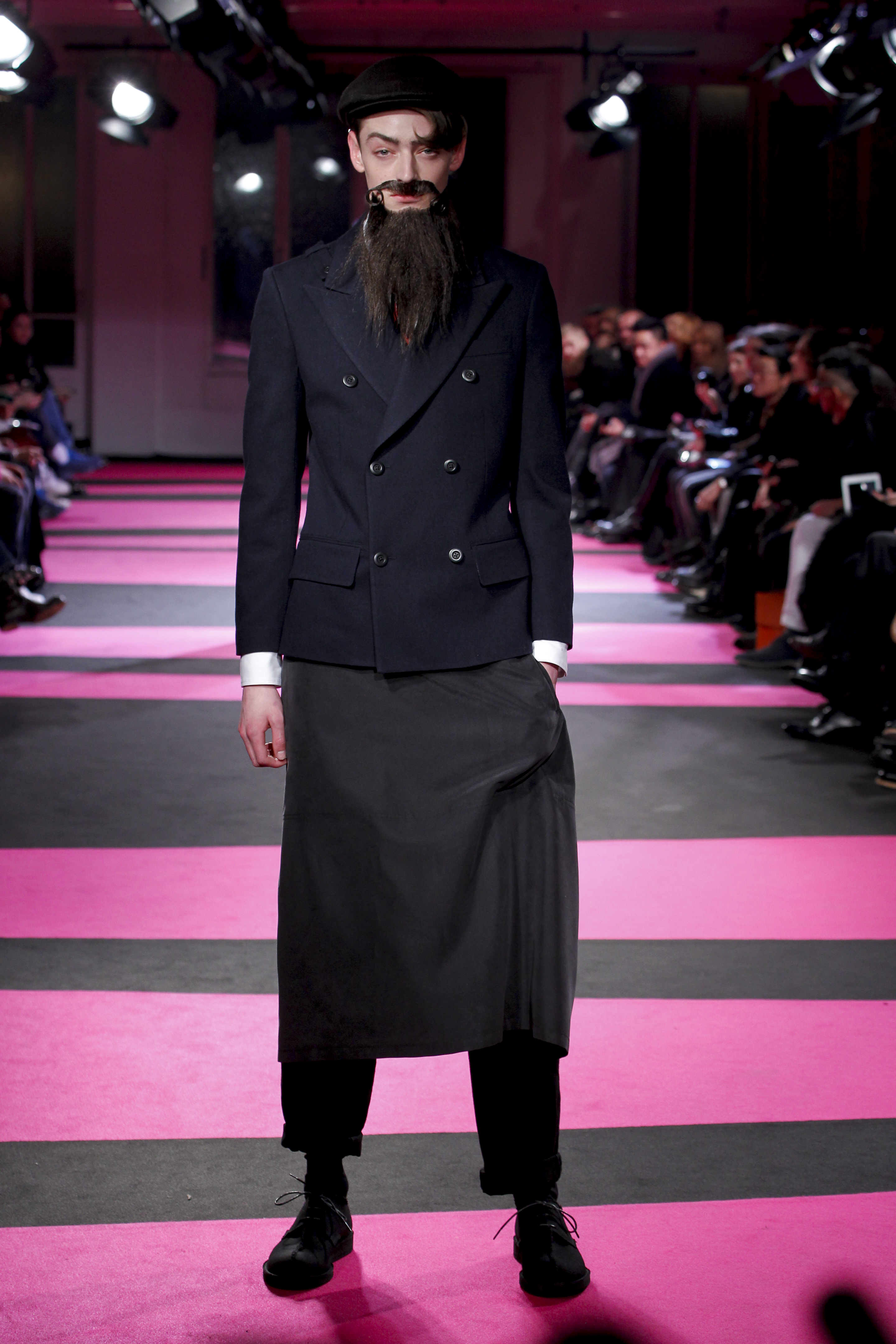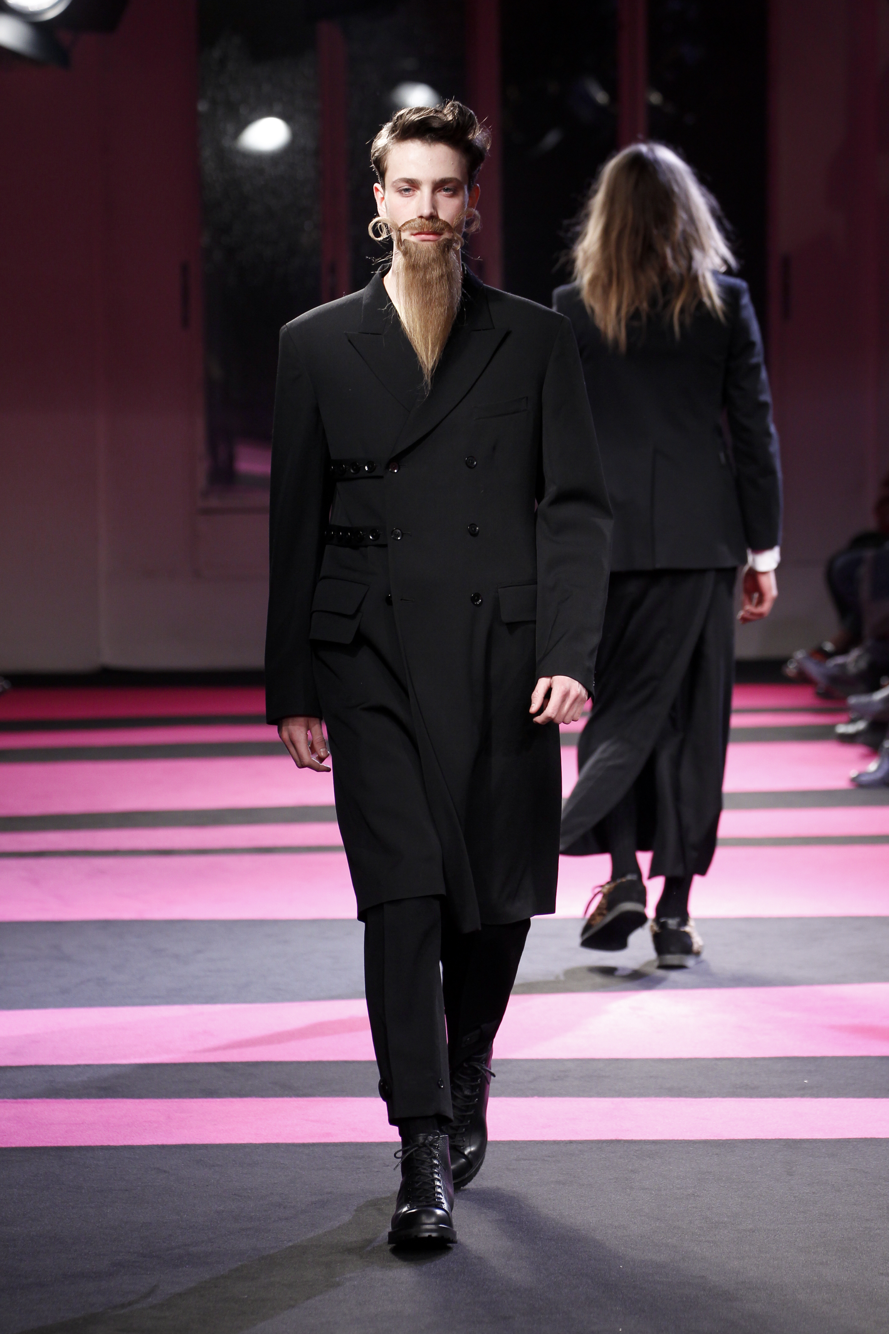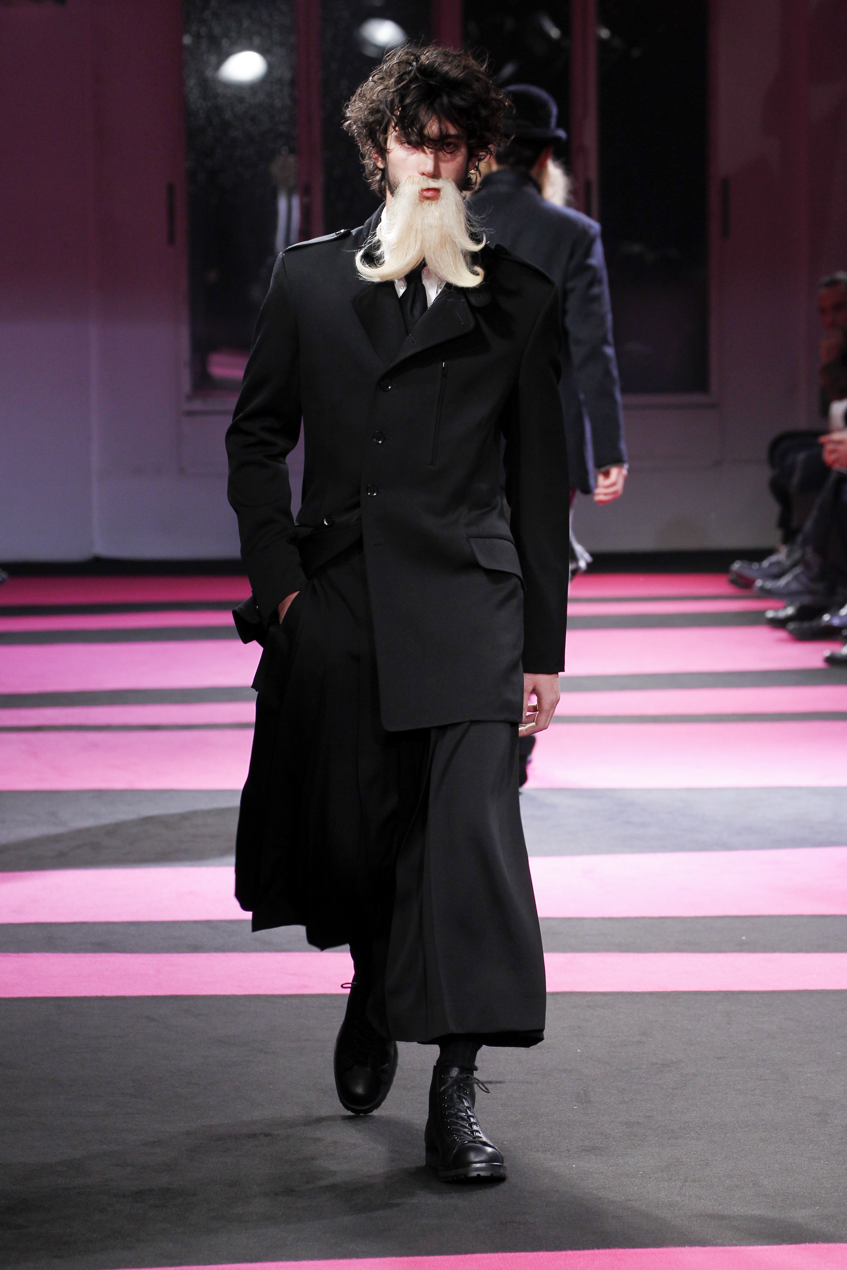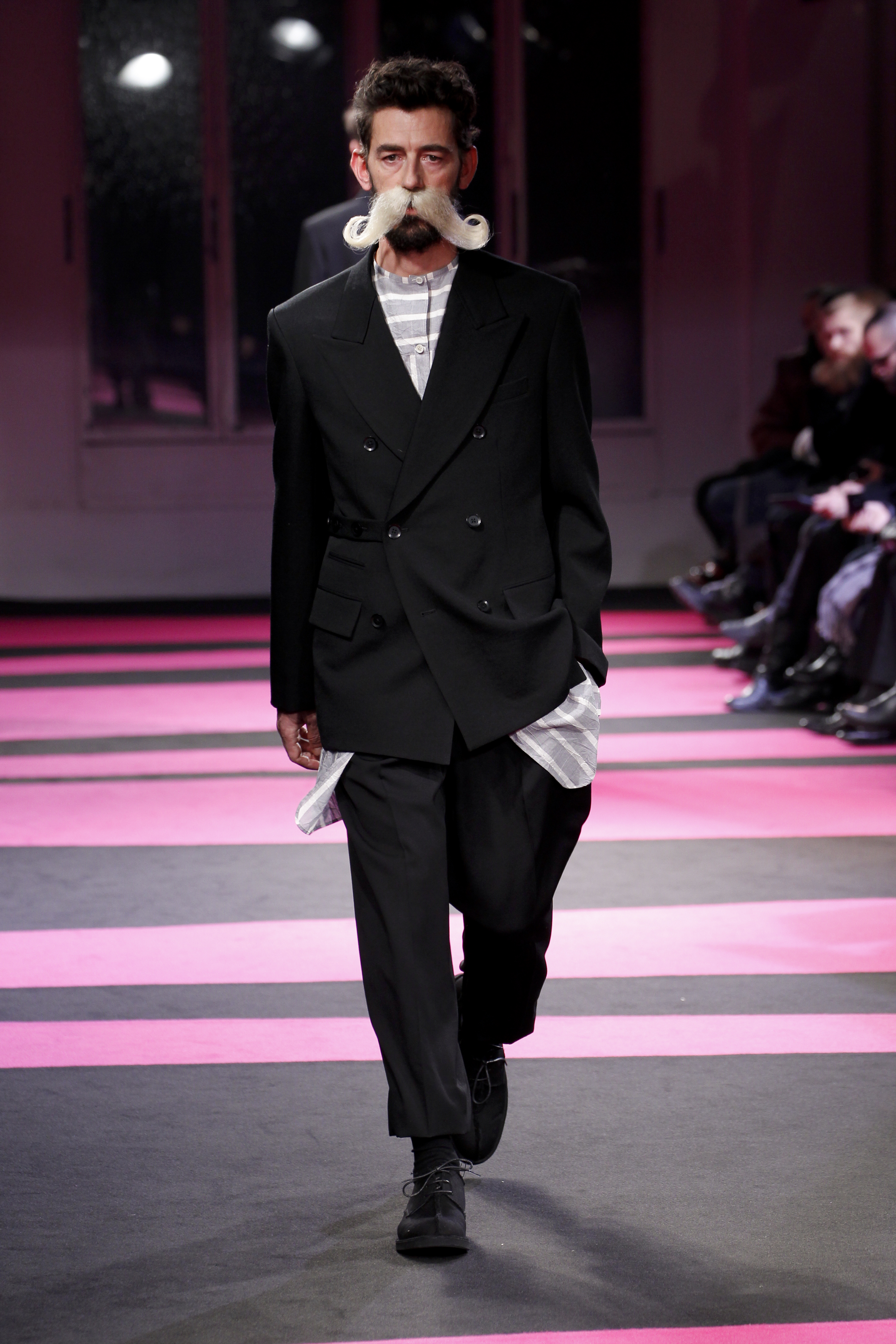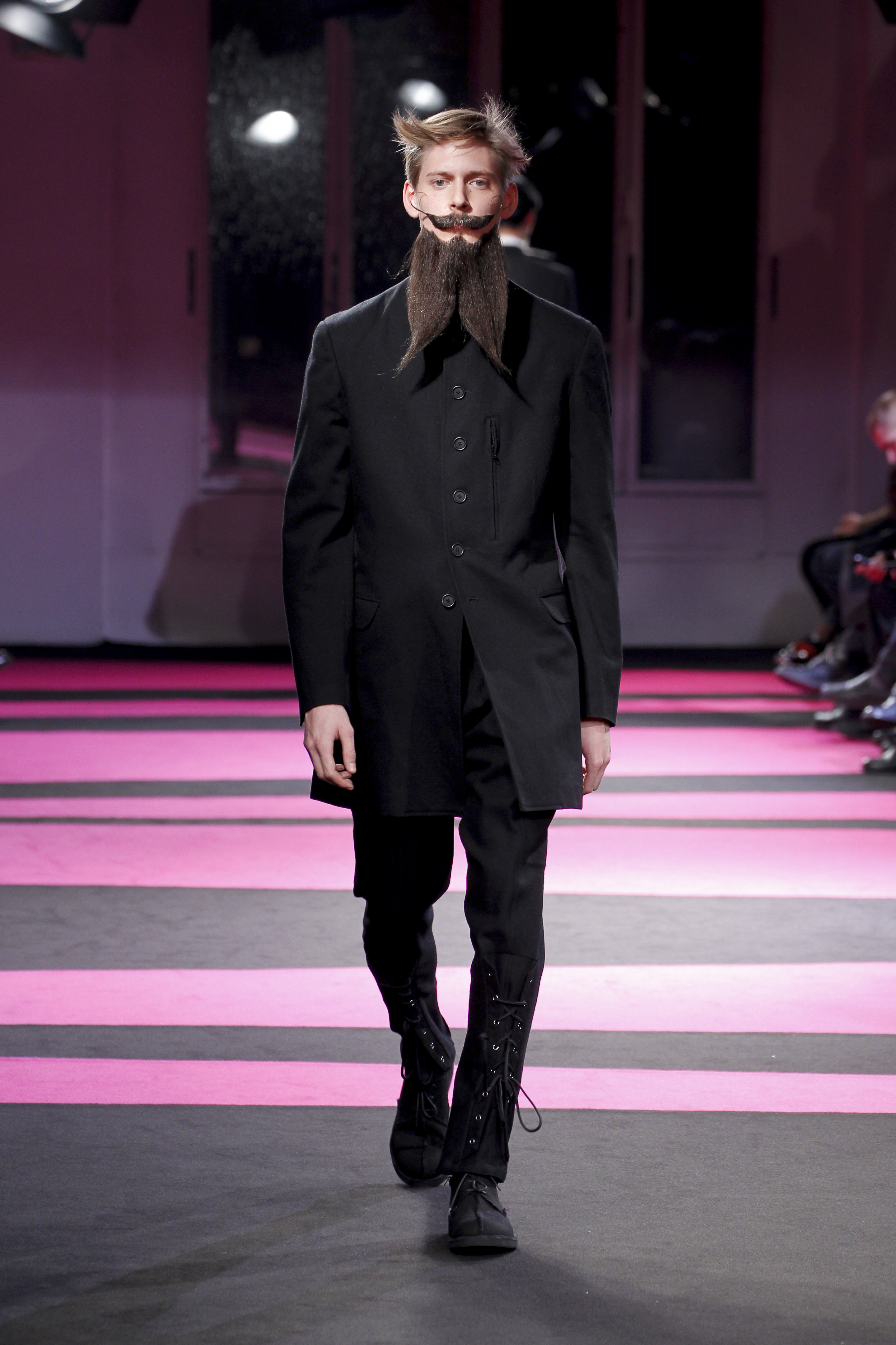 Yohji Yamamoto, the genius Japanese designer we’ve already told you about, has struck again (!). Not content with presenting collections that outdo each other in technicality, this season Yohji Yamamoto once again chose to surprise and disguise his models by affixing facial hairpieces, giving a very traditional look to the models’ faces (Adrien Sahores was also there).