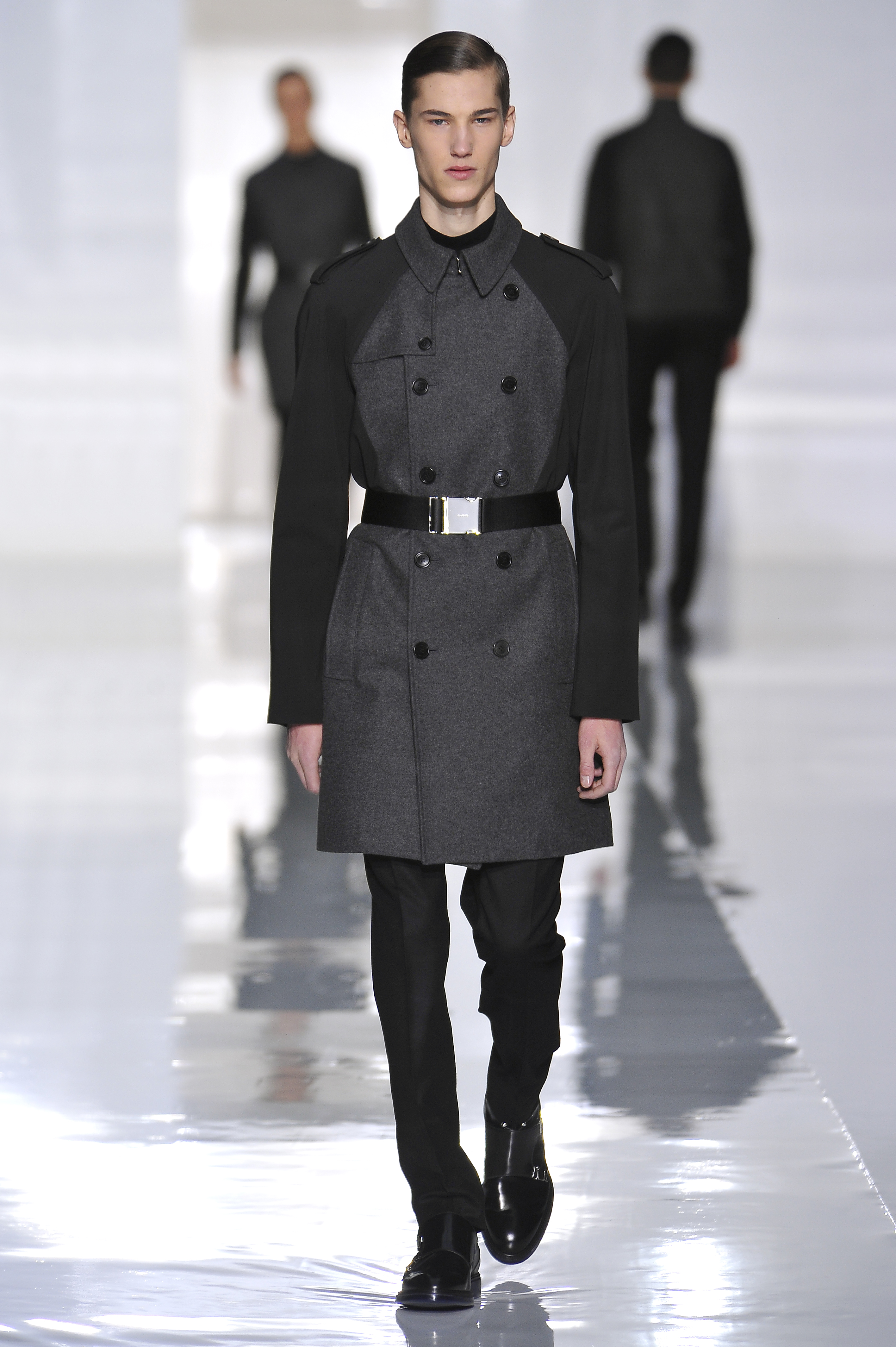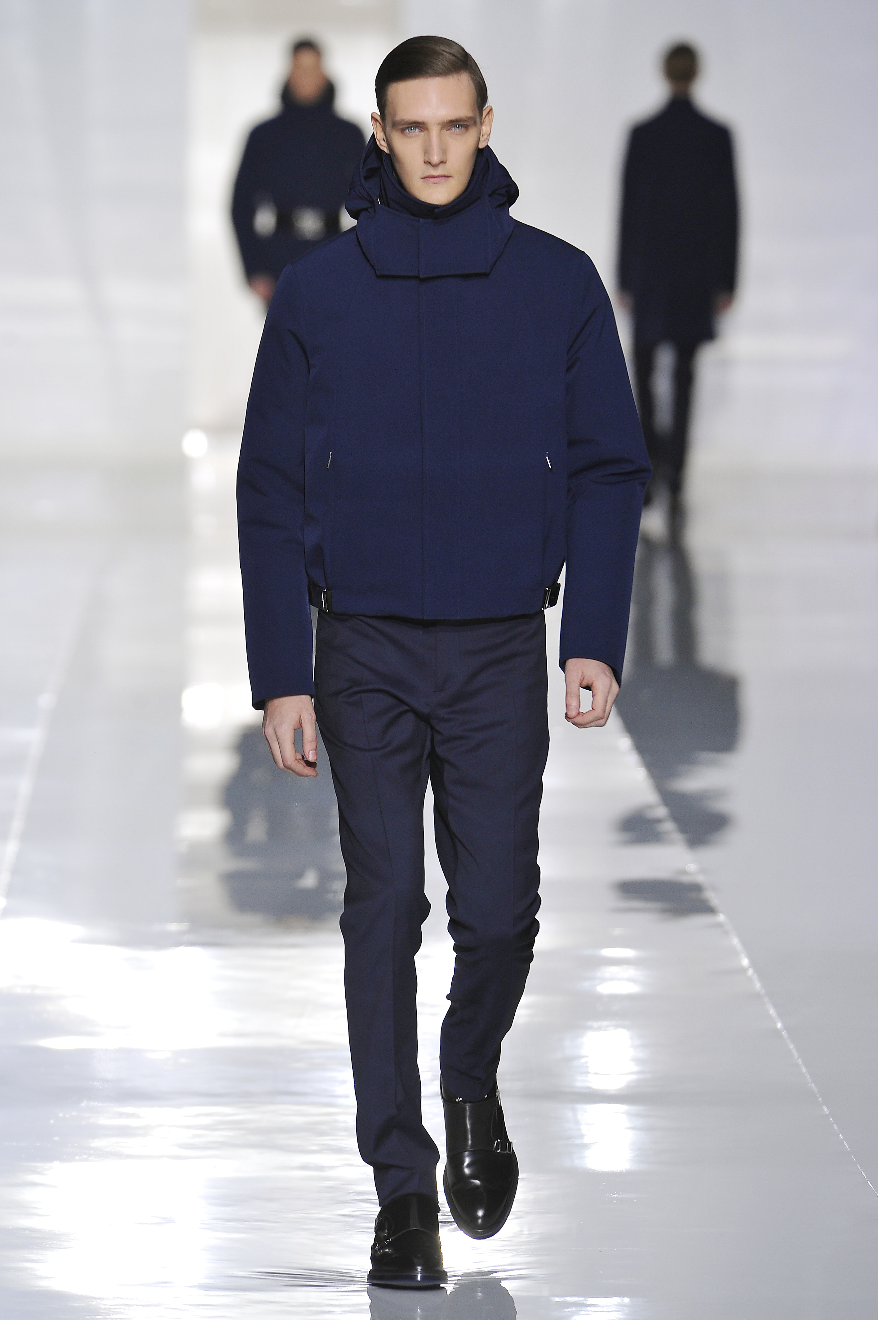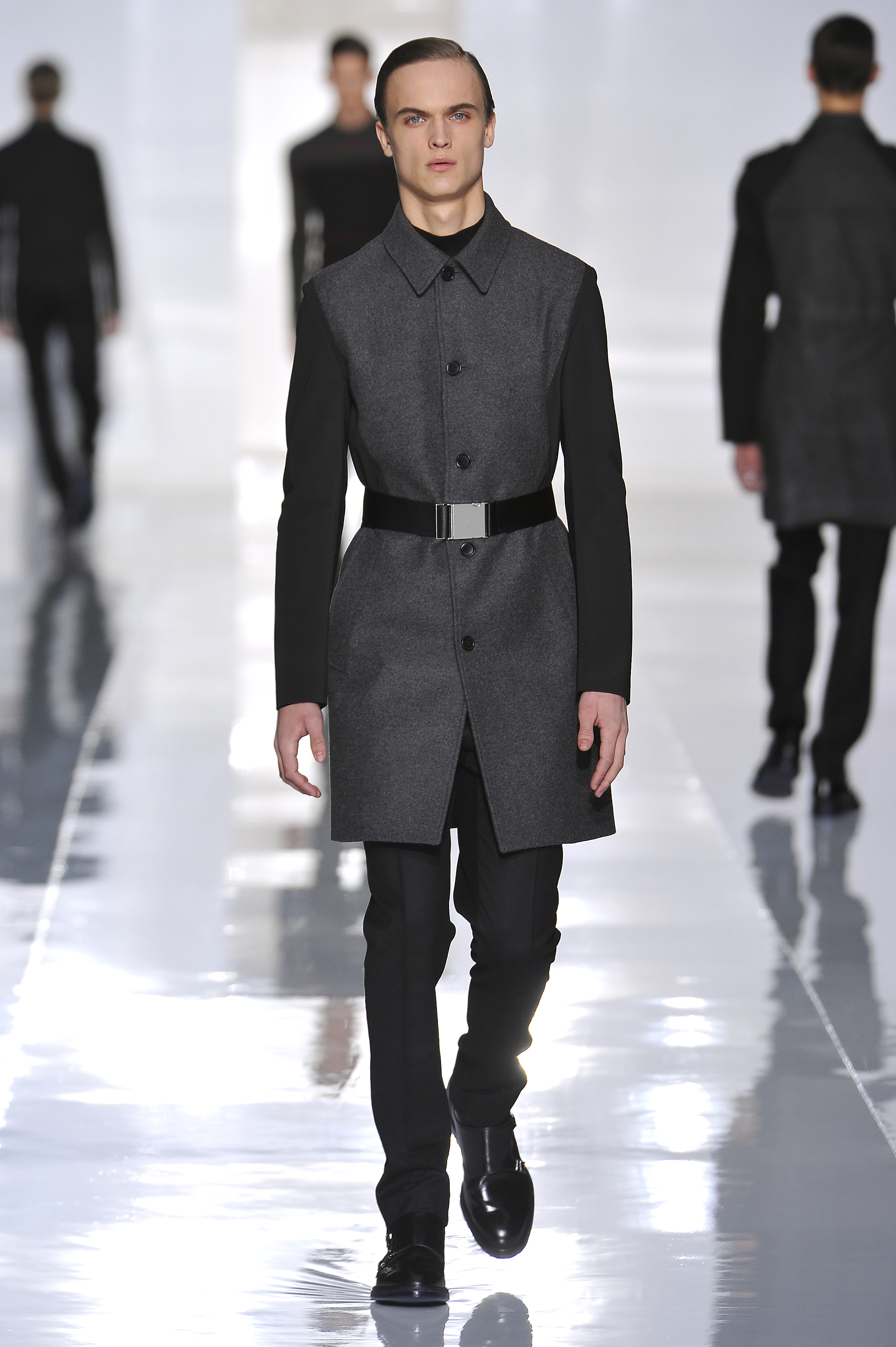 Shades of gray quickly mingle with black, reinforcing Kris Van Assche’s signature geometric, clean-cut look. Later, navy blue and white also make their entrance.