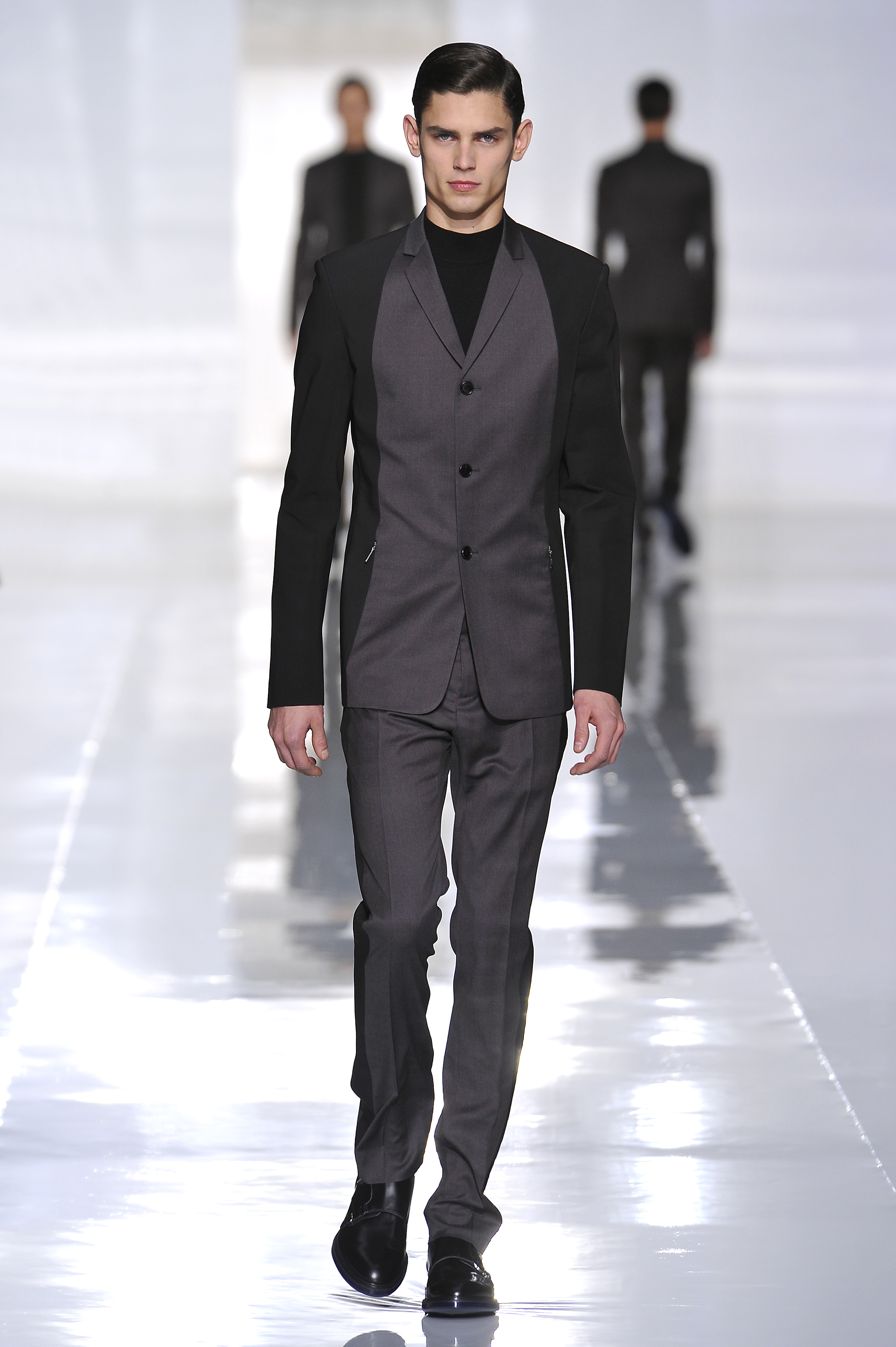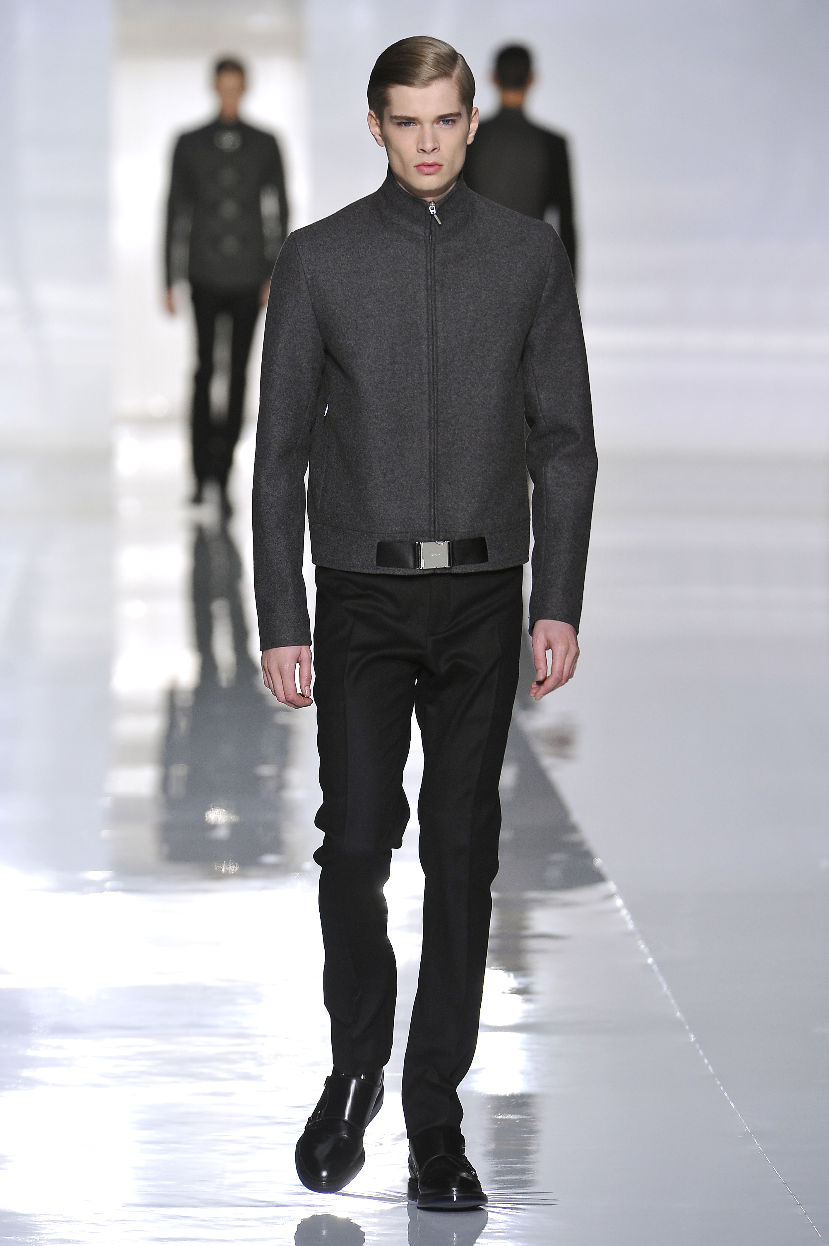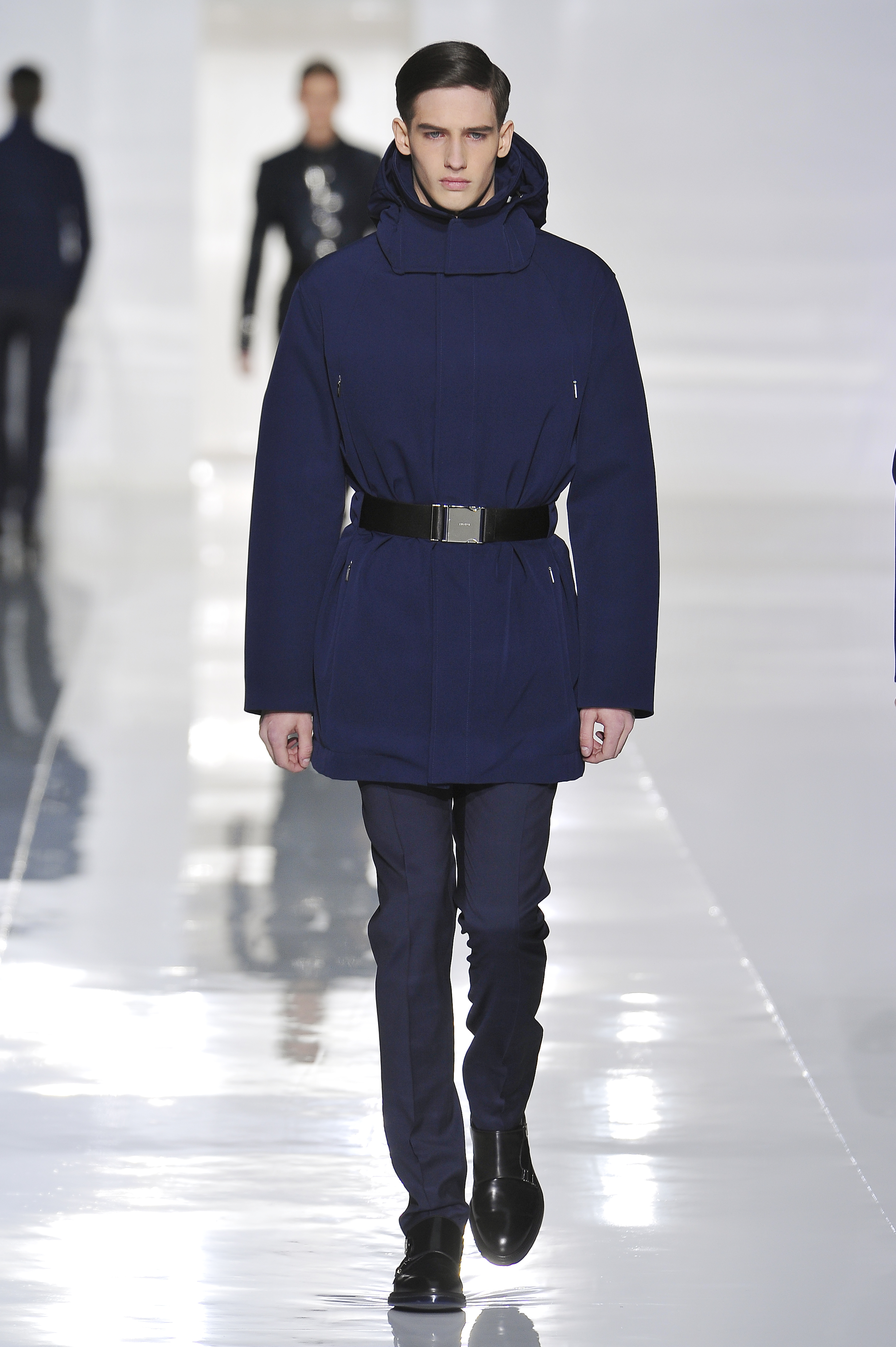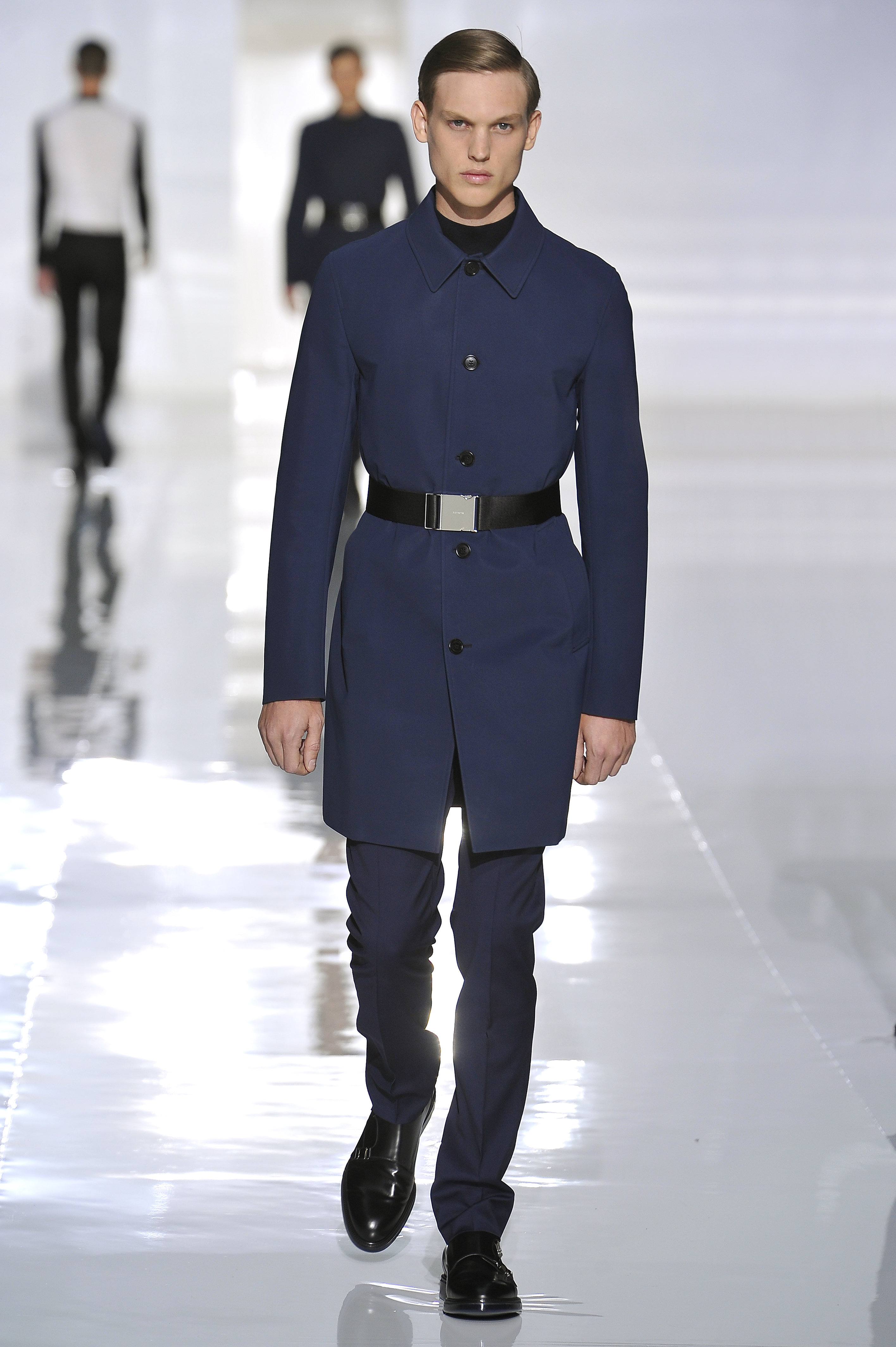 Shades of gray quickly mingle with black, reinforcing Kris Van Assche’s signature geometric, clean-cut look. Later, navy blue and white also make their entrance.