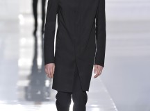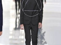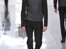 Teintes de gris viennent rapidement se mélanger au noir et renforcent l’aspect géométrique et bien coupé des vêtements, signature de Kris Van Assche. Plus tard, le bleu marine ainsi que le blanc font aussi leur entrée.