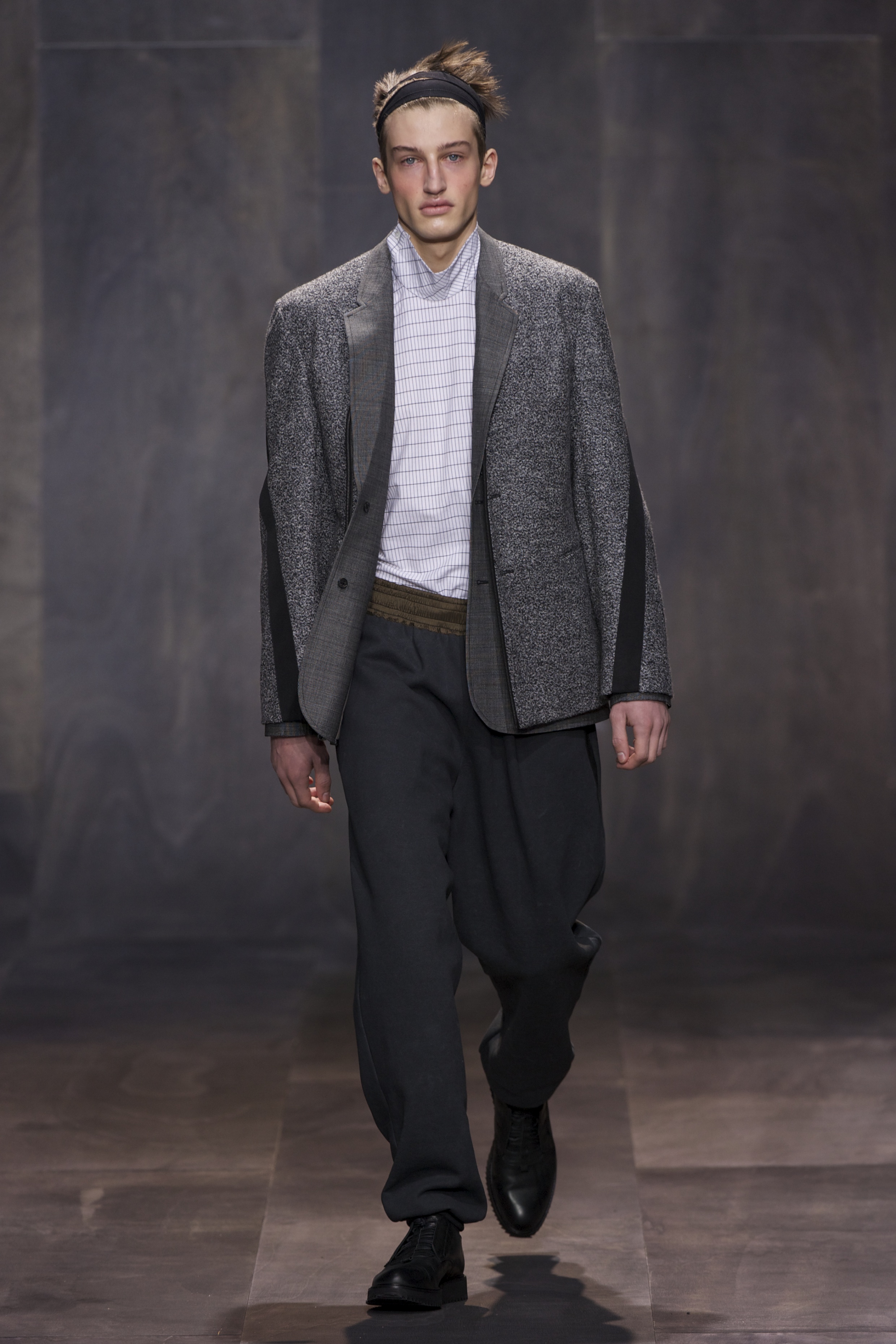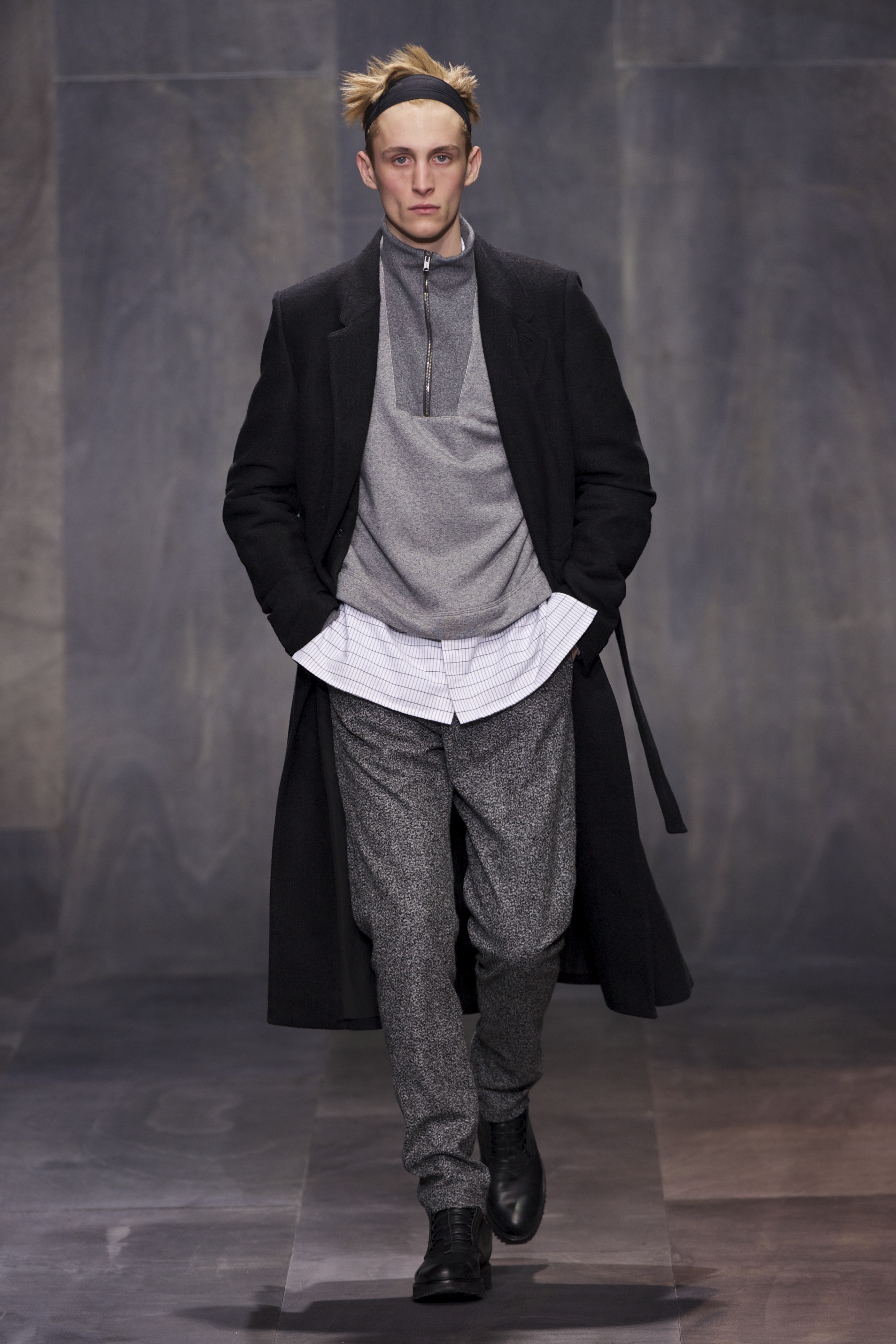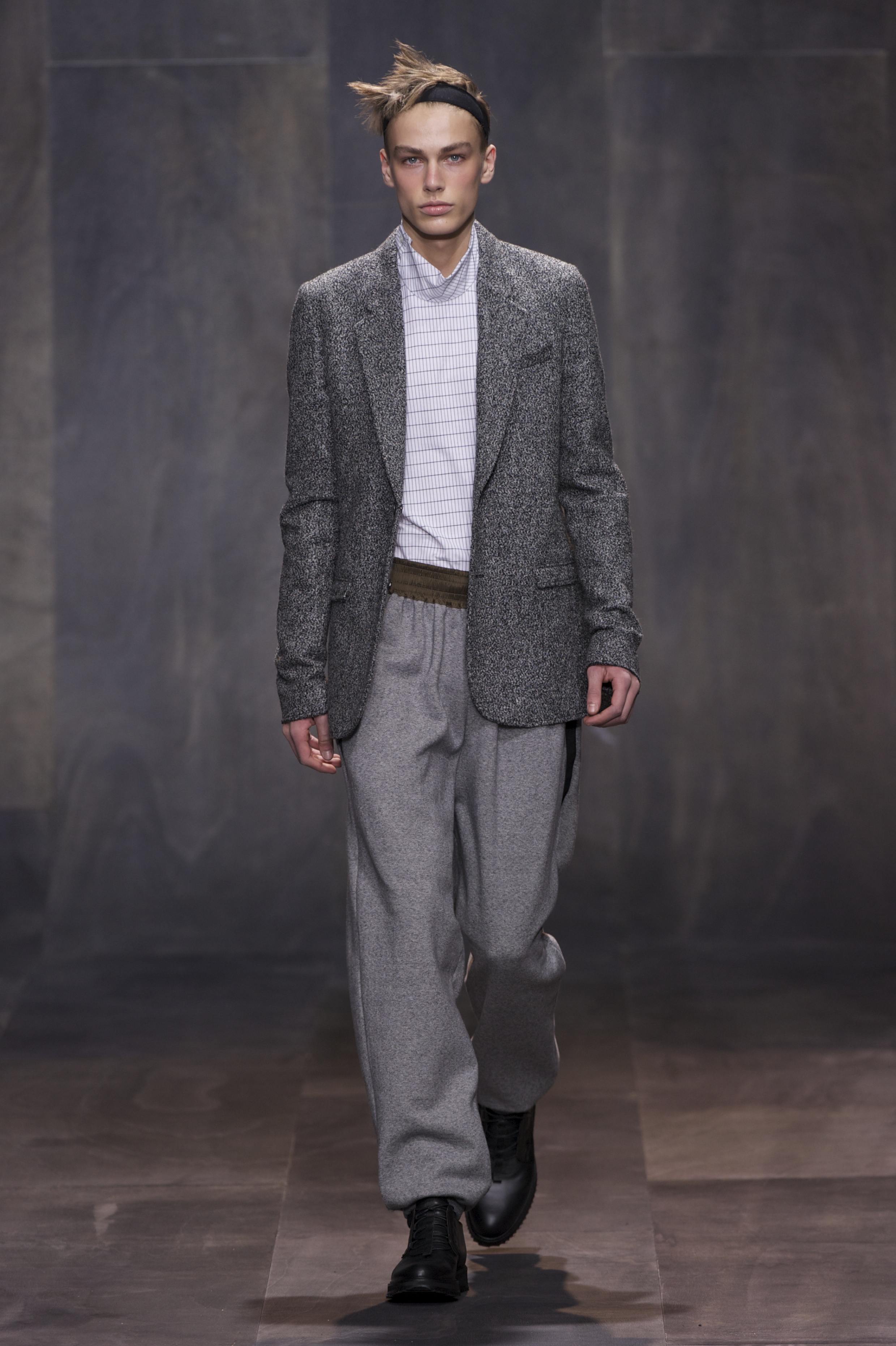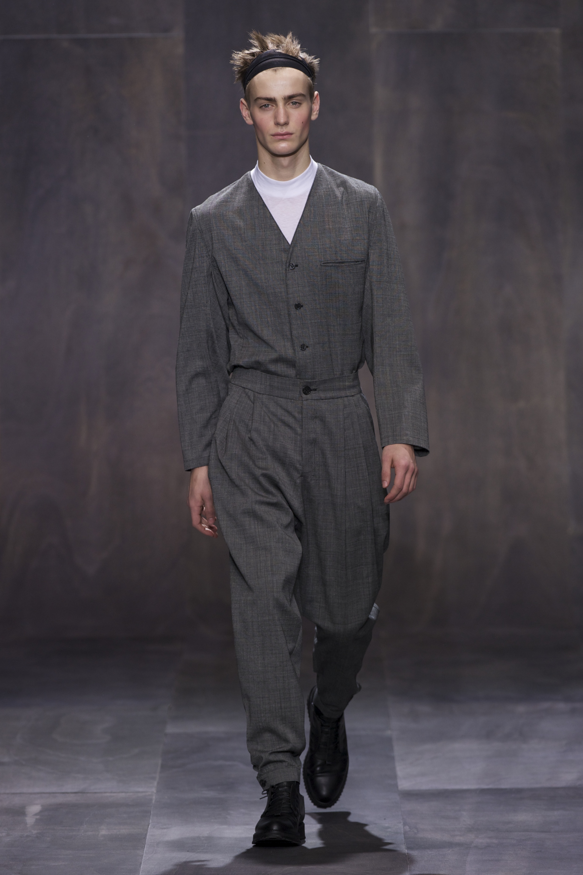 Le gris, couleur dominante chez Damir Doma, il se retrouve sur des looks mélangeant les volumes, griffe du créateur, et des vêtements plus près du corps.