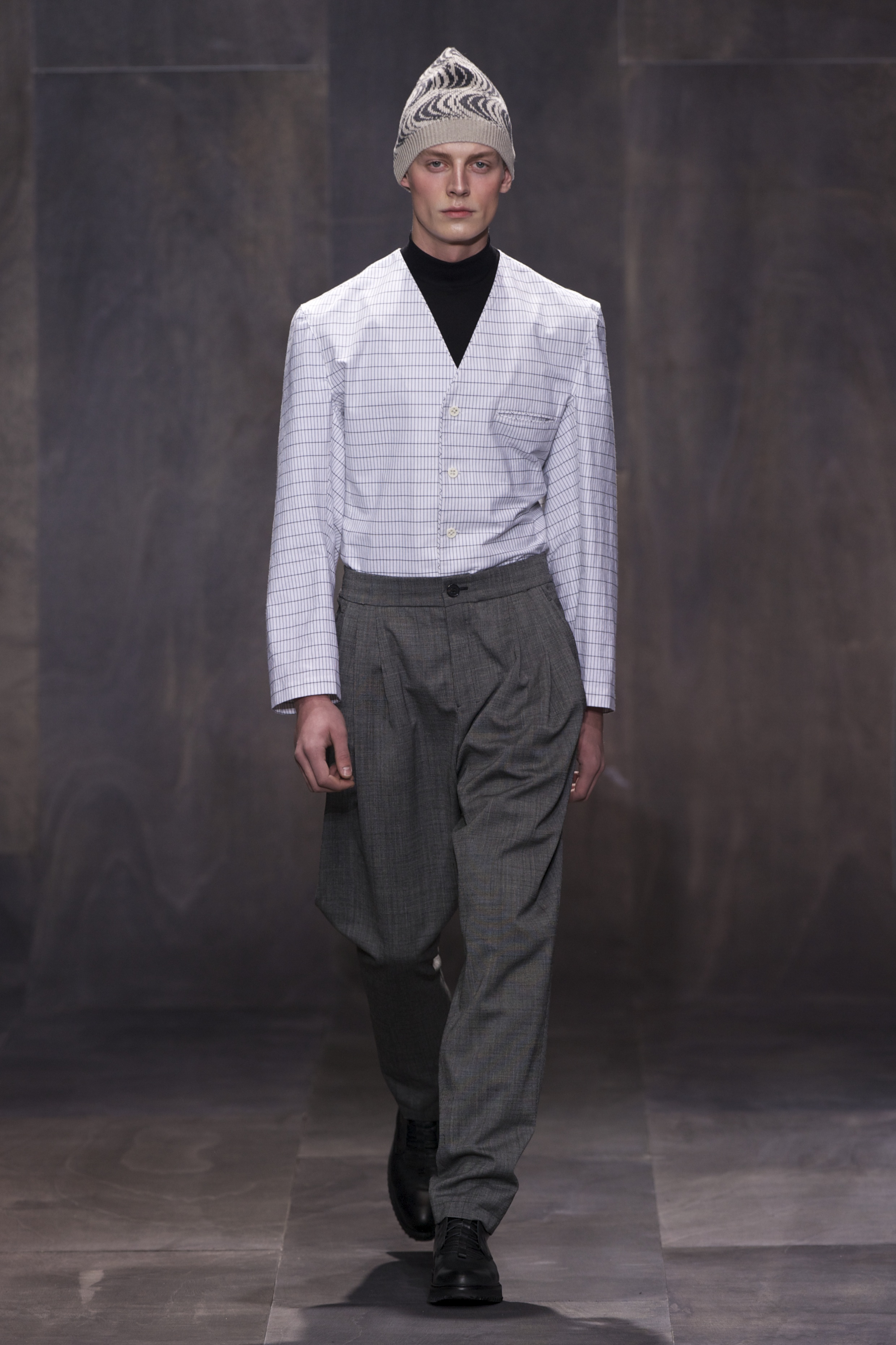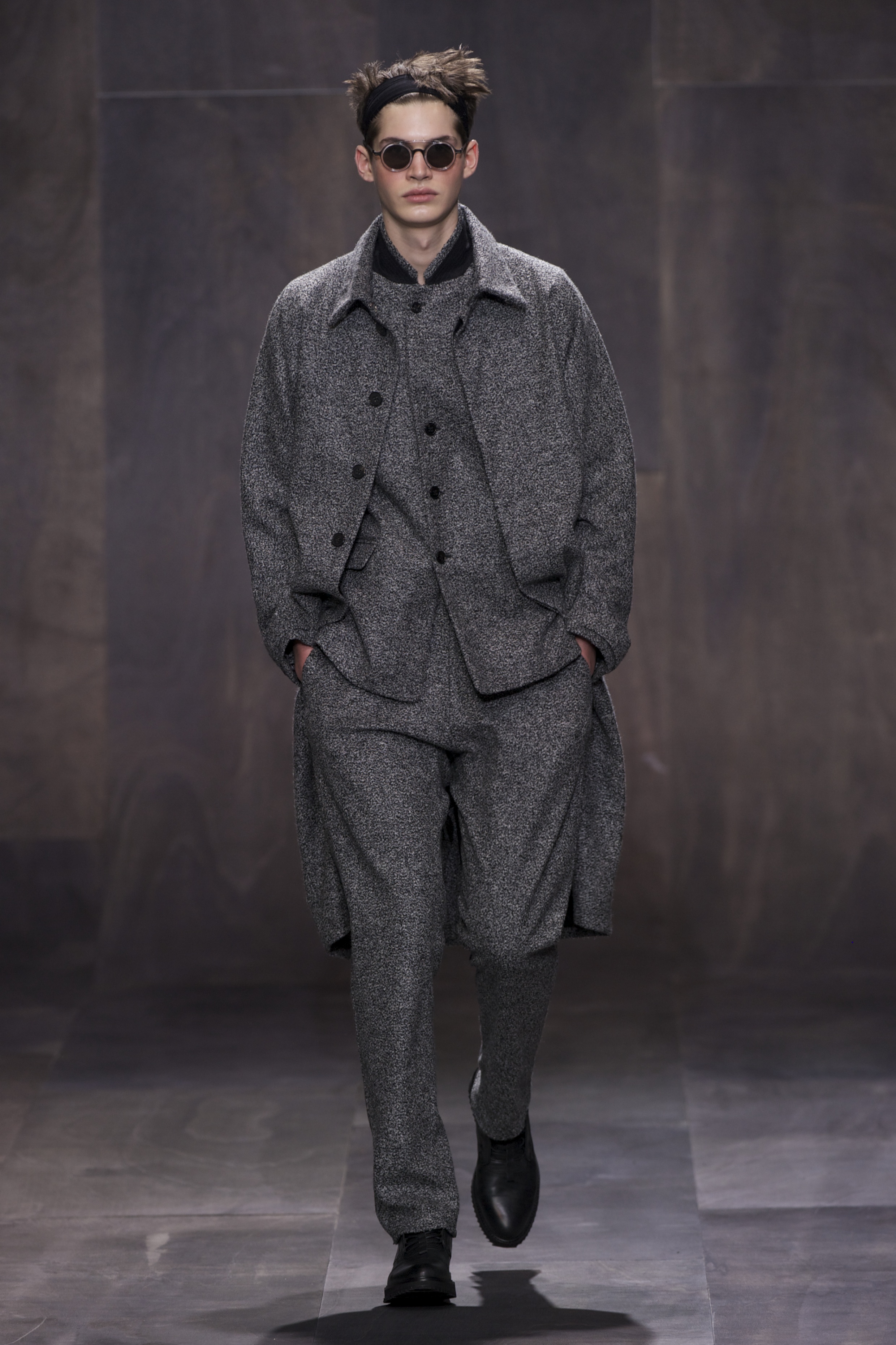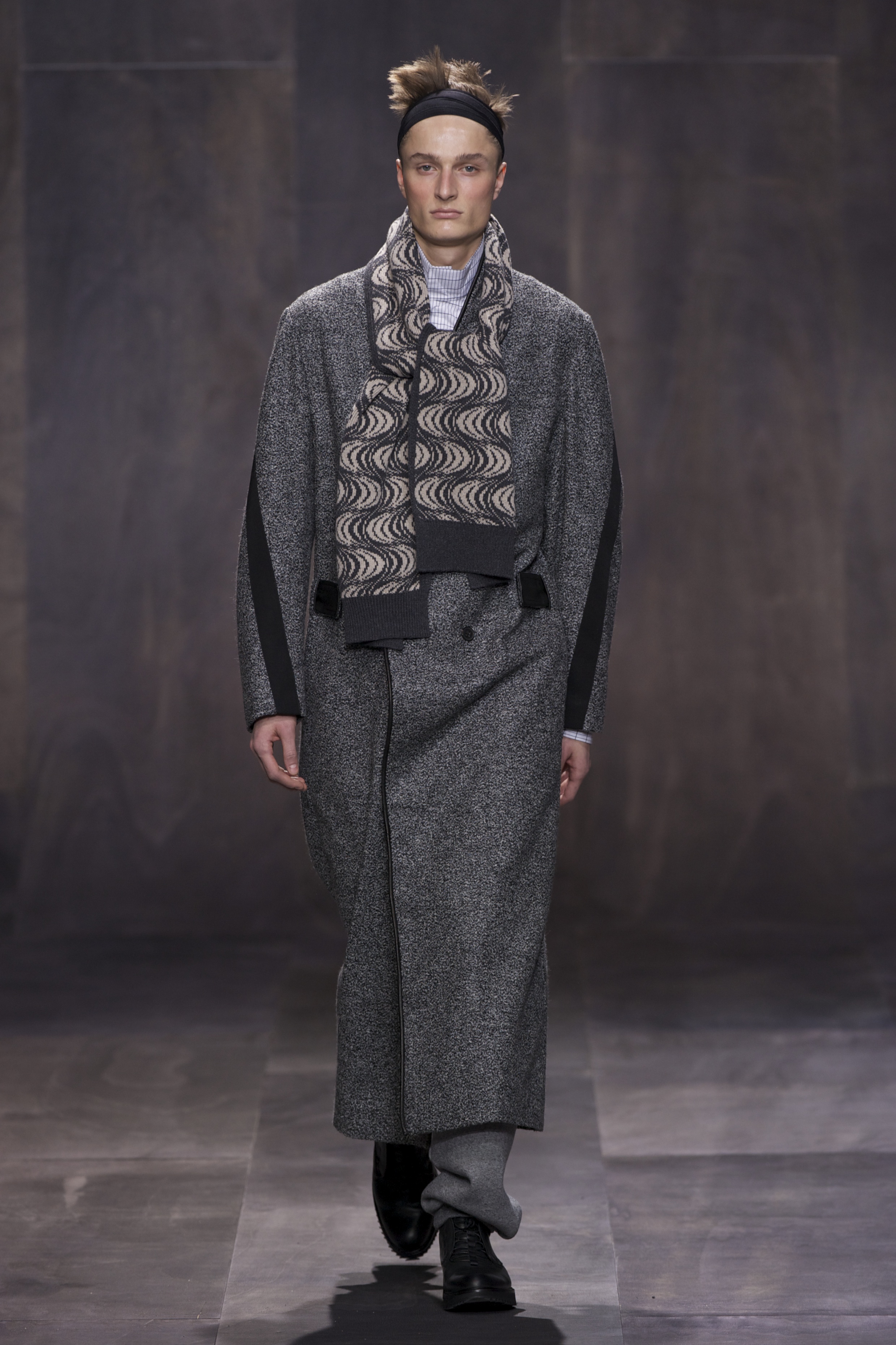 Le gris, couleur dominante chez Damir Doma, il se retrouve sur des looks mélangeant les volumes, griffe du créateur, et des vêtements plus près du corps.