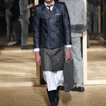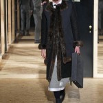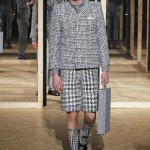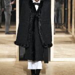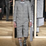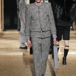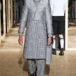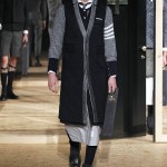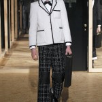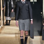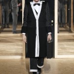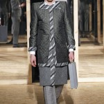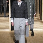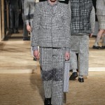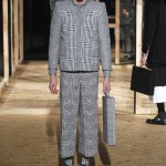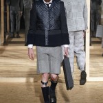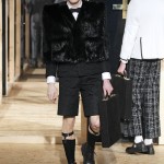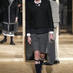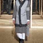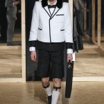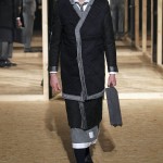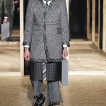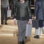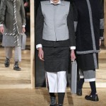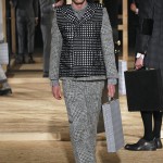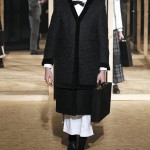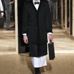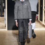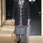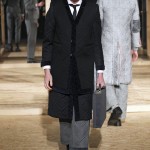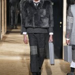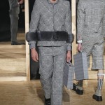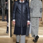 Les manteaux et vestes à col cranté sont réinterprétés géométriquement et les mélanges de matières et de textures sont nombreux chez Thom Browne : cuir, fourrure, laine, tissus matelassés, prince de Galles que l’on trouve sur manteaux, veste de costumes et capes.