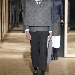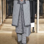 Monochrome et sortie d’une autre époque, l’homme chez Thom Browne met les formes géométriques a l’honneur et on les retrouve partout dans cette collection automne hiver, que ce soit la forme des chapeaux a bords carrés, les épaules et les silhouettes elles aussi dramatiques et carrées ou encore des détails tels que les imprimés ou le motif de la couture sur les vêtements matelasses.