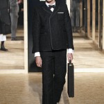 Noir, blanc et différentes teintes de gris pourraient se révéler un choix restreint mais pas chez Thom Browne qui les utilisent de façon intelligente. C’est une revendication en cohésion avec son inspiration et l’ascétisme est ici voulu, désiré.