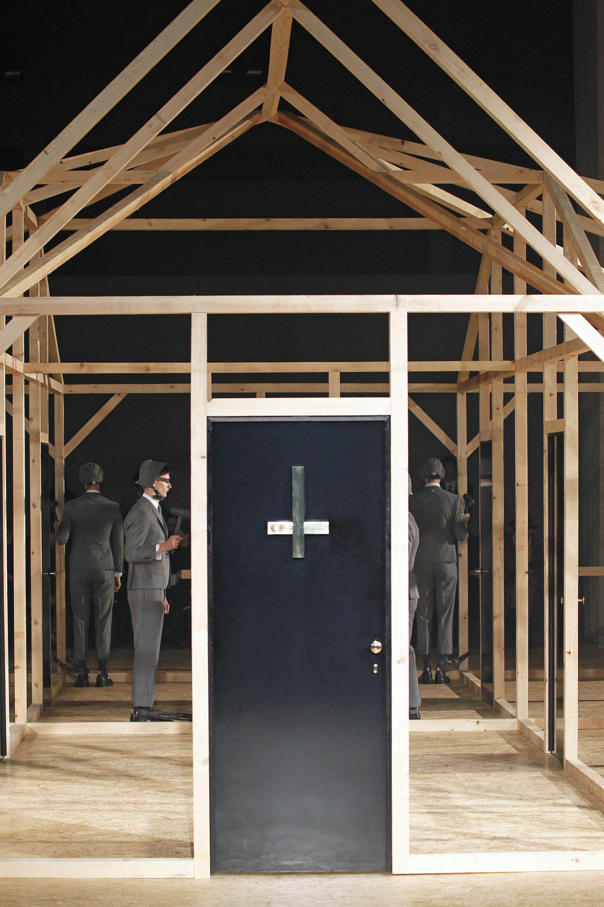 Le défilé, était un peu différent de ce dont on a l’habitude. En lieu et place d’un podium, une structure en bois, s’apparentant à une maison sur laquelle des mannequins martelaient et ce, des l’arrivée des invités, trônaient au milieu du Club de Tennis de Paris. Quant au défilé en lui même, il s’agissait en fait des mannequins traversant les différentes pièces de la maison de façon totalement synchronisée. L’effet visuel était assez surprenant et on n’ose pas imaginer la préparation que cela a du demander.