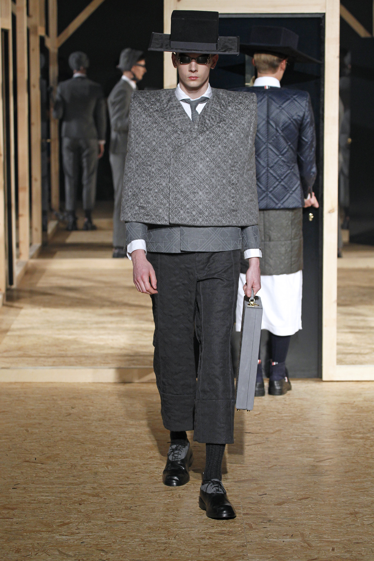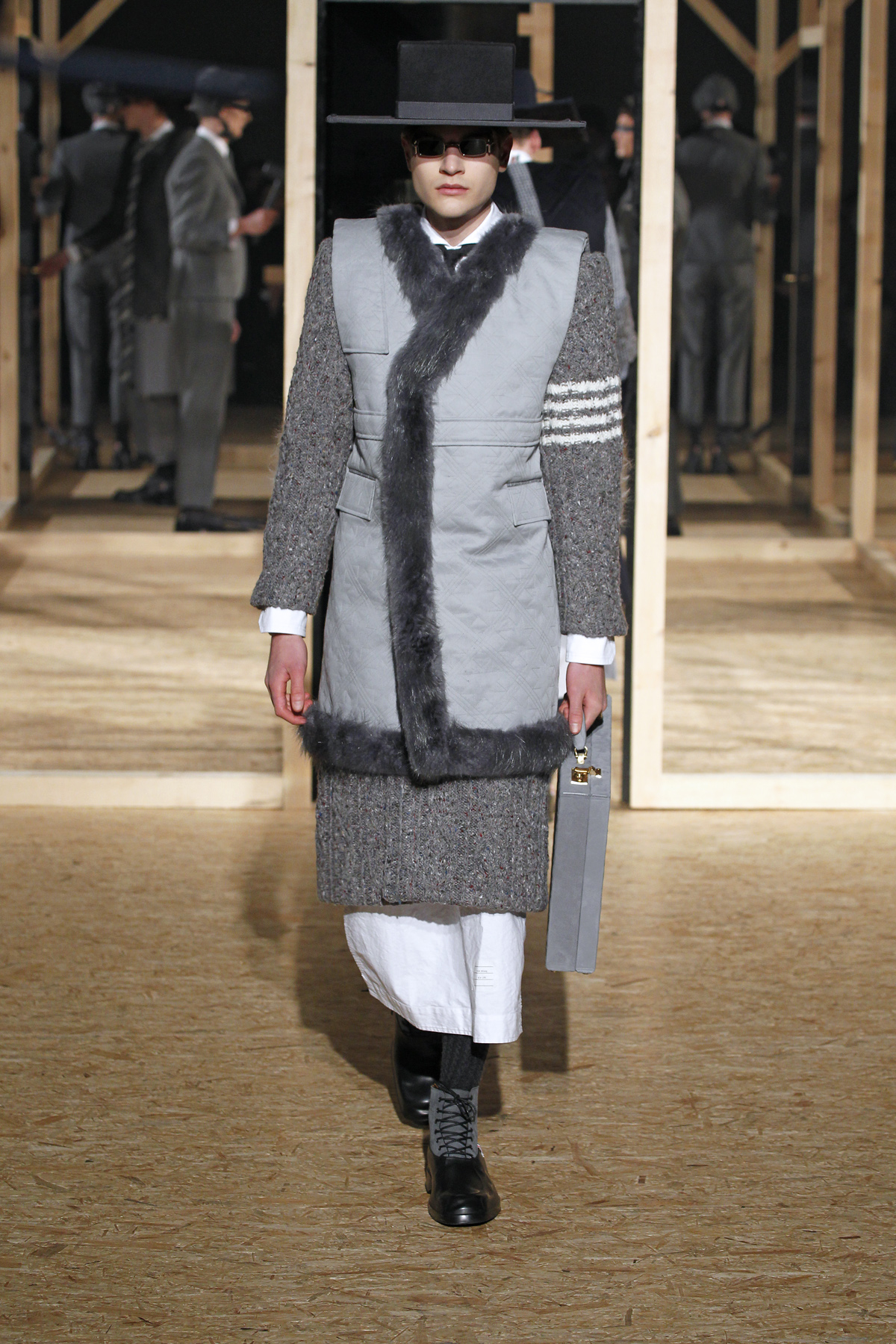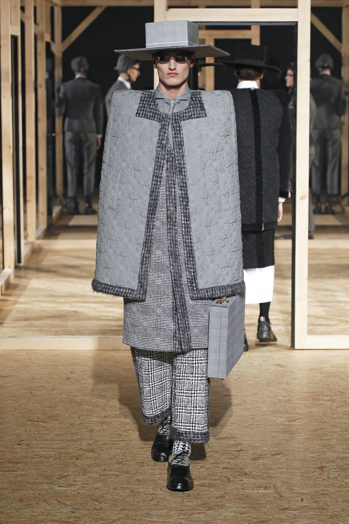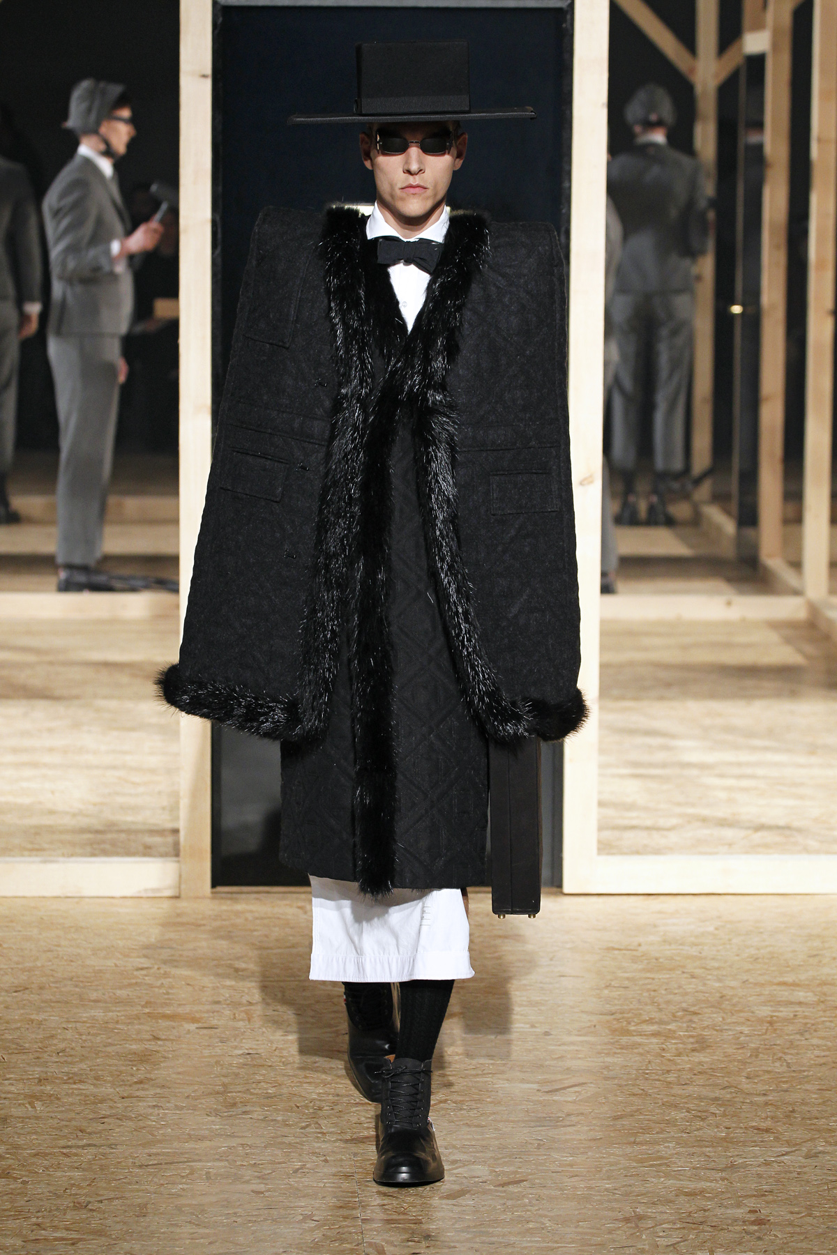 Les manteaux et vestes à col cranté sont réinterprétés géométriquement et les mélanges de matières et de textures sont nombreux chez Thom Browne : cuir, fourrure, laine, tissus matelassés, prince de Galles que l’on trouve sur manteaux, veste de costumes et capes.