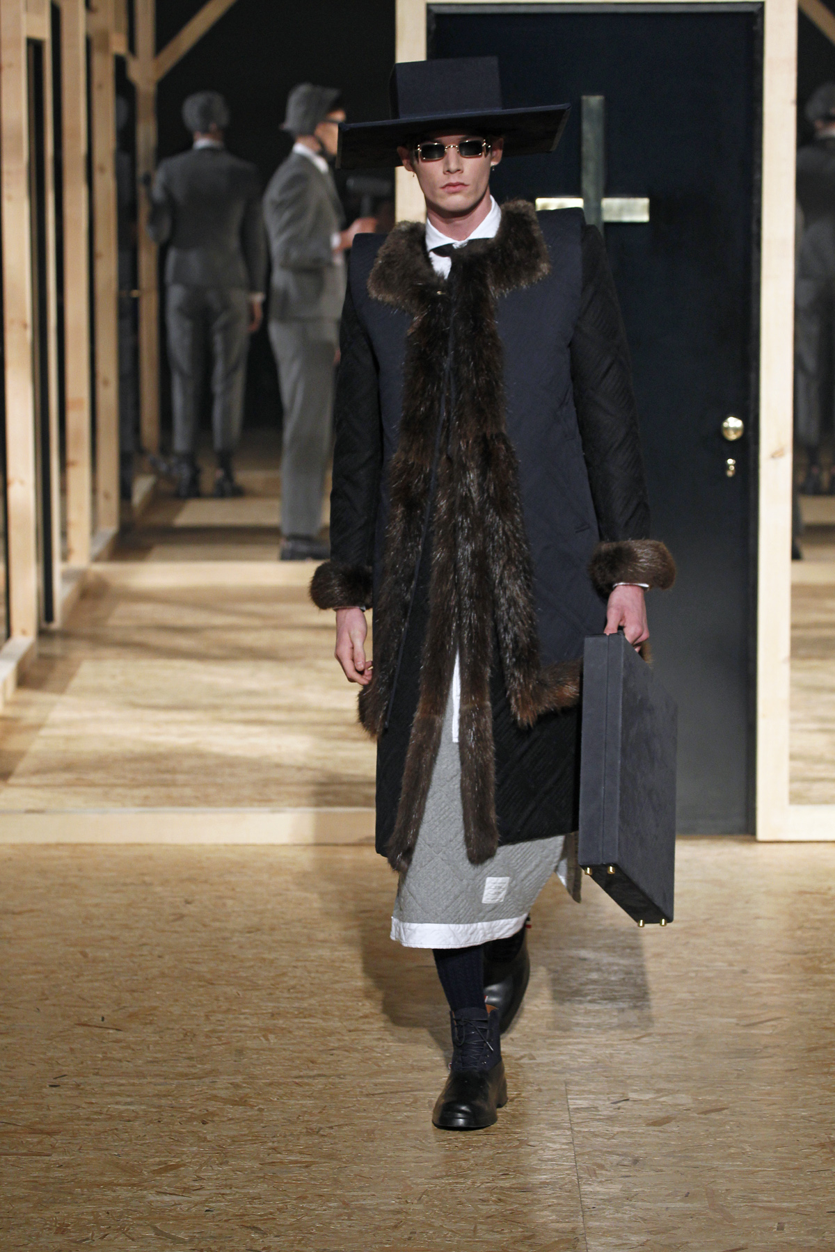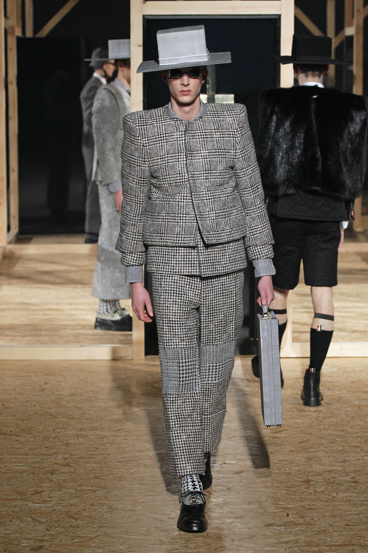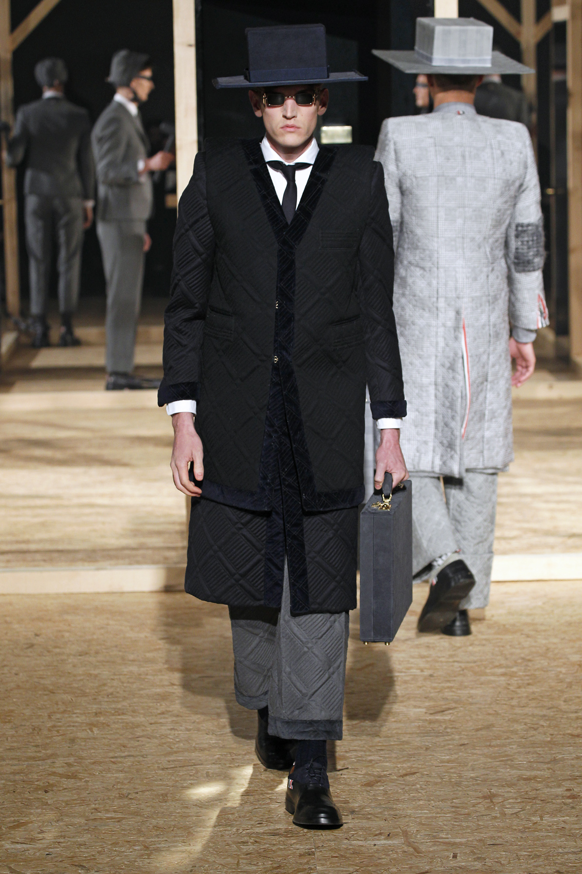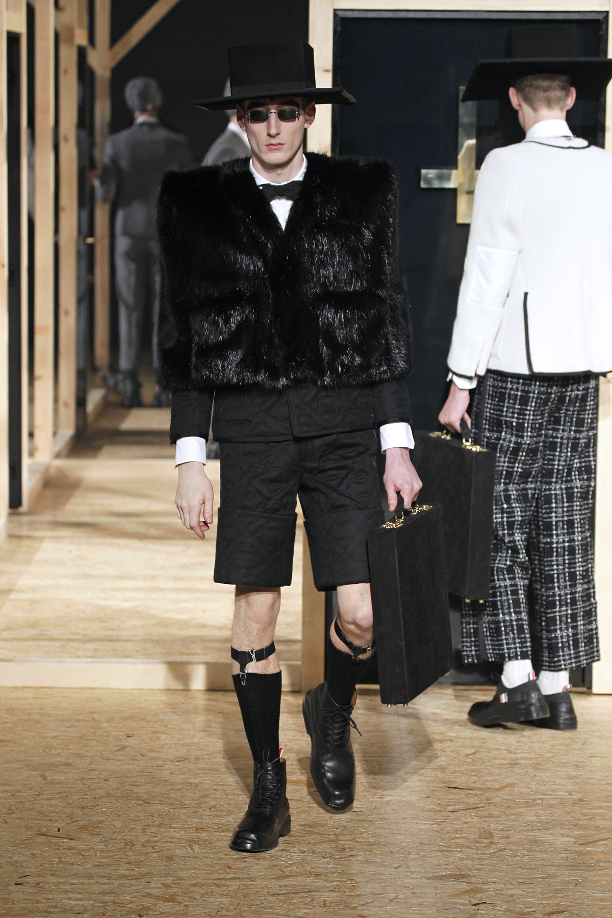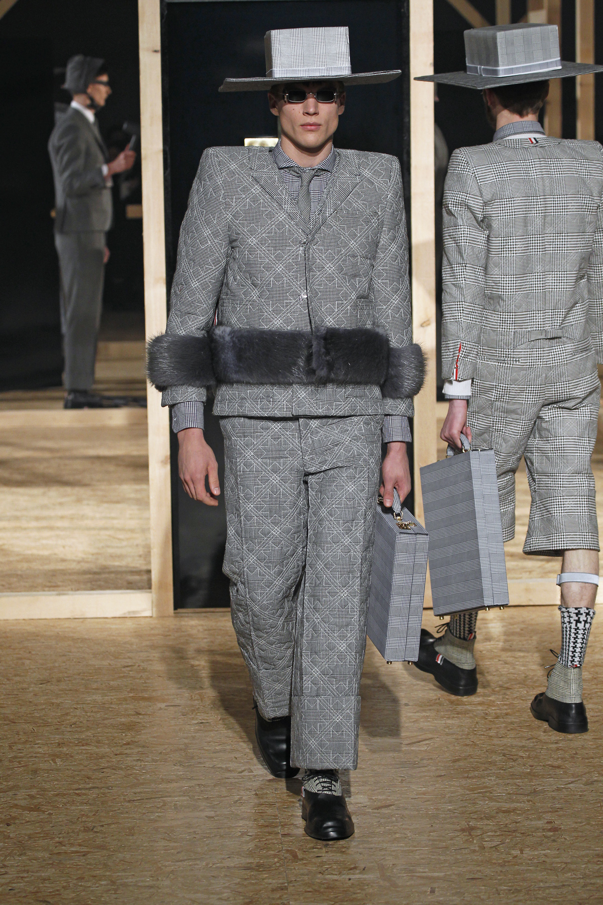 Les manteaux et vestes à col cranté sont réinterprétés géométriquement et les mélanges de matières et de textures sont nombreux chez Thom Browne : cuir, fourrure, laine, tissus matelassés, prince de Galles que l’on trouve sur manteaux, veste de costumes et capes.