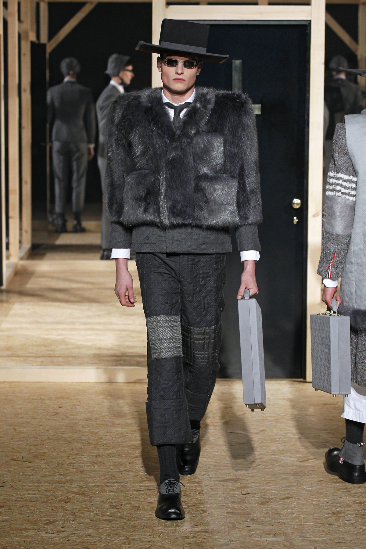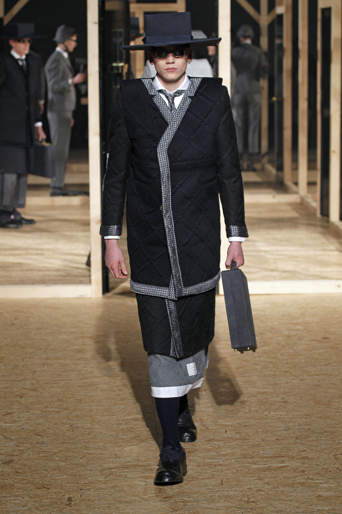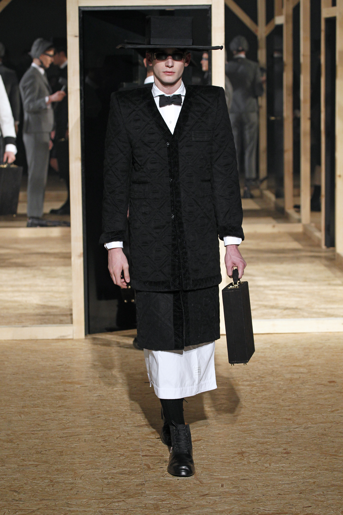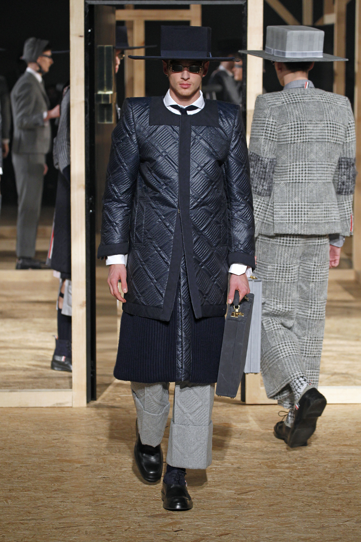 Les manteaux et vestes à col cranté sont réinterprétés géométriquement et les mélanges de matières et de textures sont nombreux chez Thom Browne : cuir, fourrure, laine, tissus matelassés, prince de Galles que l’on trouve sur manteaux, veste de costumes et capes.