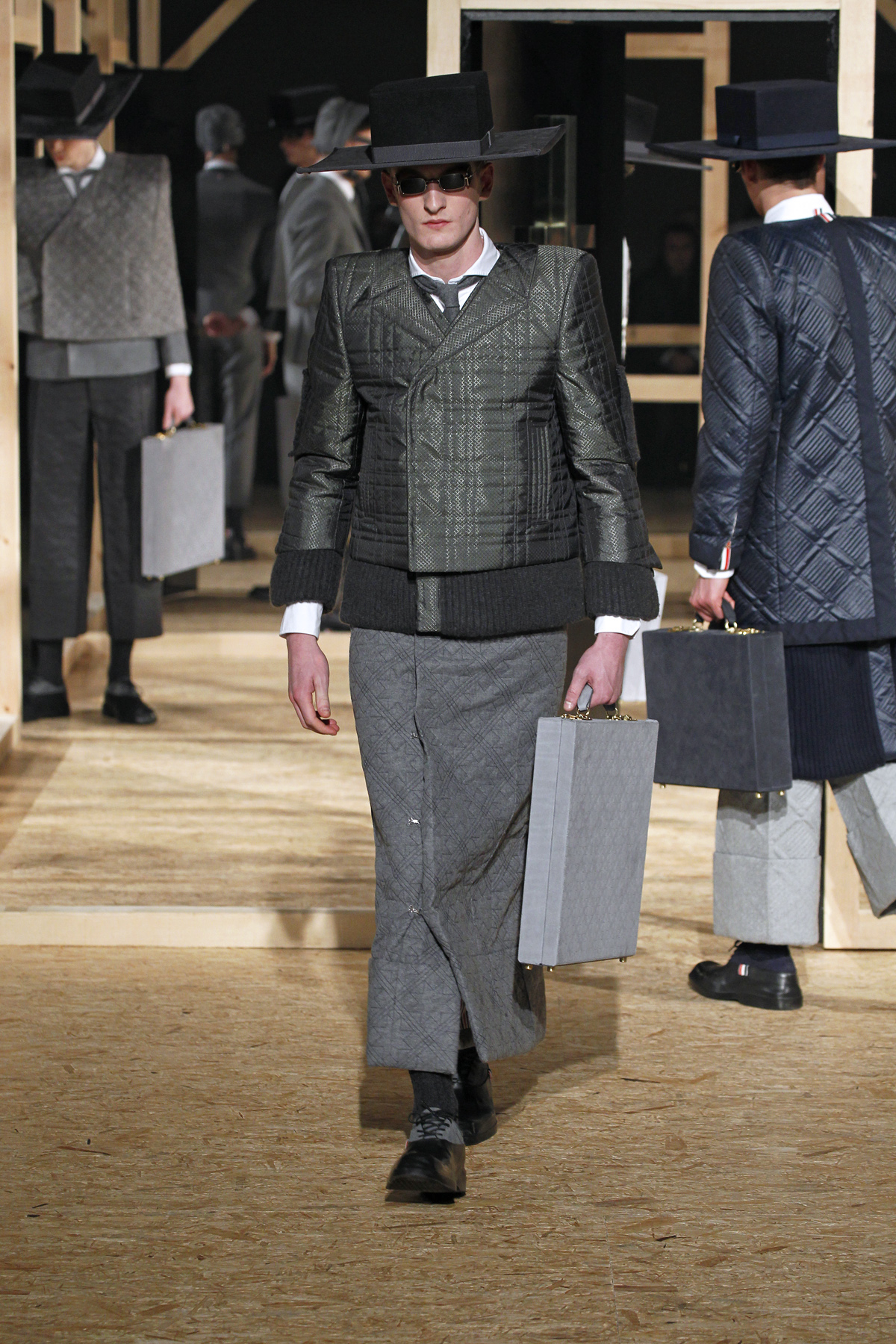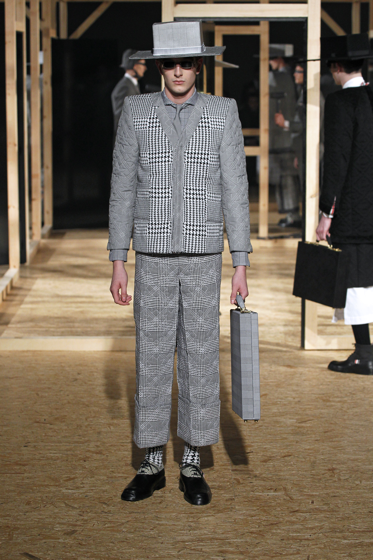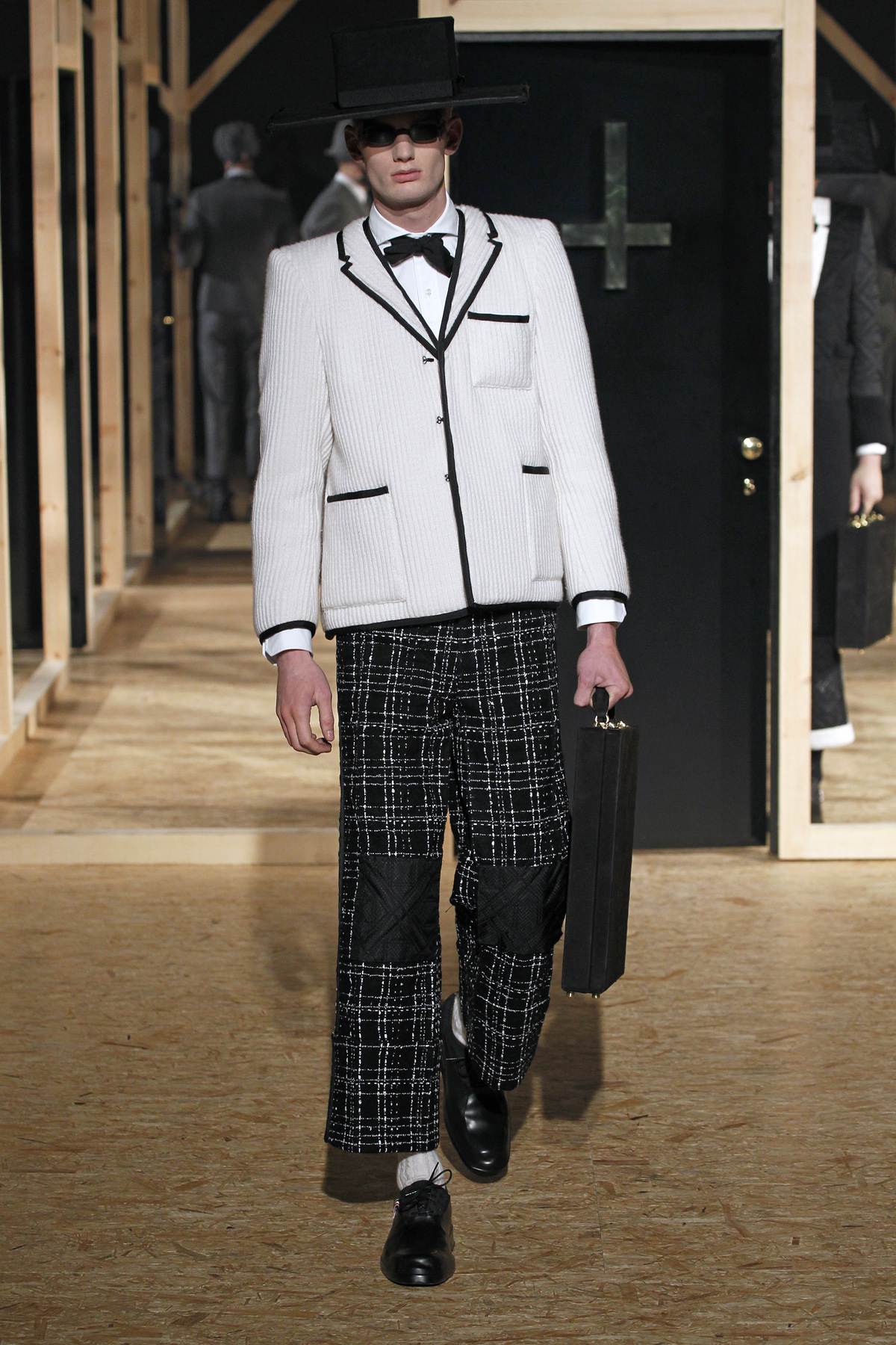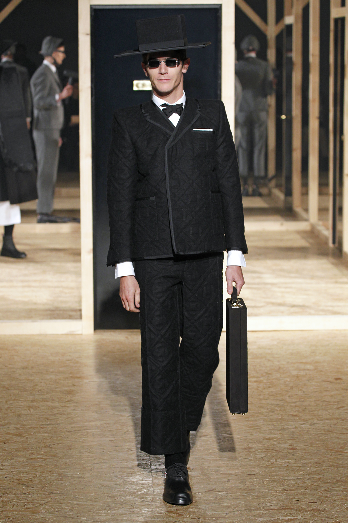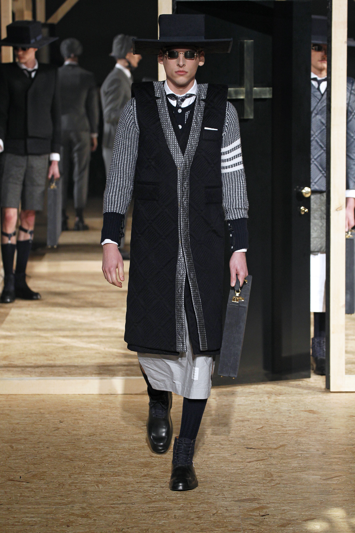 Les manteaux et vestes à col cranté sont réinterprétés géométriquement et les mélanges de matières et de textures sont nombreux chez Thom Browne : cuir, fourrure, laine, tissus matelassés, prince de Galles que l’on trouve sur manteaux, veste de costumes et capes.