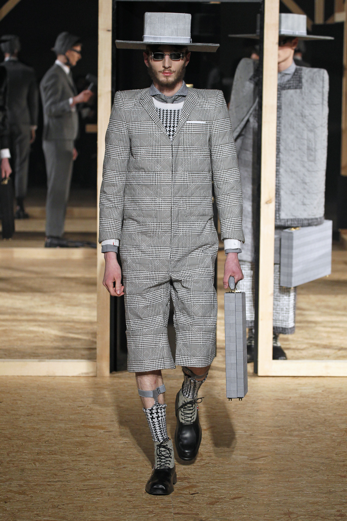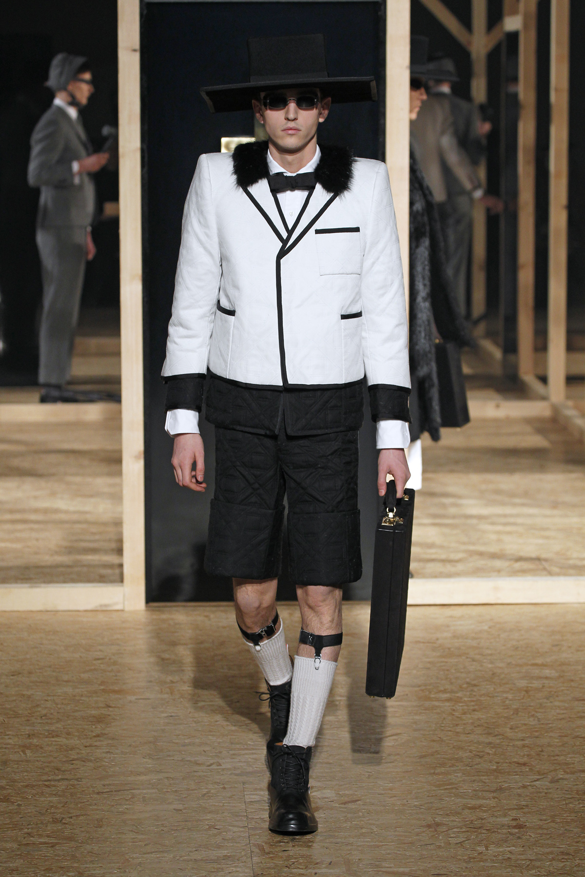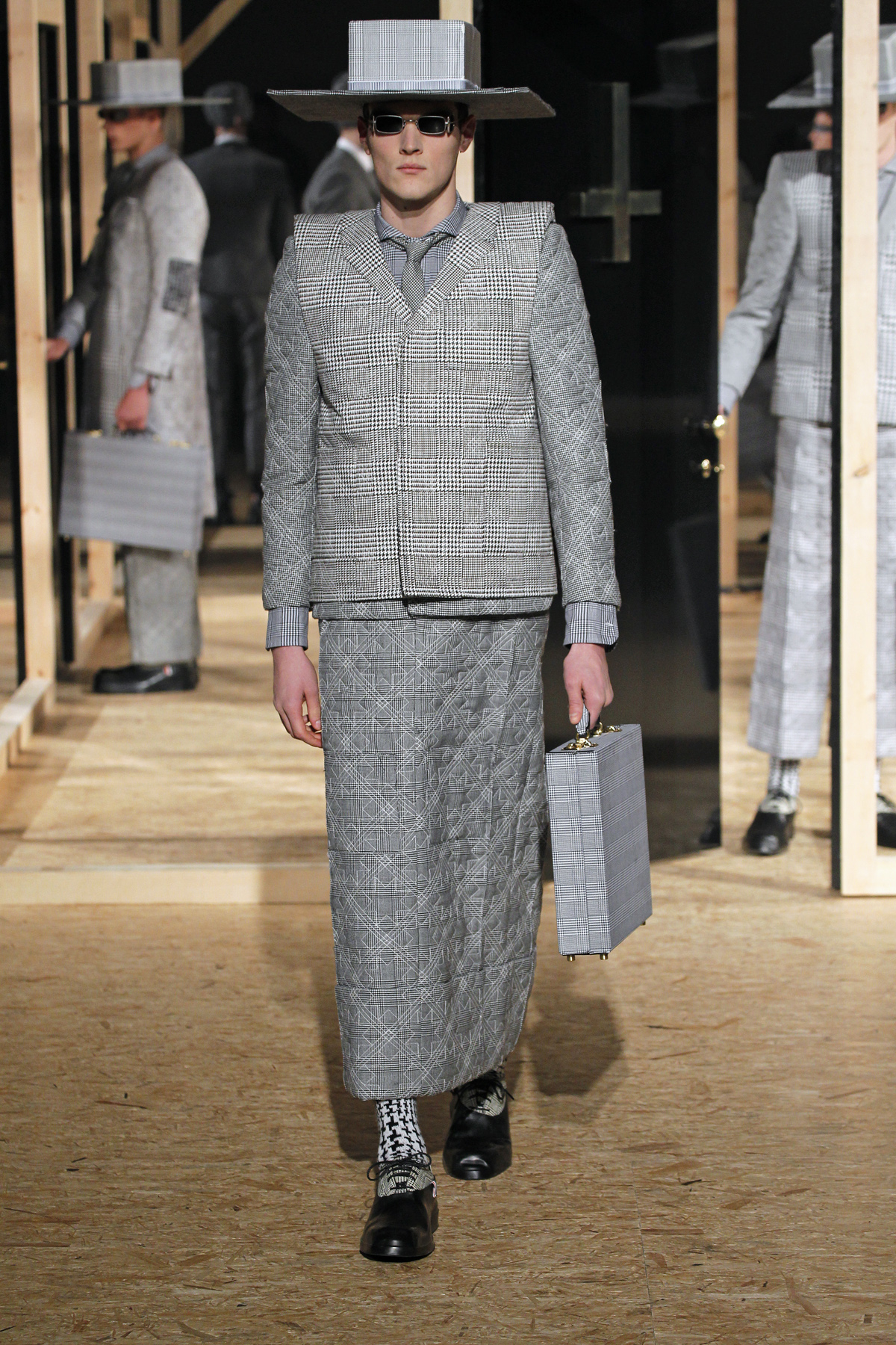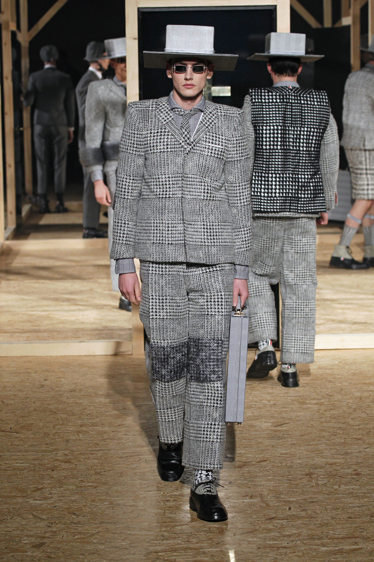 Les manteaux et vestes à col cranté sont réinterprétés géométriquement et les mélanges de matières et de textures sont nombreux chez Thom Browne : cuir, fourrure, laine, tissus matelassés, prince de Galles que l’on trouve sur manteaux, veste de costumes et capes.