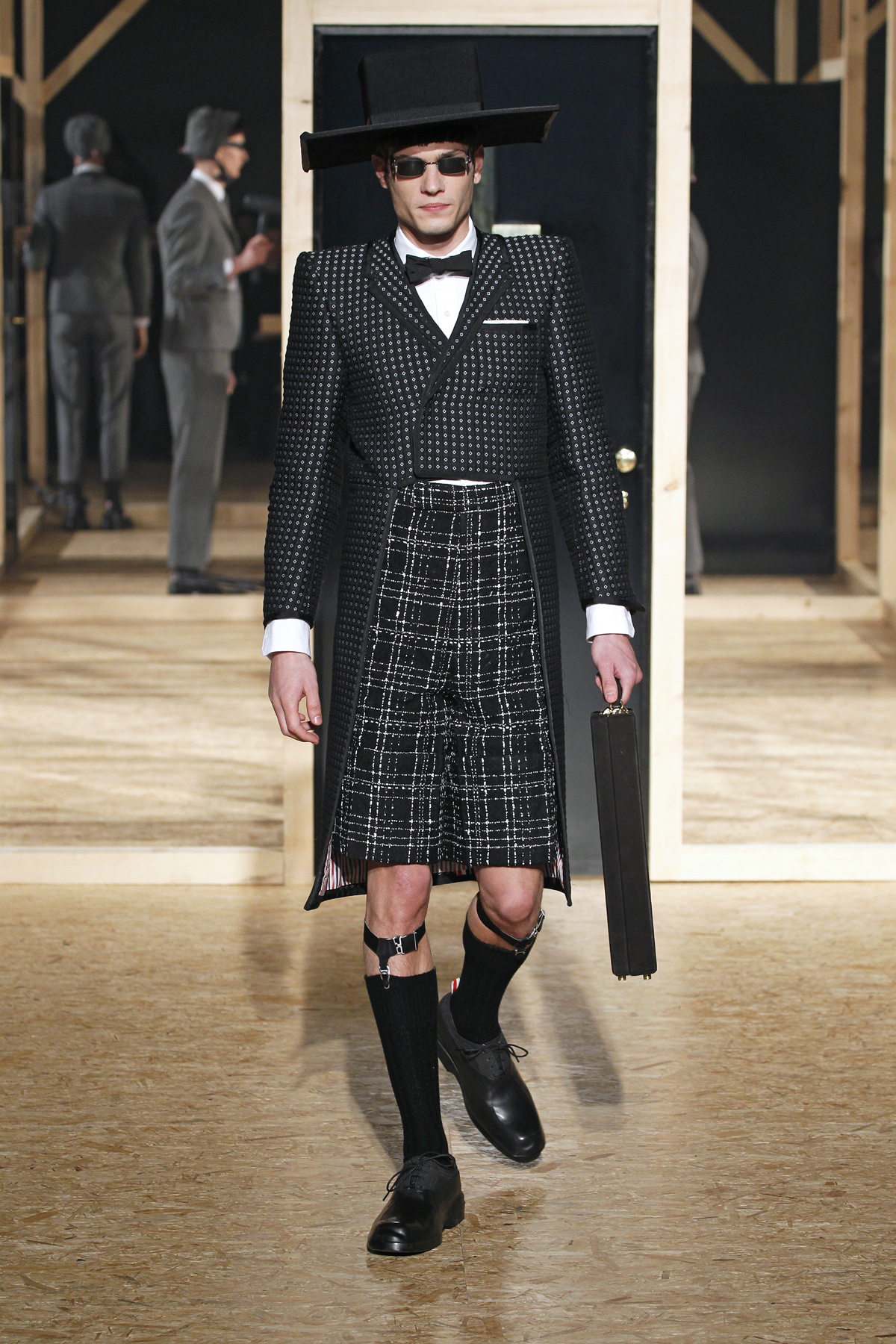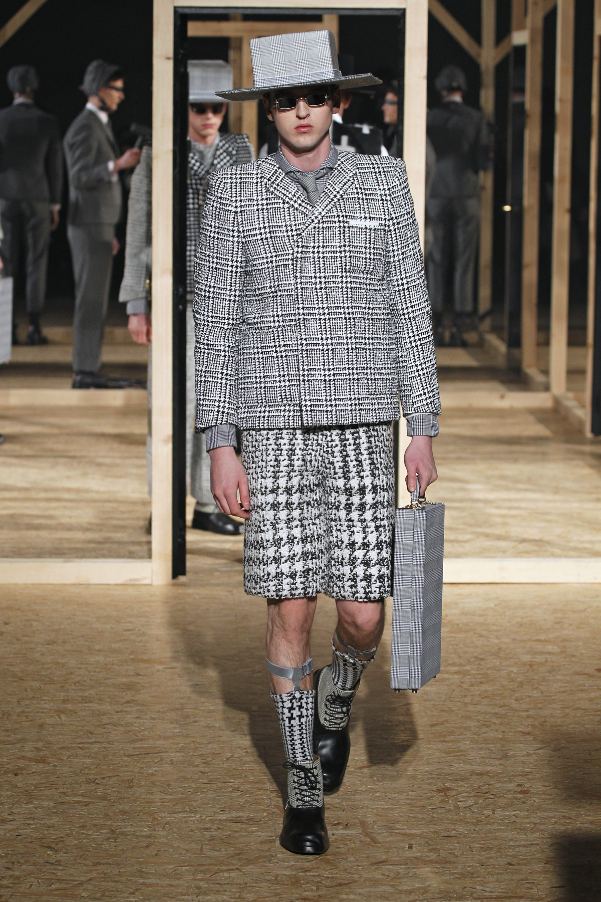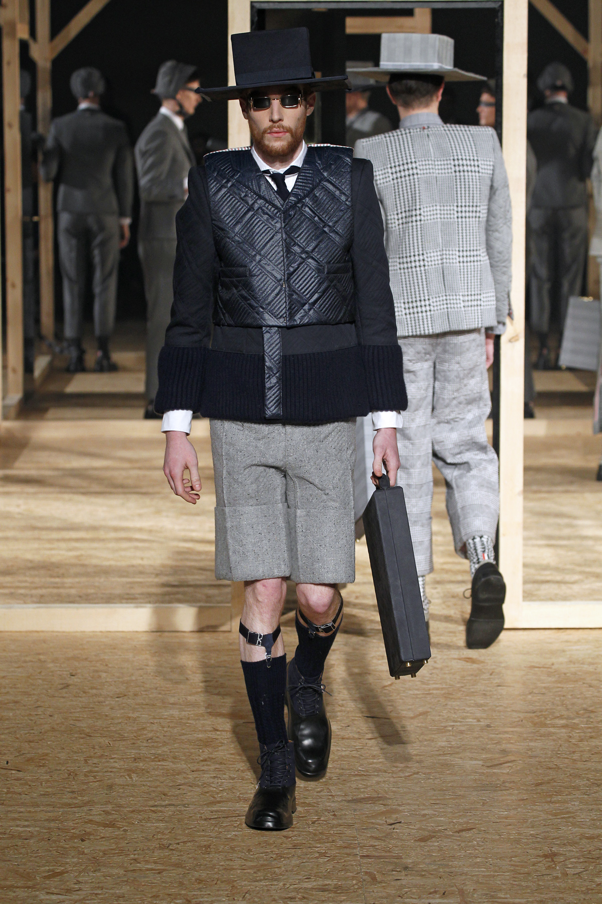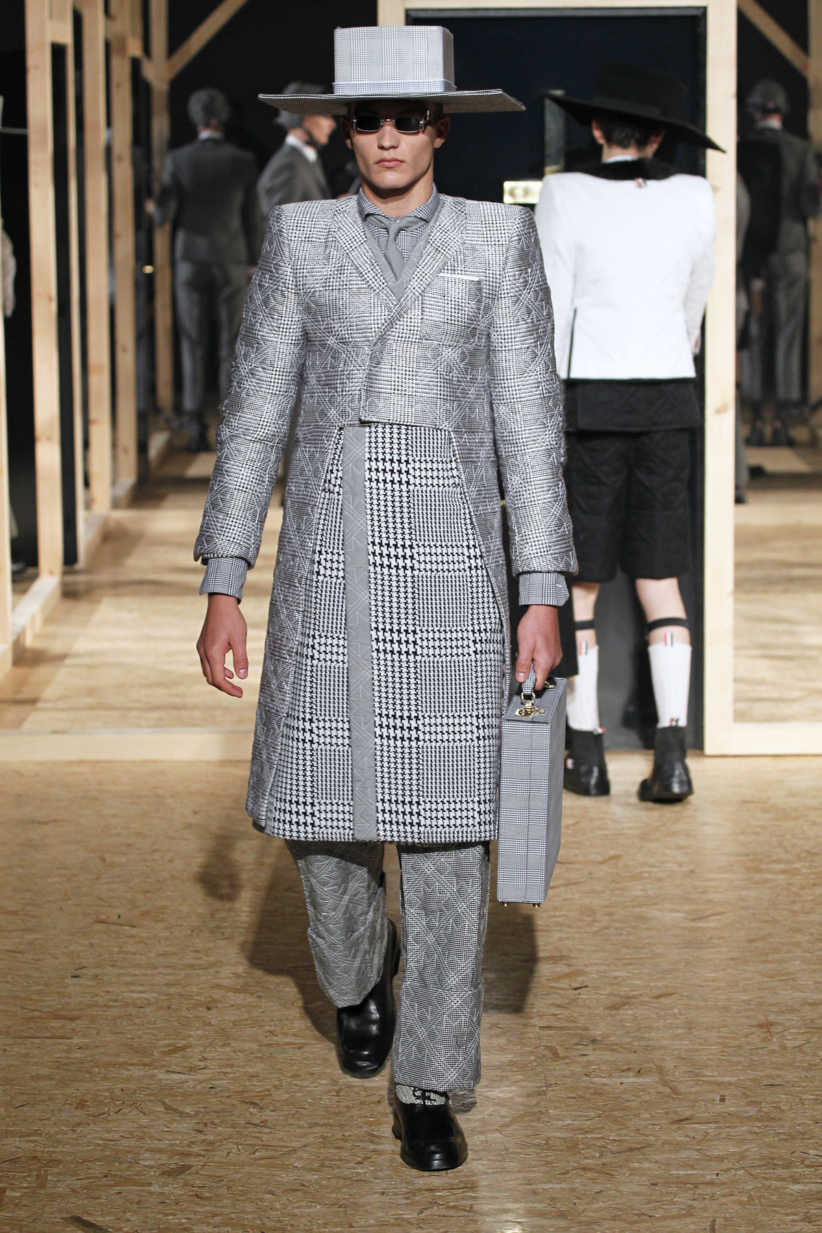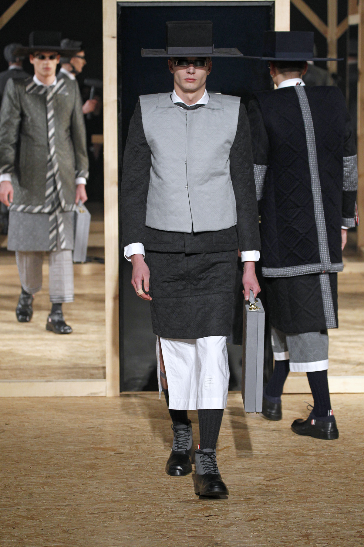 Les manteaux et vestes à col cranté sont réinterprétés géométriquement et les mélanges de matières et de textures sont nombreux chez Thom Browne : cuir, fourrure, laine, tissus matelassés, prince de Galles que l’on trouve sur manteaux, veste de costumes et capes.