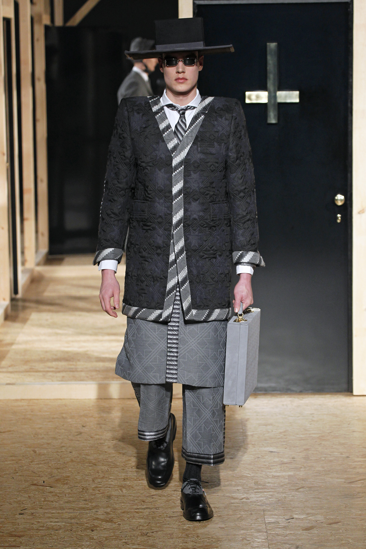 On dénote une certaine inspiration religieuse chez Thom Browne, les motifs de croix nous mettant sur la voie. Il est vrai que les longueurs de certains manteaux ainsi que la présence de jupes et robes font penser aux vêtements religieux et monacaux.