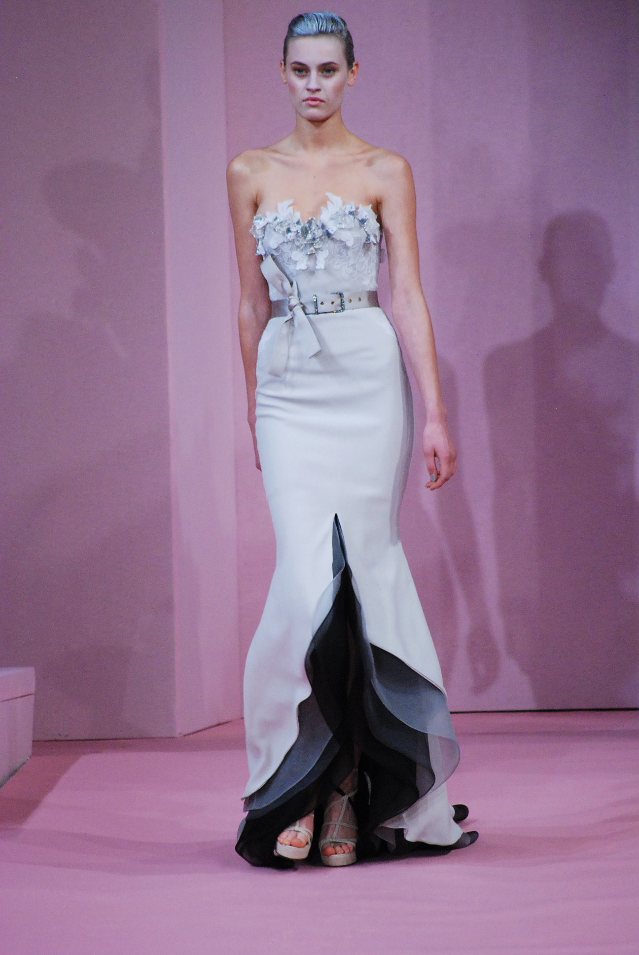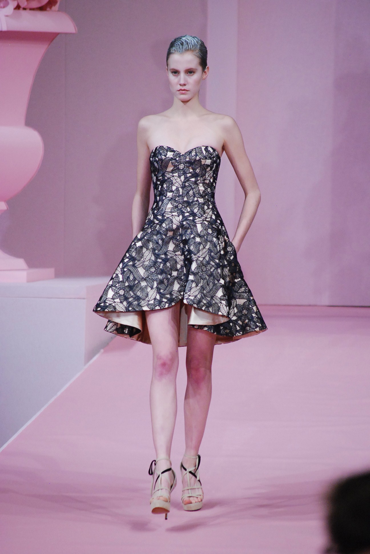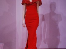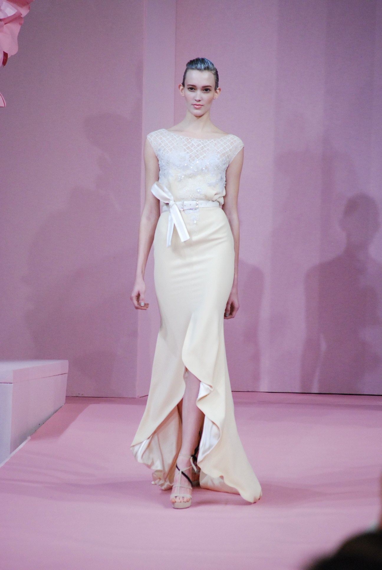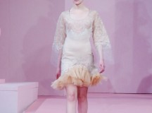 Alexis Mabille ne fait pas dans la demi-mesure : micro-jupe ou longueur jusqu’au sol, tout est dans l’affirmation et dans la démonstration. Bien sûr, ce ne serait pas du Mabille si sa signature, les nœuds, n’étaient pas présents, et on les retrouve incorporés aux robes au niveau des épaules.