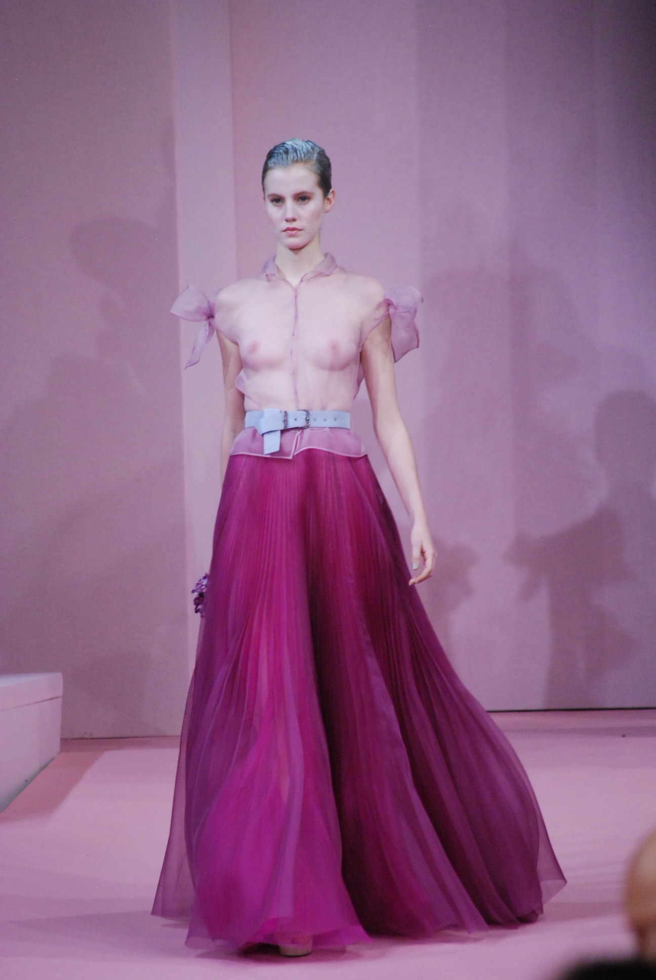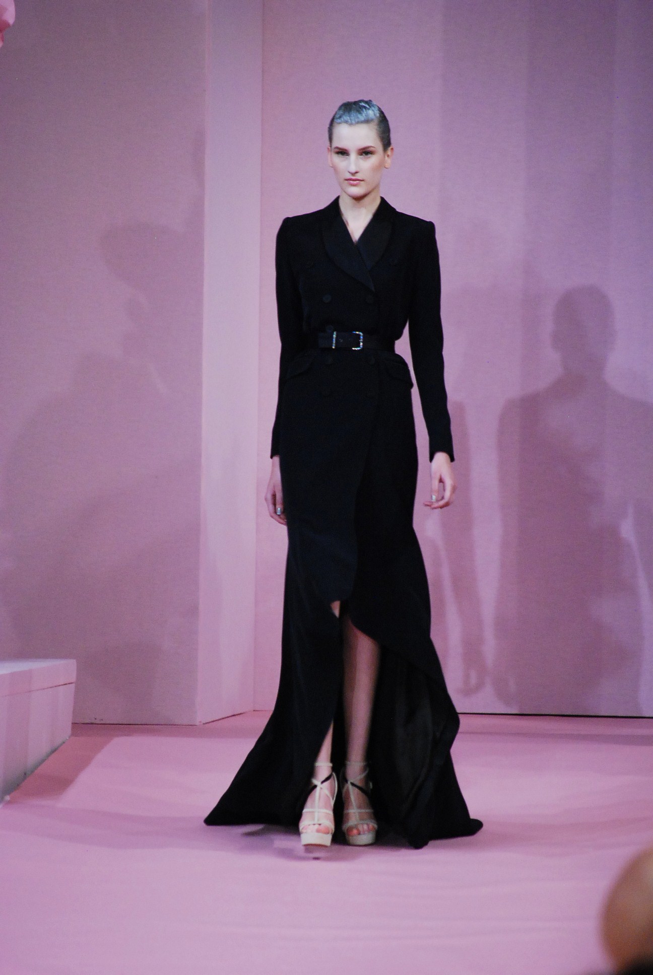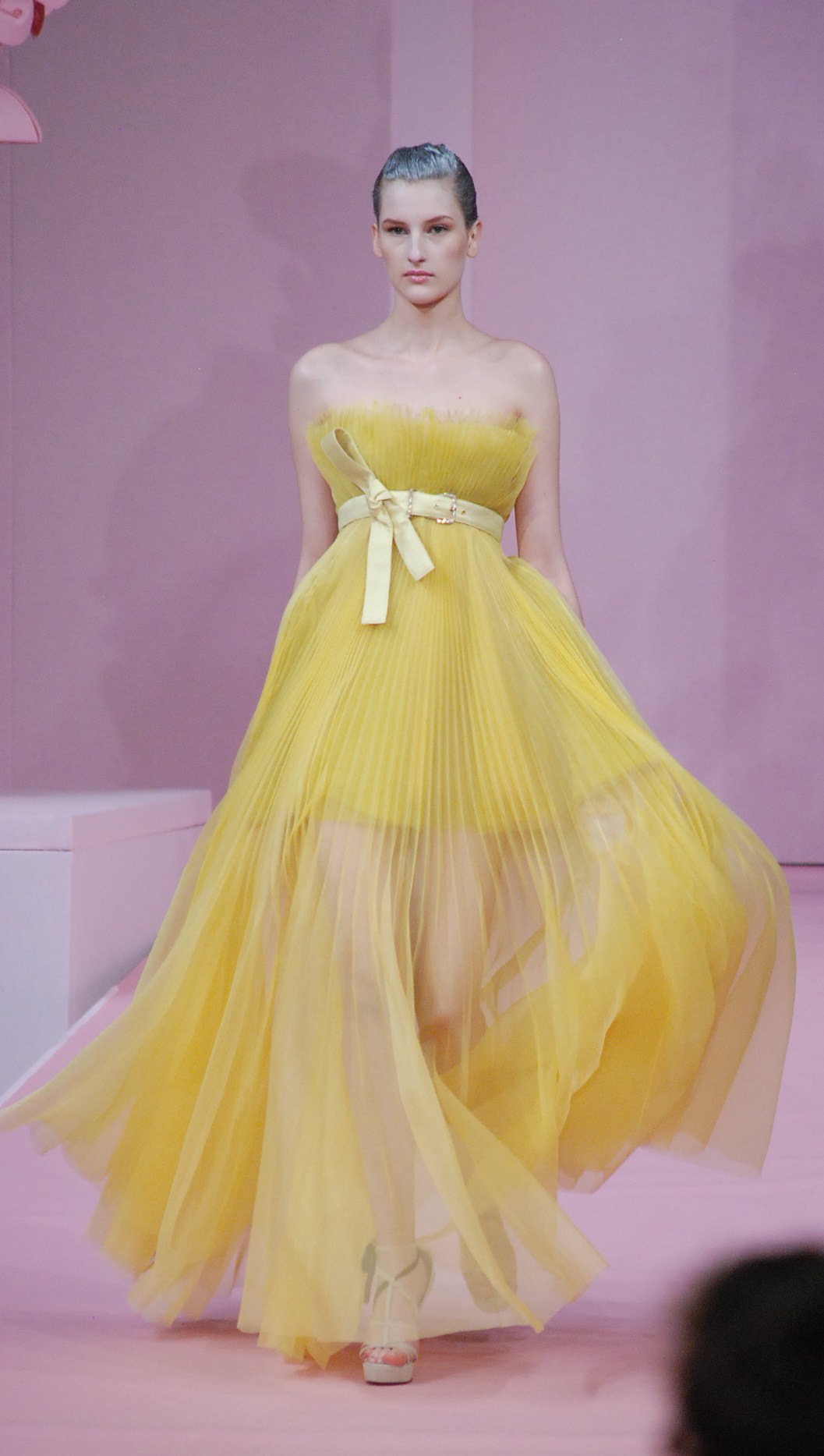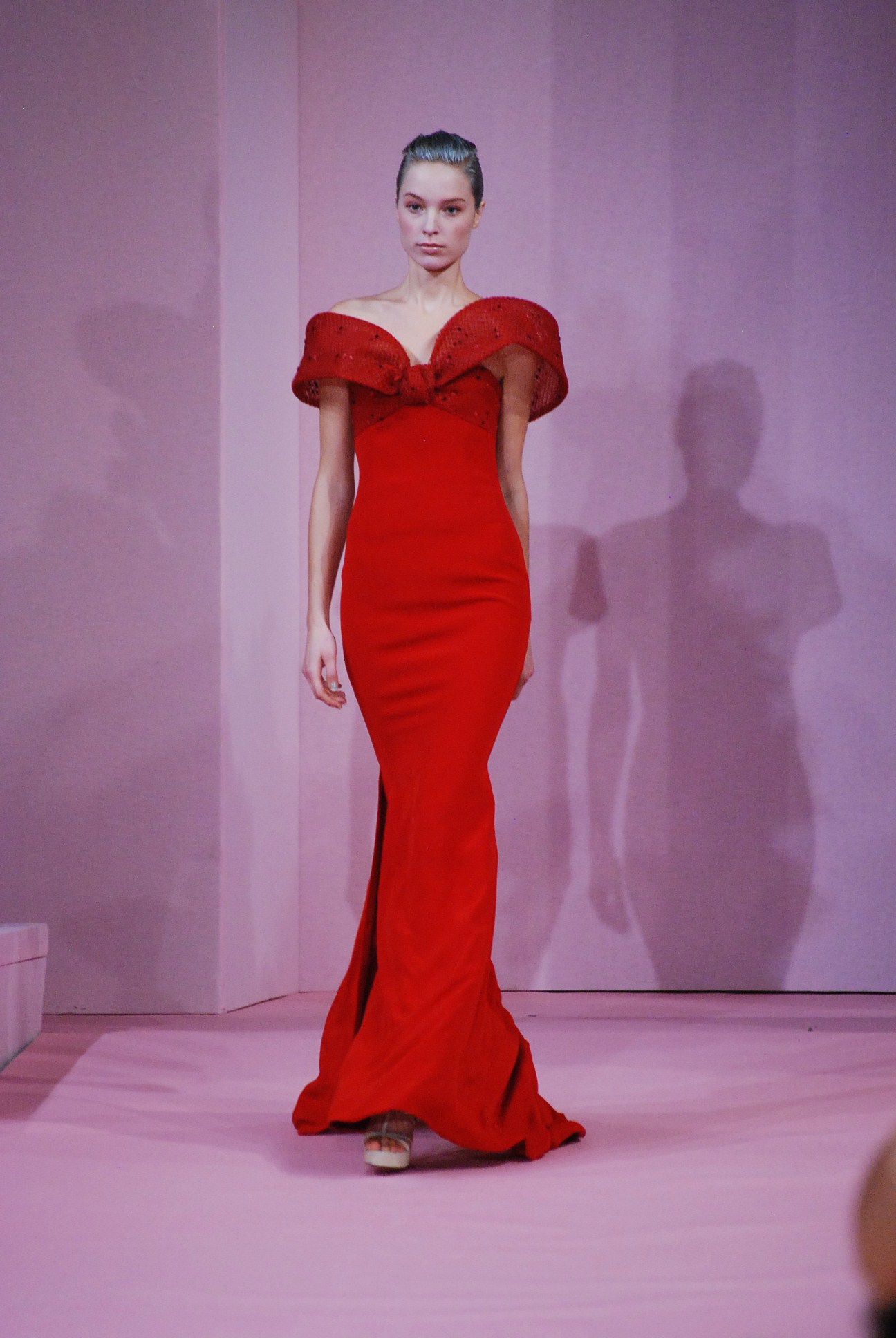 Alexis Mabille ne fait pas dans la demi-mesure : micro-jupe ou longueur jusqu’au sol, tout est dans l’affirmation et dans la démonstration. Bien sûr, ce ne serait pas du Mabille si sa signature, les nœuds, n’étaient pas présents, et on les retrouve incorporés aux robes au niveau des épaules.