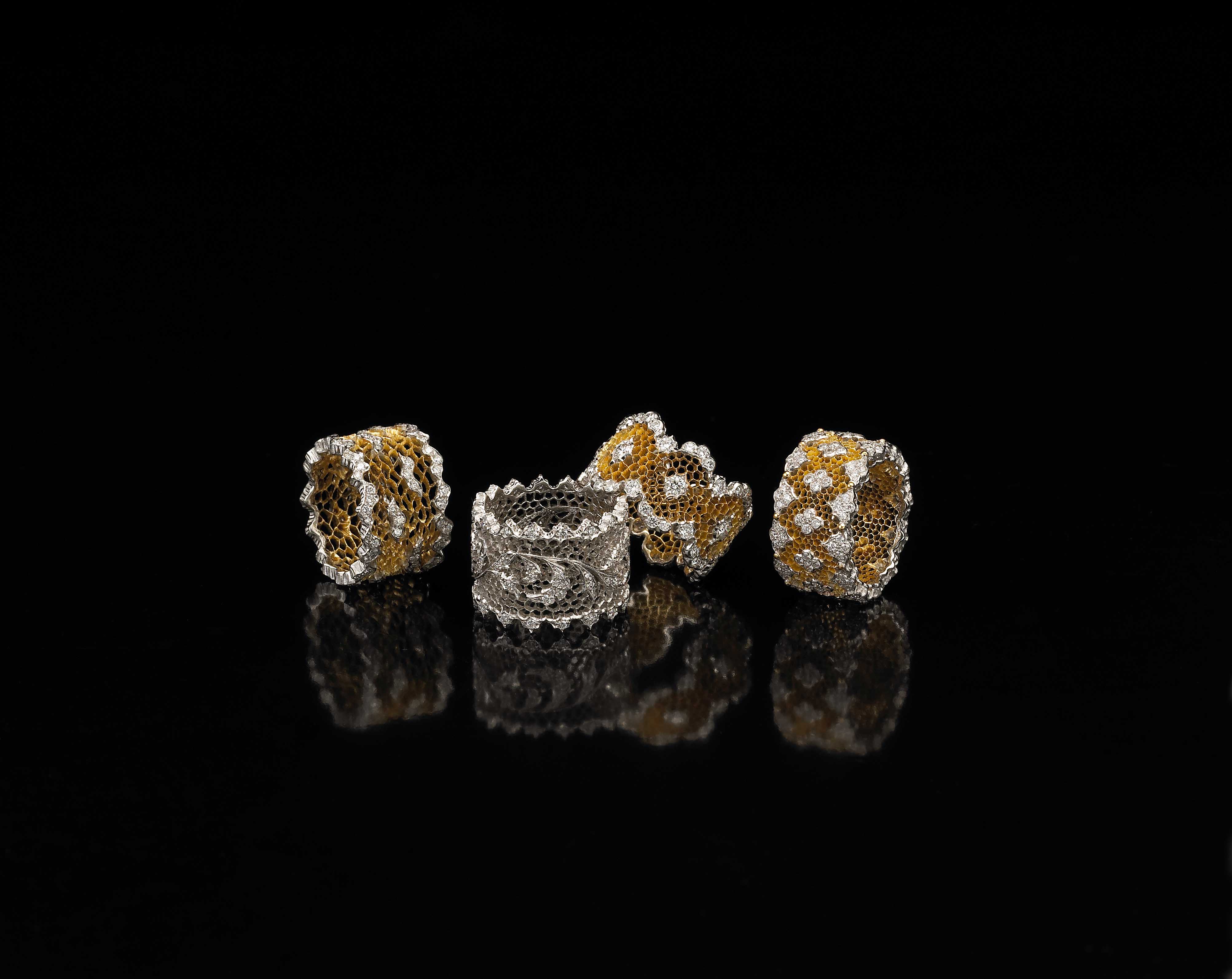 La prouesse artisanale que représentent les bijoux Buccellati évoque la plus délicate des dentelles. Le créateur trouve son inspiration dans les précieuses dentelles de Venise, de Bruges et de Valenciennes. Les artisans, fidèles aux esquisses de Gianmaria et d’Andrea, percent à la main de fines feuilles d’or sur lesquelles le motif de dentelle est ensuite tracé. Puis, avec patience et grande dextérité, ils percent à nouveau et percent encore pour obtenir le plus petit et le plus délicat des motifs. Un ciseau d’orfèvre qui dérape, et tout est à recommencer. Un talent transmis de génération en génération, aujourd’hui encore parfaitement maîtrisé par les artisans hautement compétents de la Maison, héritiers des techniques ancestrales et du savoir-faire de la Renaissance.