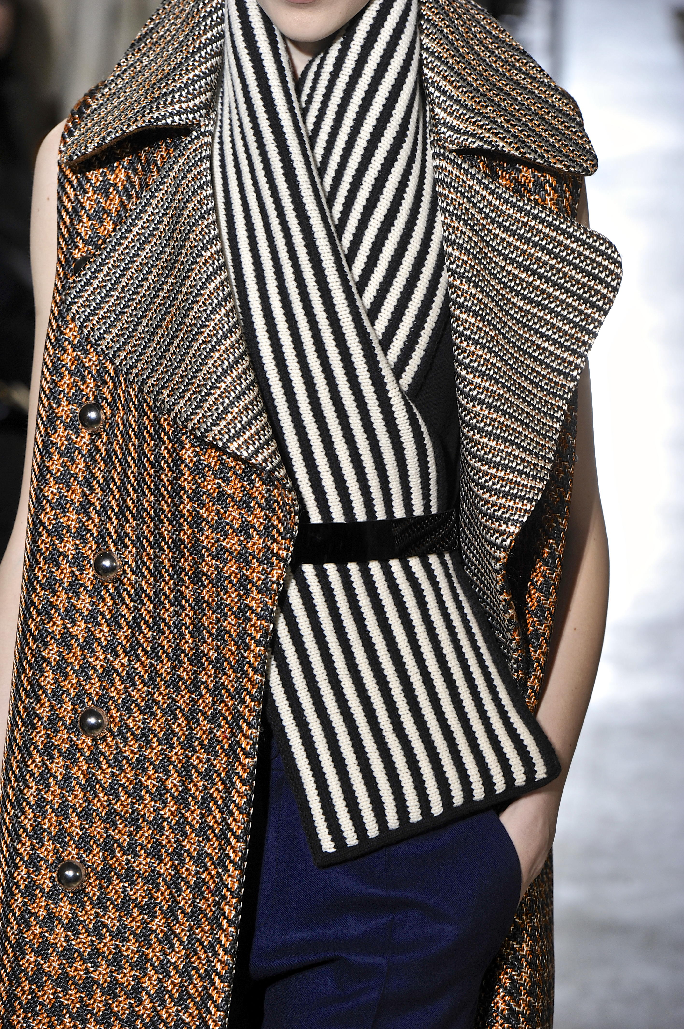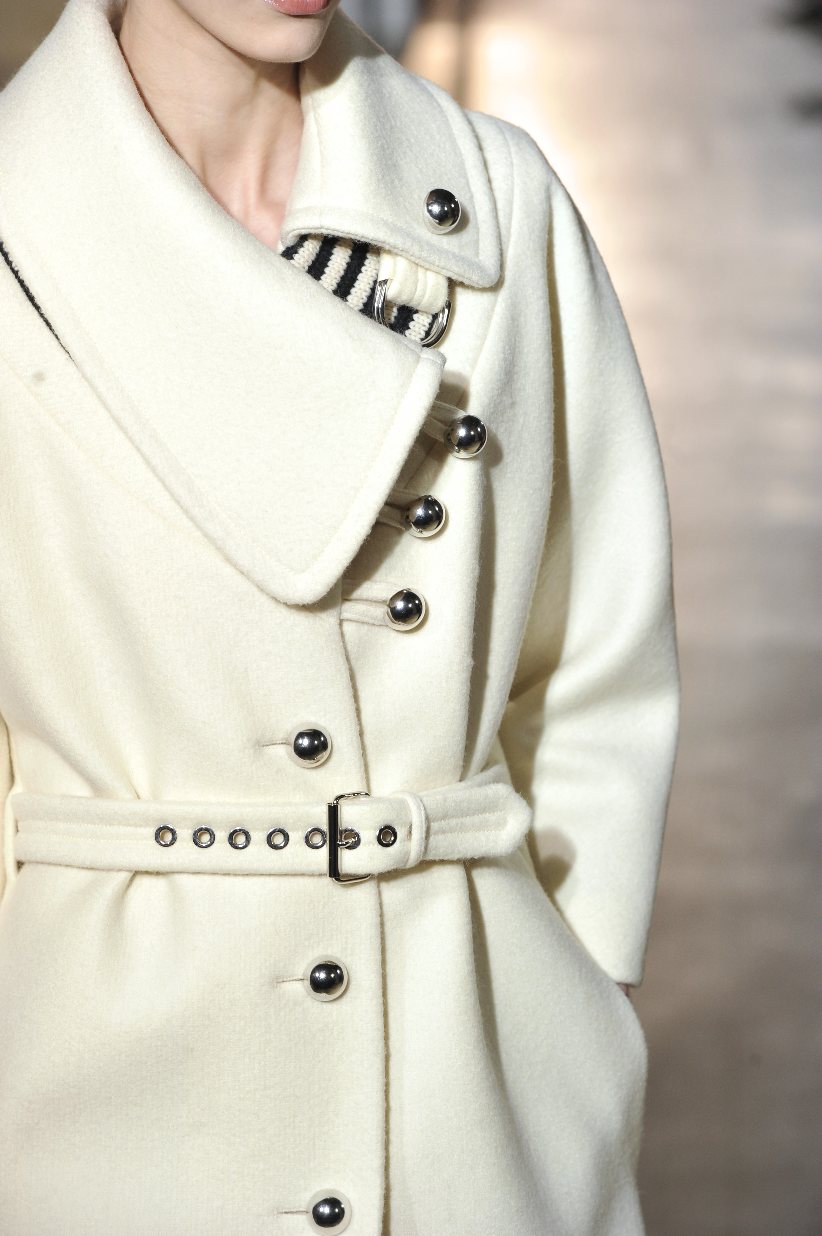 Trench coats and overcoats are worn belted and come in a sober color palette of brown, black, navy blue and white.