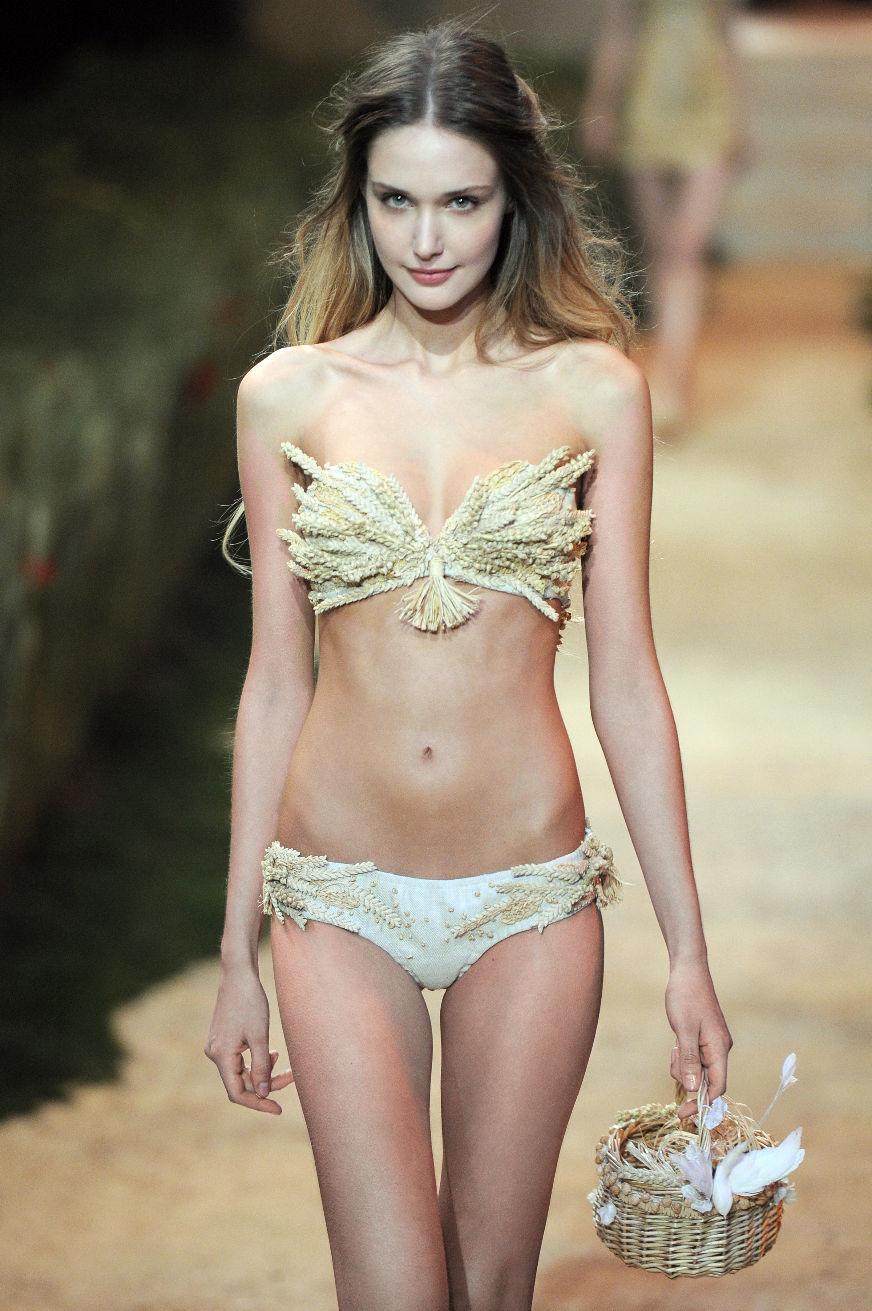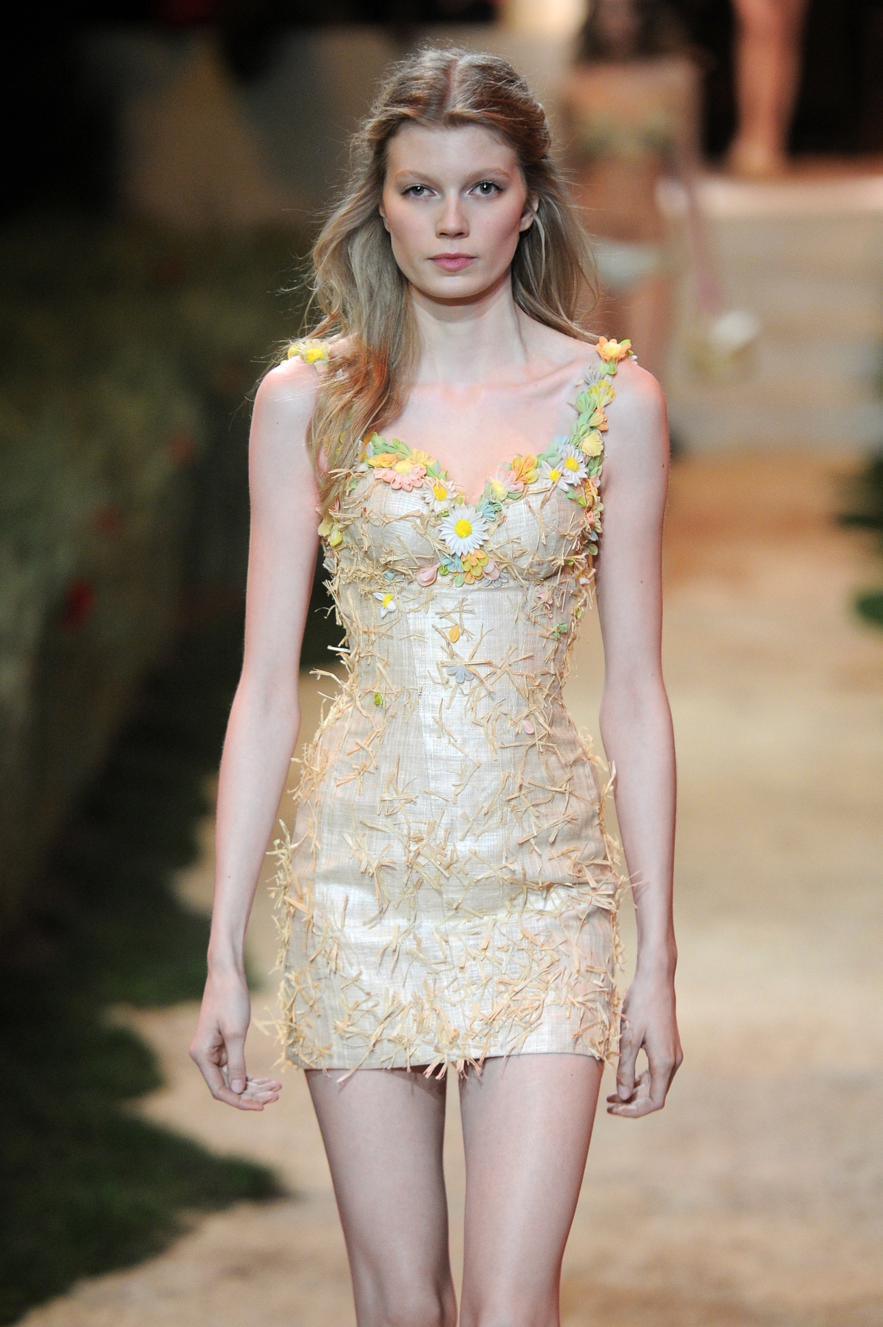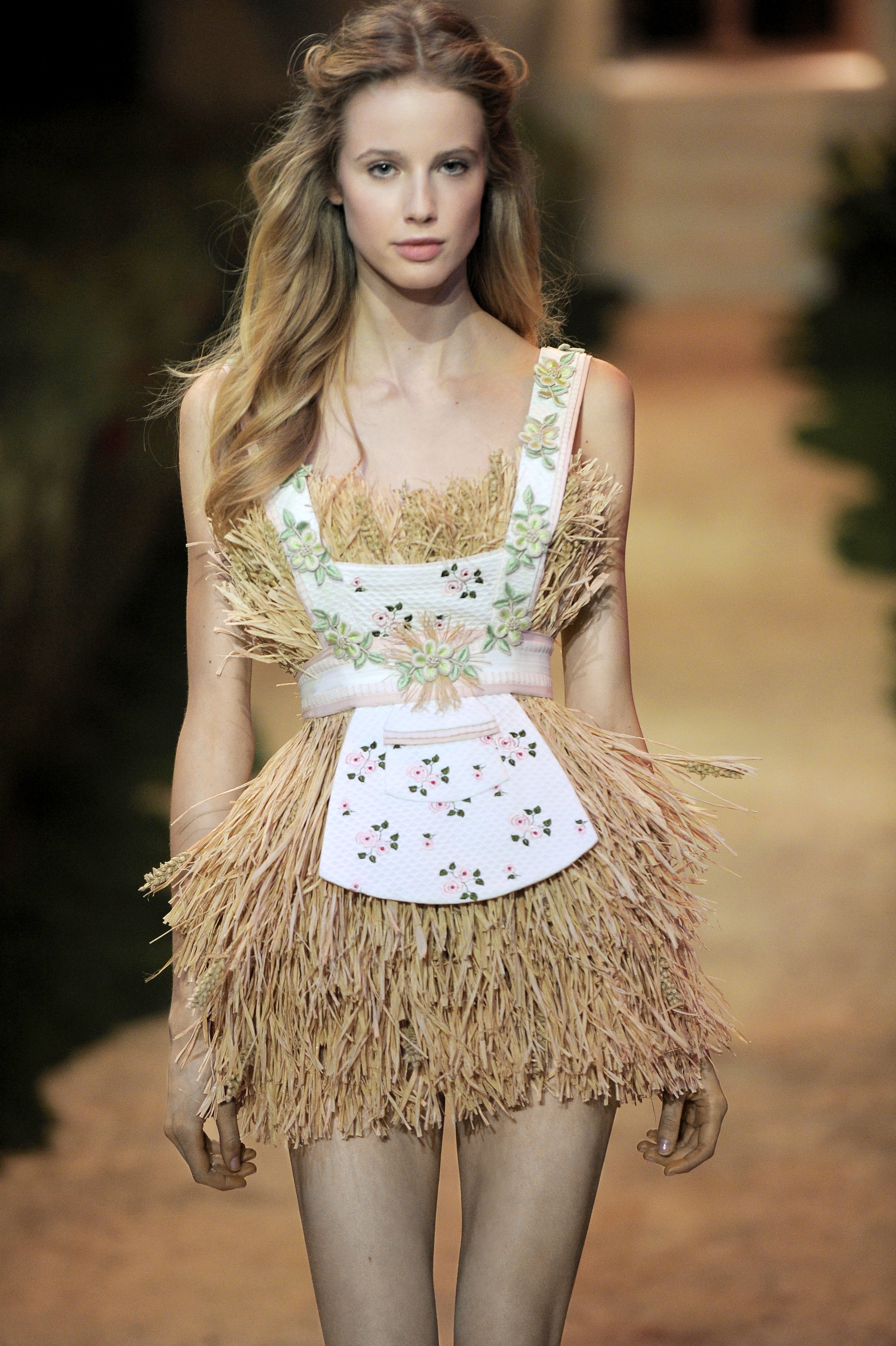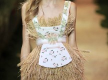 Les gerbes de blé, ourlées et rebrodées patiemment grain à grain, roulent jusque dans le creux des échancrures. Dans ces scènes au charme vaporeux, un panier de paille savamment tressé offre un époustouflant fond de décor à une robe, dressée