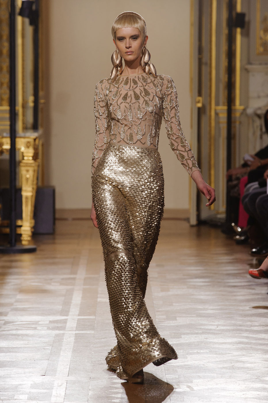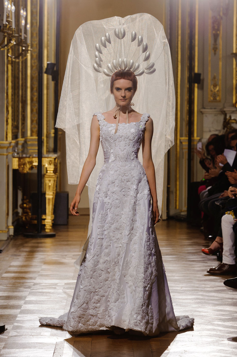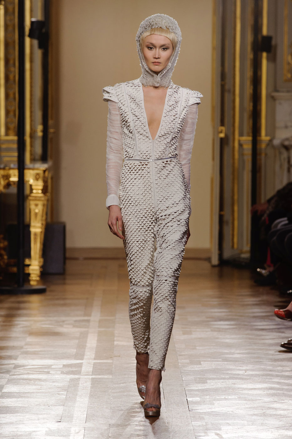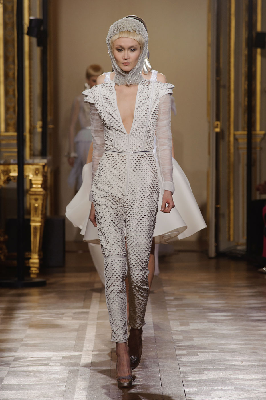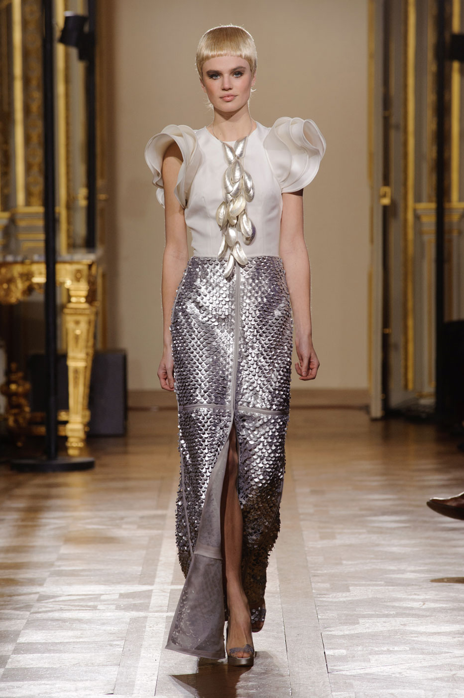 Plonger dans un océan de matières, se laisser porter par les courants d’un idéal insensé, surréaliste et organique; être envoûté par le ballet hypnotique de nageoires de soie , refaire surface un instant, être transpercé par une lumière rose et métallique, replonger, ignorer le danger des écailles de cuir, effleurer un corail de tulle et enfin capituler devant la sensualité extravagante et mystérieuse de la femme poisson.