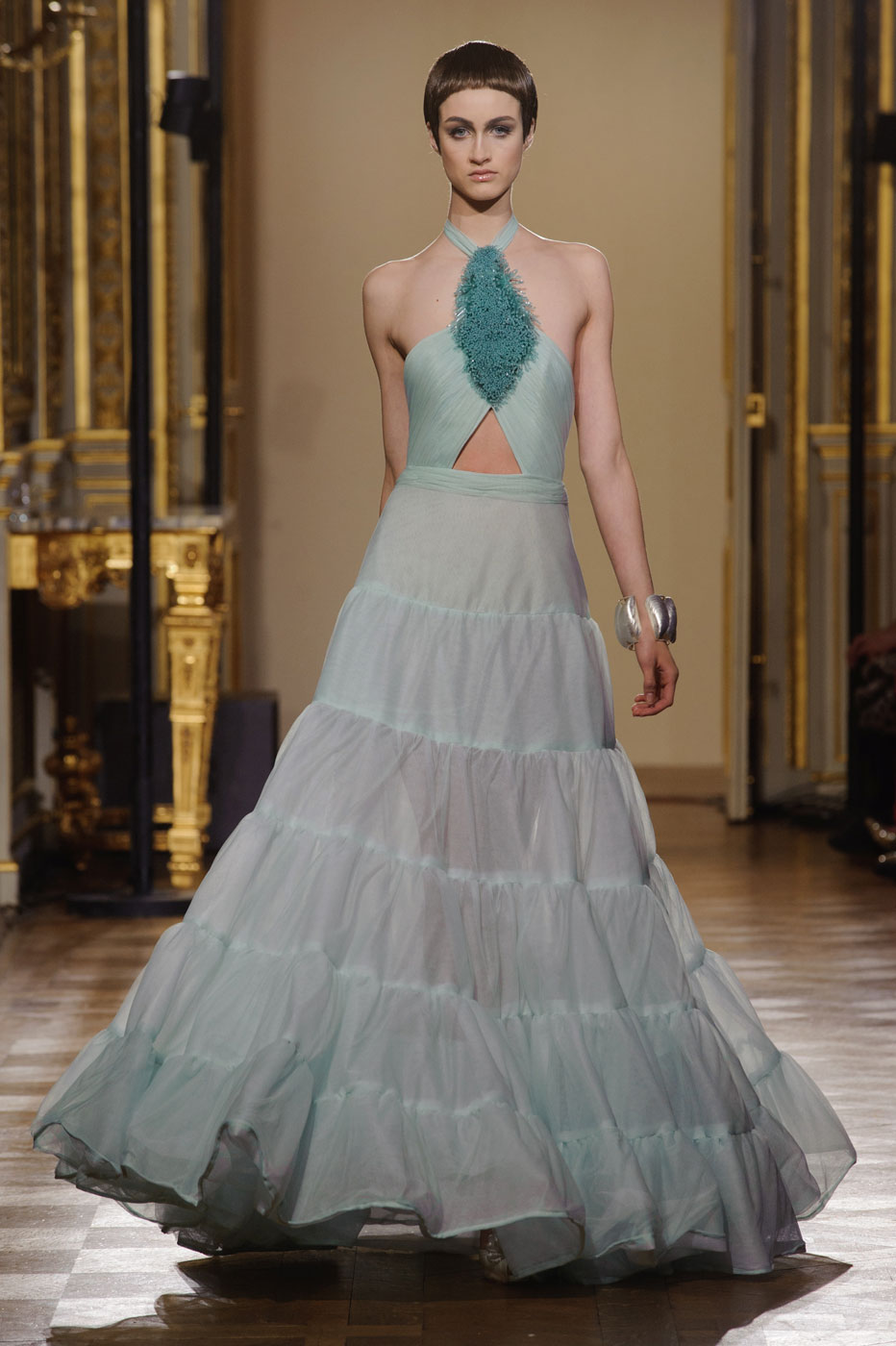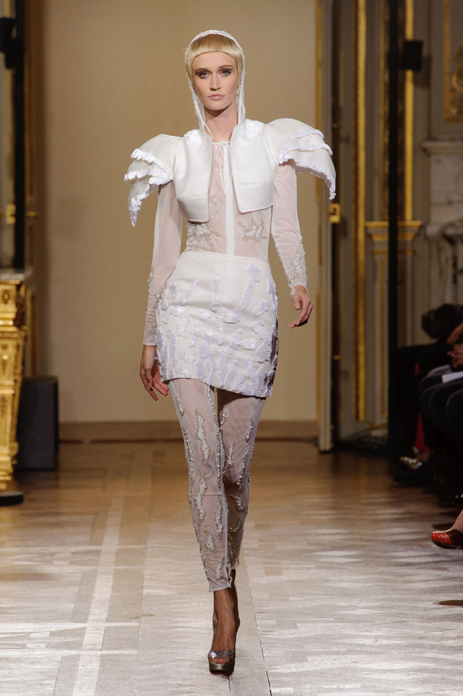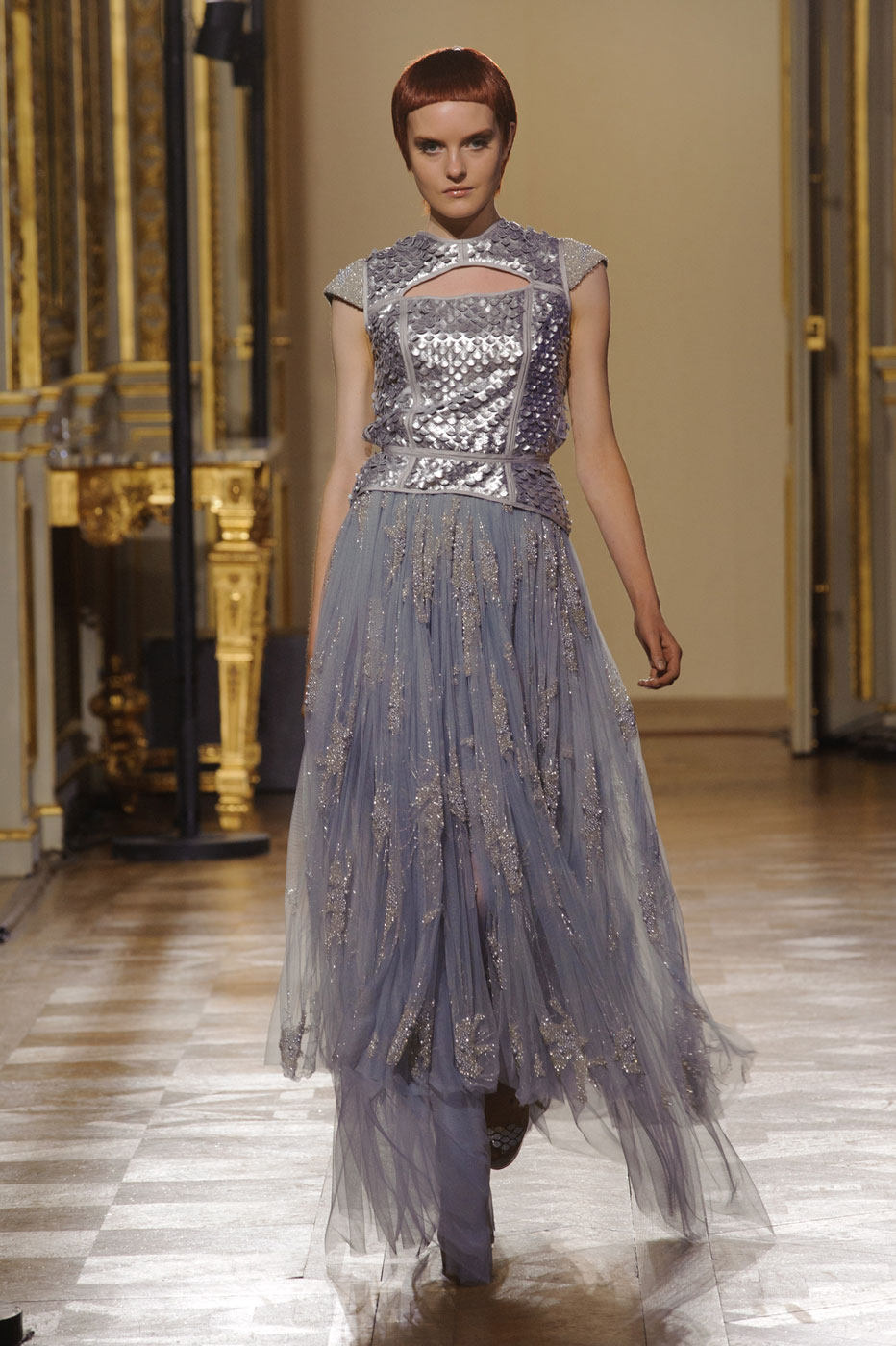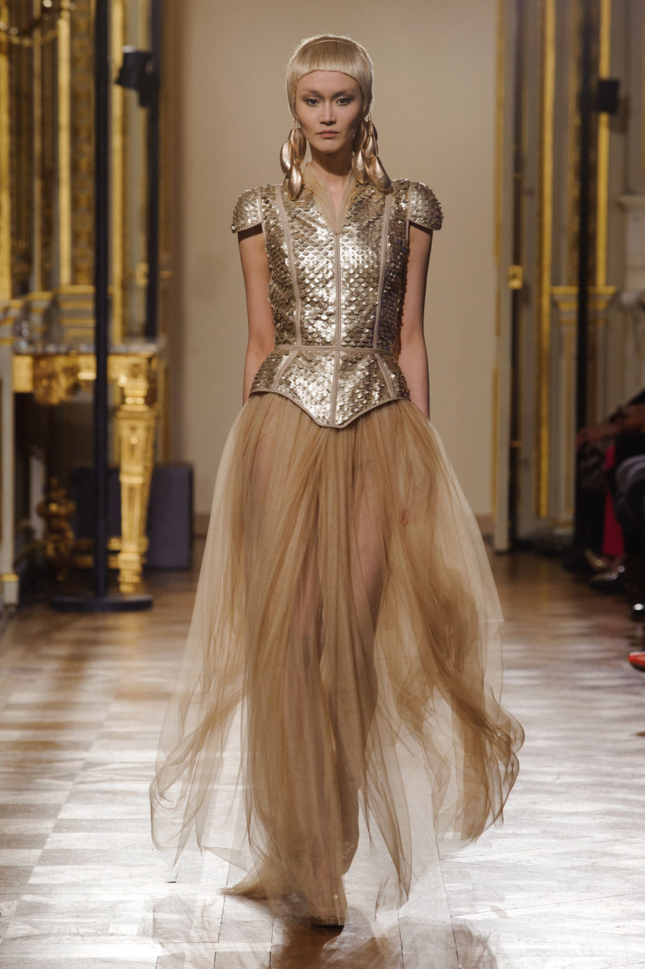 Plonger dans un océan de matières, se laisser porter par les courants d’un idéal insensé, surréaliste et organique; être envoûté par le ballet hypnotique de nageoires de soie , refaire surface un instant, être transpercé par une lumière rose et métallique, replonger, ignorer le danger des écailles de cuir, effleurer un corail de tulle et enfin capituler devant la sensualité extravagante et mystérieuse de la femme poisson.