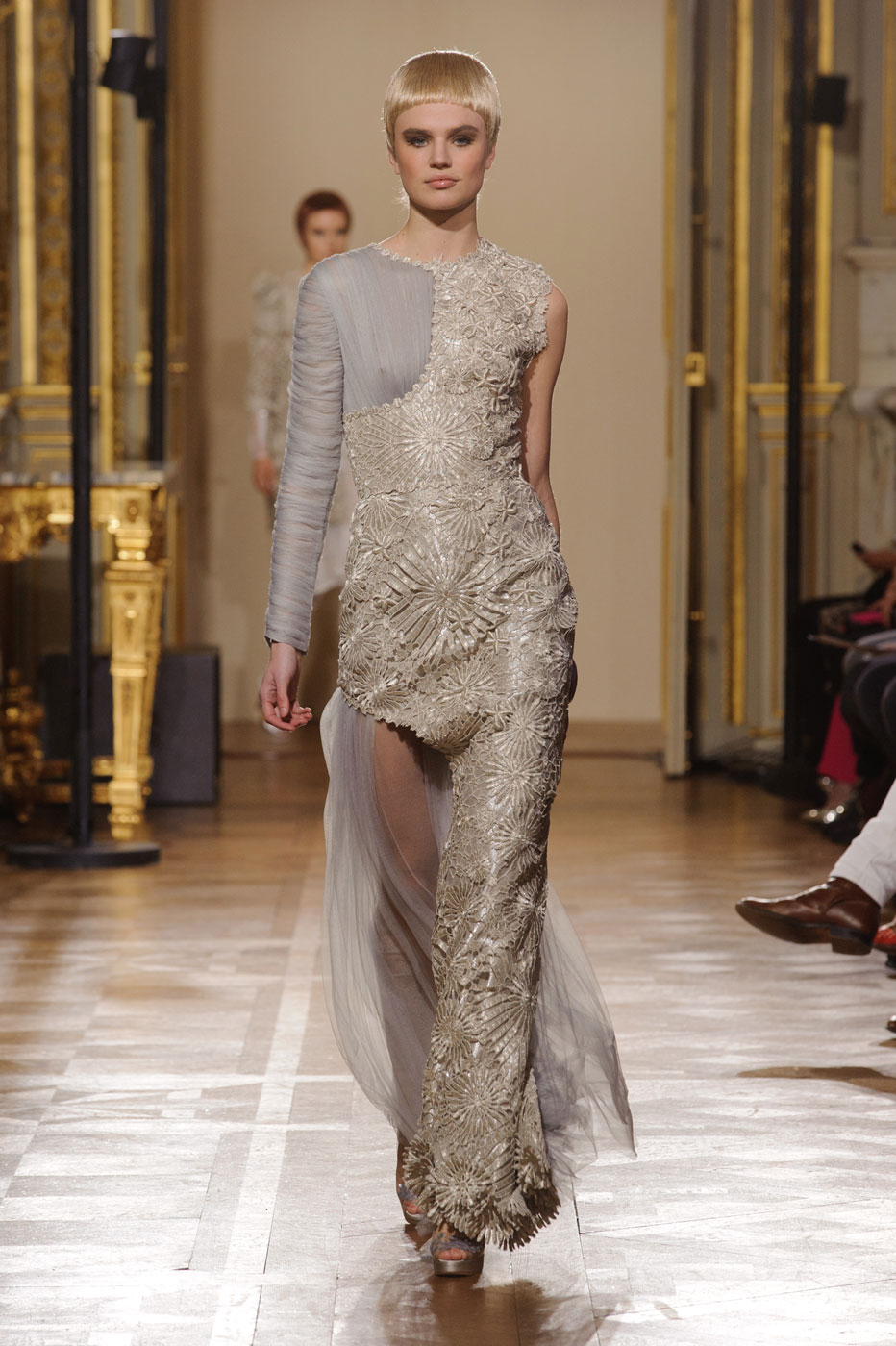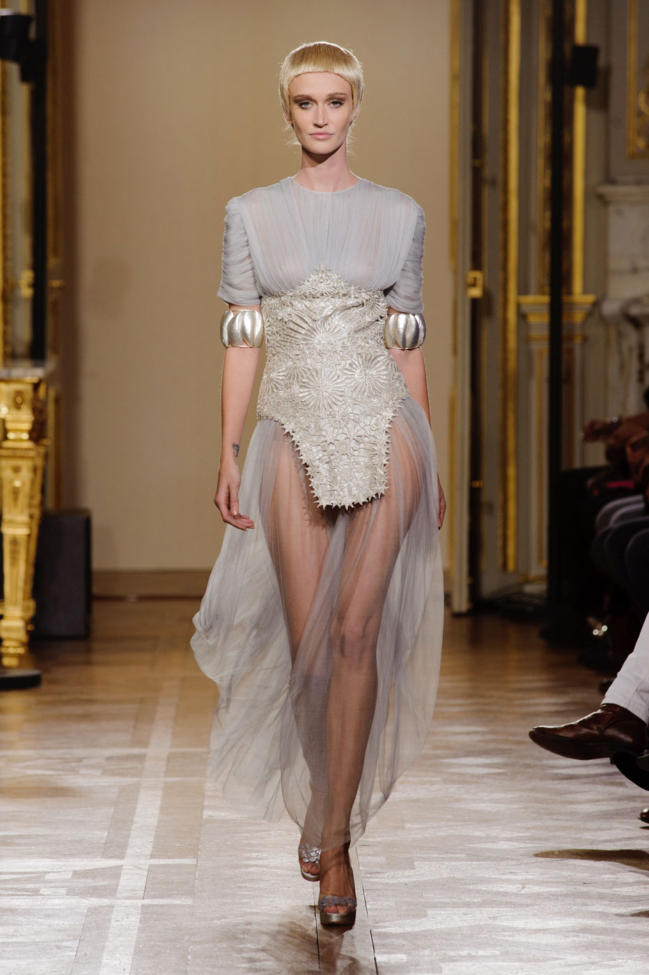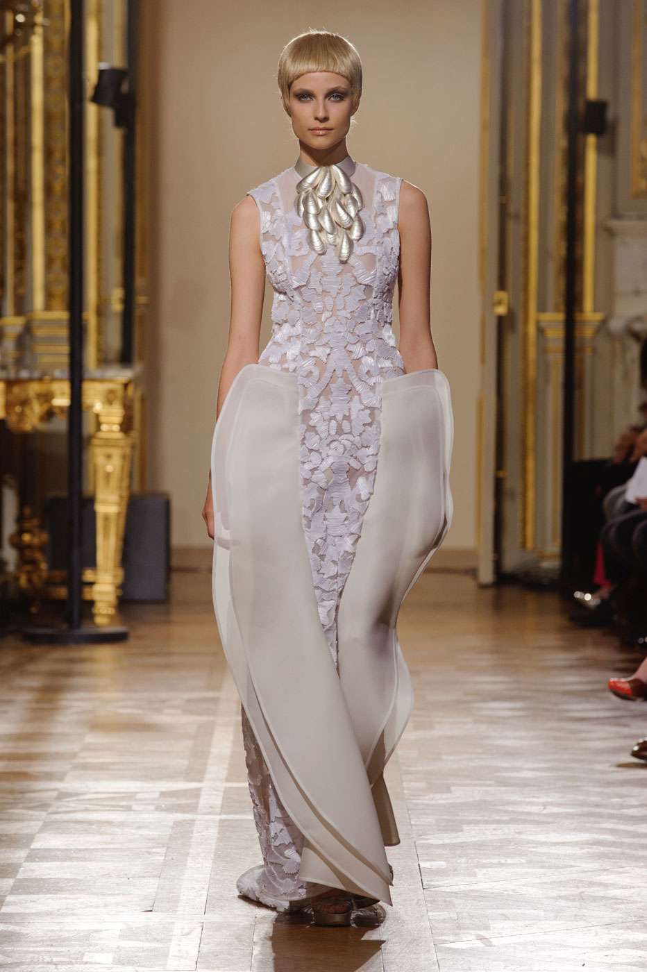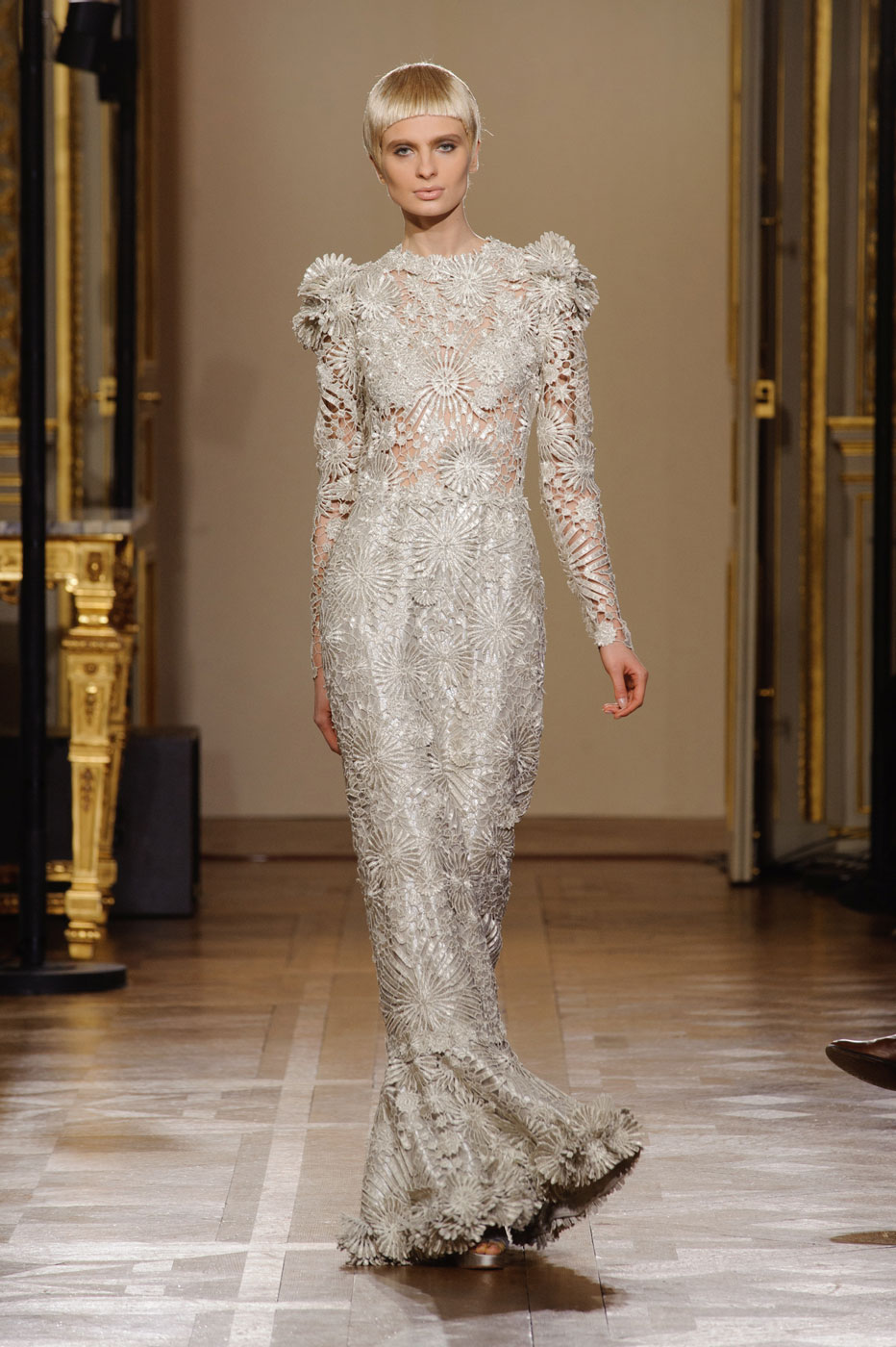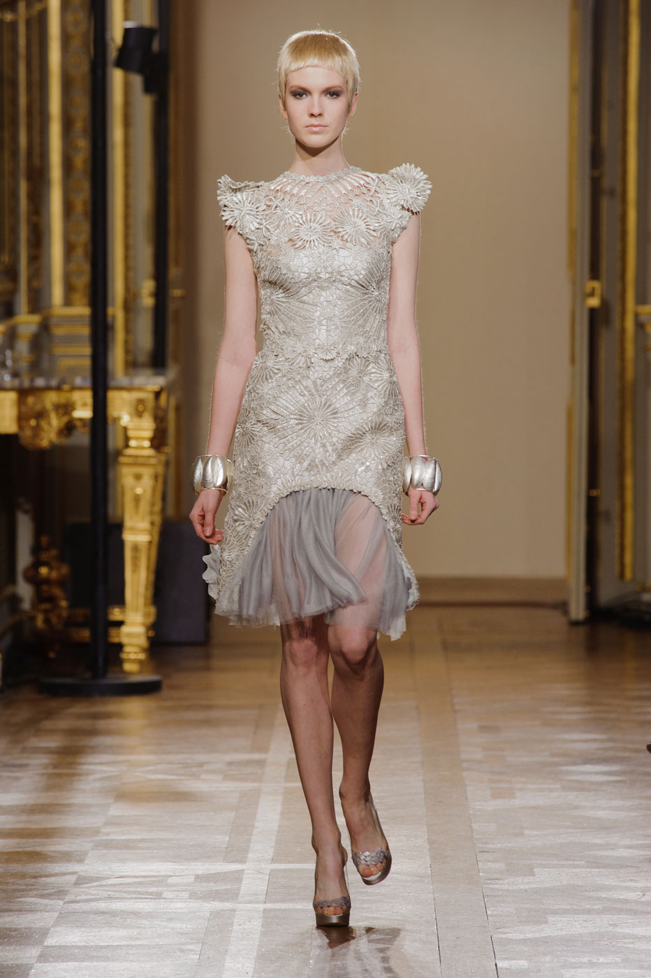 Plonger dans un océan de matières, se laisser porter par les courants d’un idéal insensé, surréaliste et organique; être envoûté par le ballet hypnotique de nageoires de soie , refaire surface un instant, être transpercé par une lumière rose et métallique, replonger, ignorer le danger des écailles de cuir, effleurer un corail de tulle et enfin capituler devant la sensualité extravagante et mystérieuse de la femme poisson.