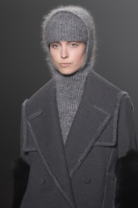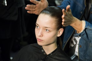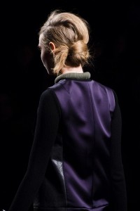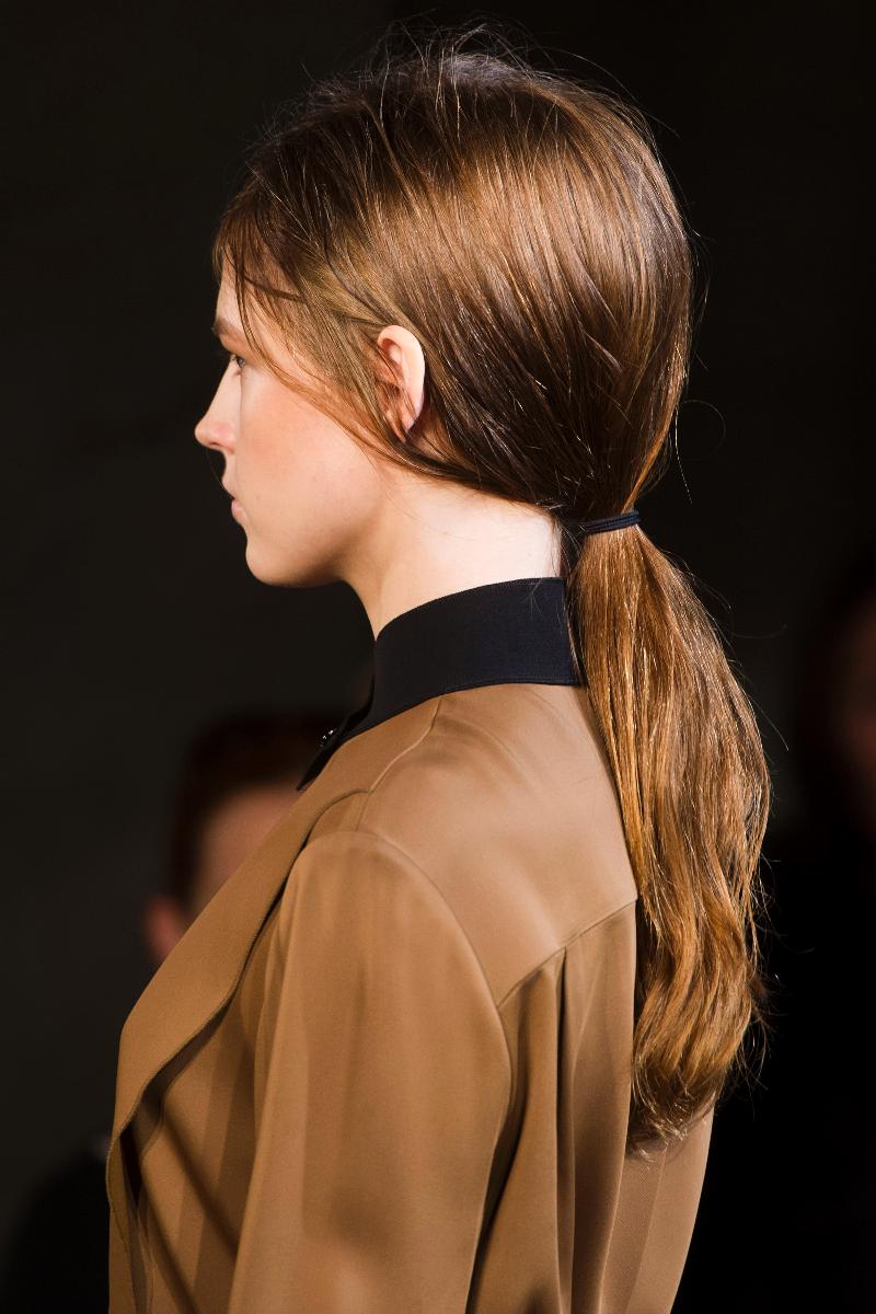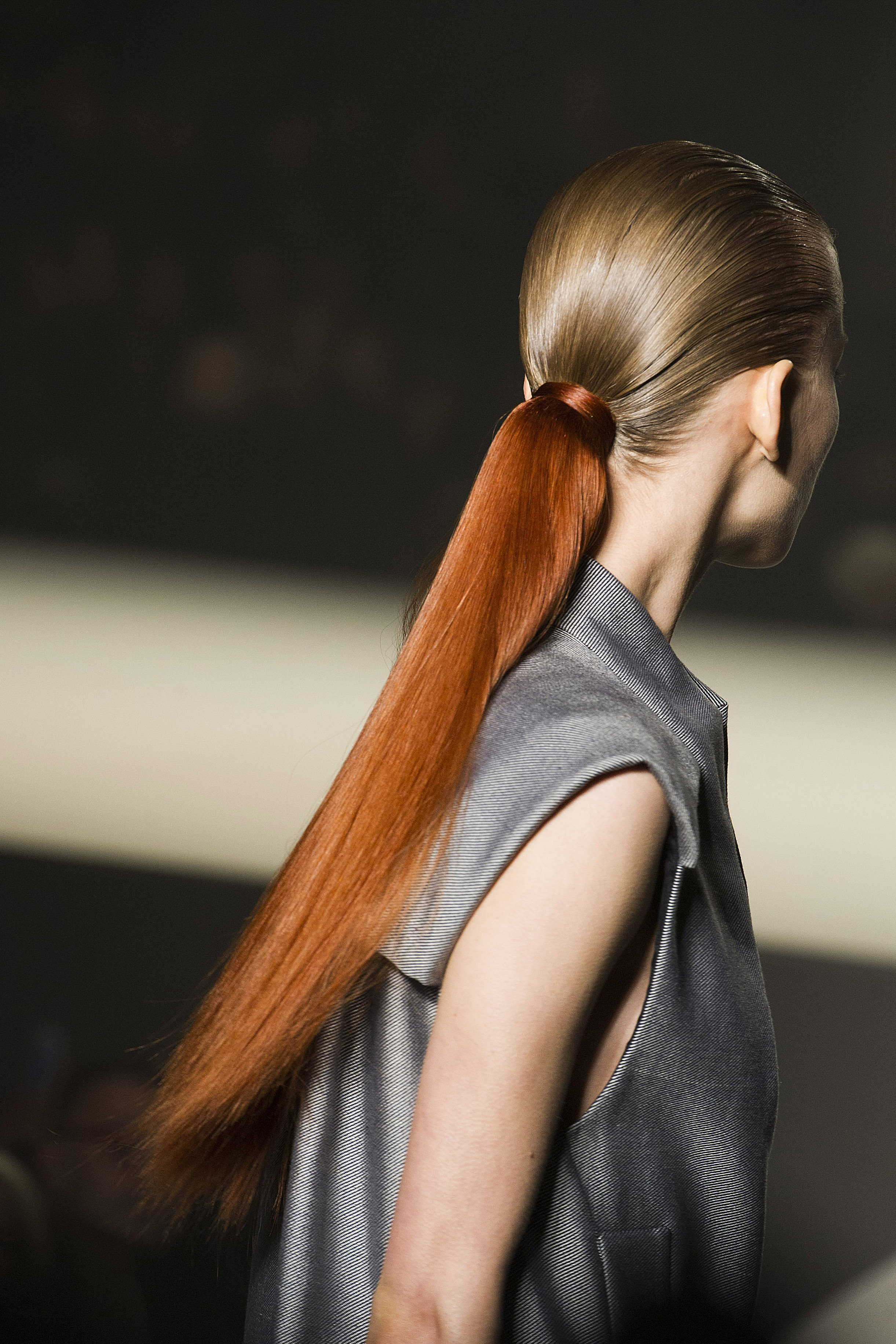 Queue de cheval basse bi-colore pour Alexander Wang sur cheveux tirés: « Ce look a quelque chose d’un peu artificiel, de cosmétique, et il relève les tons neutre de la collection », explique Guido (coiffeur Redken du défilé). « Nous avons utilisé des extensions ‘cognac’ et j’aime le côté sophistiqué et osé de ce choix. Il y a une touche futuriste évidente qui magnifie parfaitement la collection, et peut tout à fait être porté de jour…comme de nuit! »