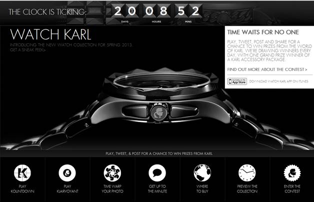 Le temps joue contre vous, répandez la nouvelle au plus vite au sein de votre réseau social ! Celui ou celle qui diffusera l’information au plus grand nombre de personnes avant le lancement aura la chance de gagner le grand prix qui comprend les trois montres phares de la collection : Karl Zip, Karl Chain et Karl Seven, ainsi que d’autres fabuleux accessoires Karl.