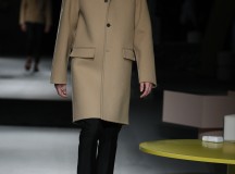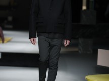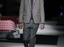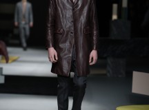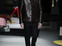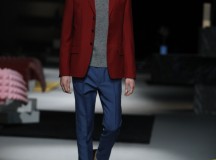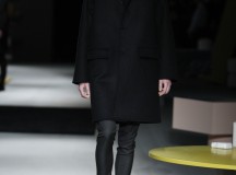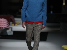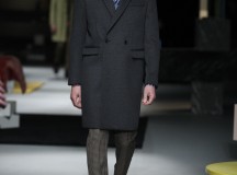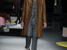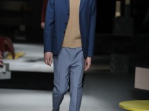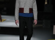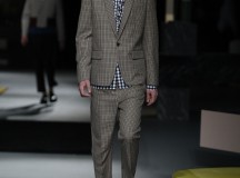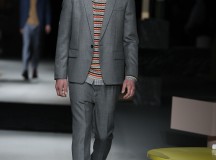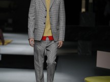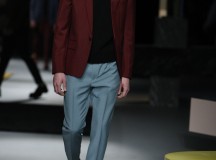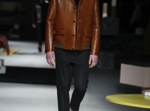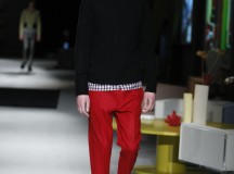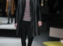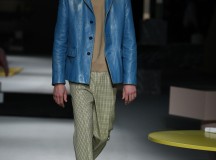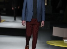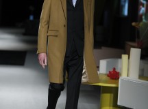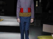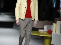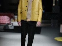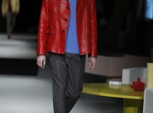 Teintes de rouges, de bleus et de jaunes (passant du jaune citron au moutarde) se mêlent à un défilé ou les références aux années 70 sont fortes (costumes à carreaux bicolores portés sur un ensemble pull/chemise en color block). On ose aussi la couleur sur le cuir des vestes.