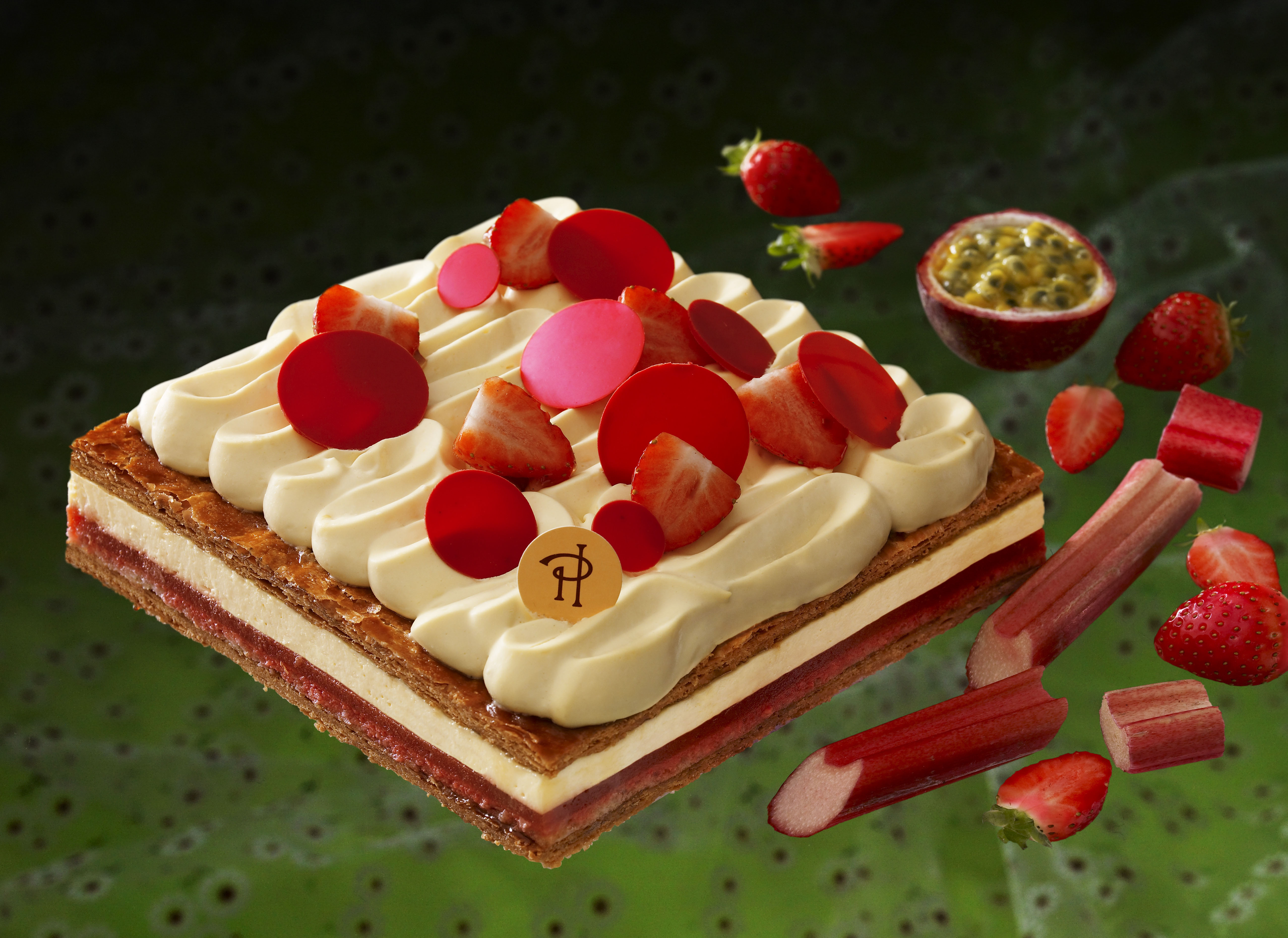 Lorsque Pierre Hermé réinterprète le traditionnel millefeuille aux saveurs de Céleste, cela frôle le divin acidulé. Dans ce gâteau, le sucré de de la pâte feuilletée archi croustillante et parfaitement caramélisée contraste avec le parfum de la crème onctueuse de mascarpone au fruit de la Passion sublimé par la douce acidité de la compote de rhubarbe aux fraises, pour ne laisser au palais que le goût du millefeuille délicat et équilibré, intensément fruité. Une gourmandise acidulée comme un hommage aux trois délices pimpants que sont la fraise, la rhubarbe et le fruit de la Passion.