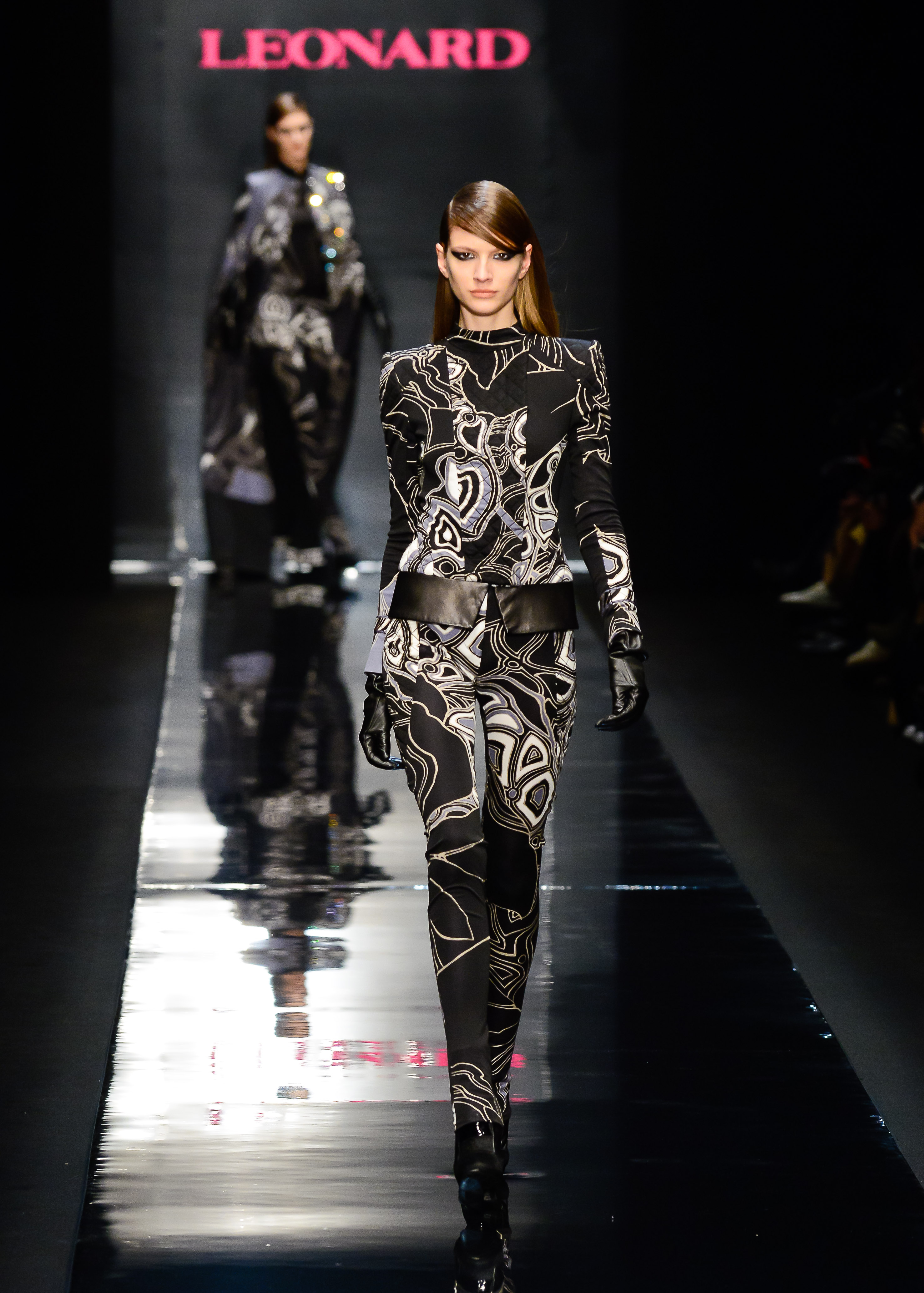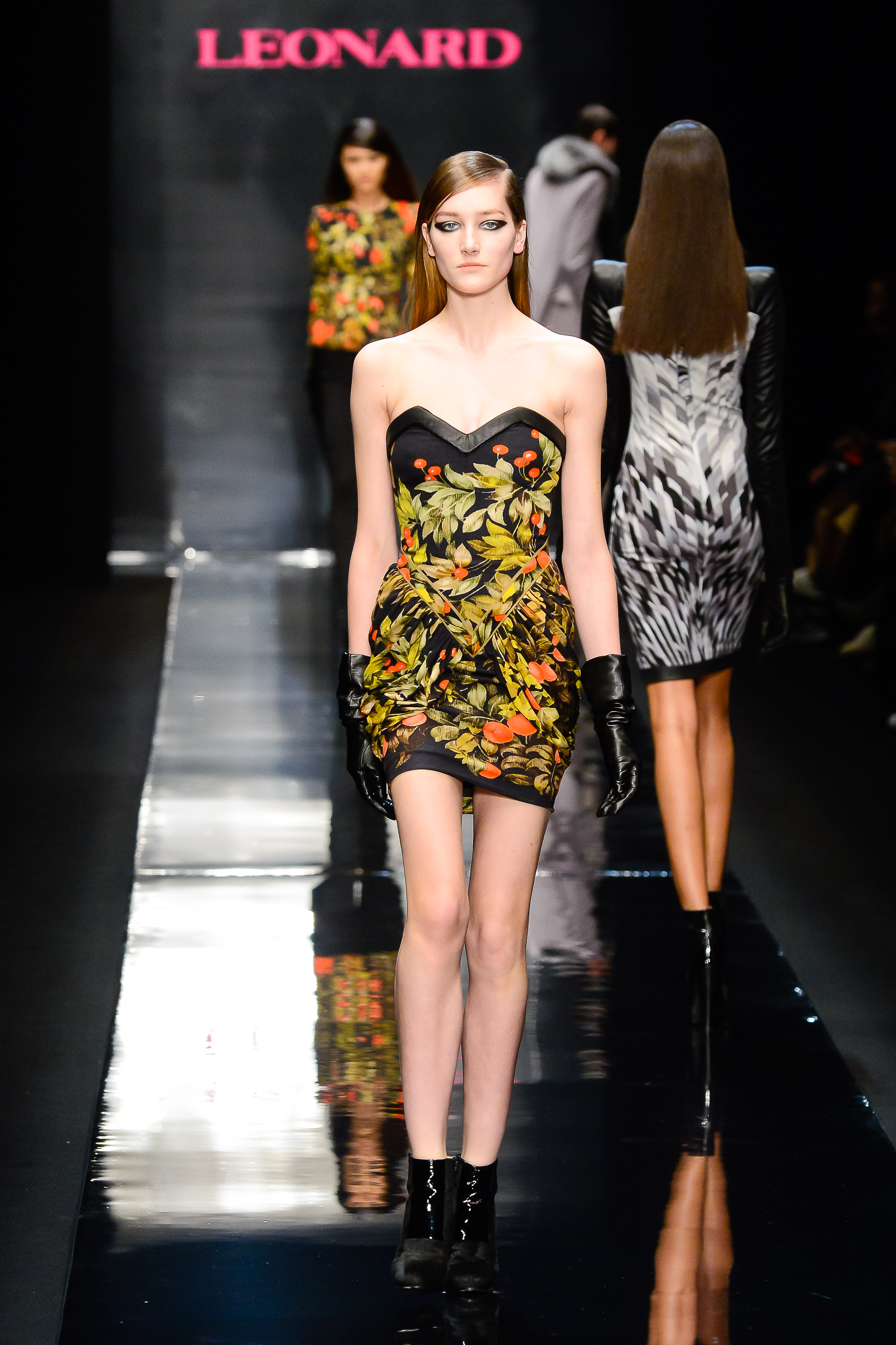 Raffaele Borriello réinterprete la femme Léonard, une créature sexy et vénéneuse à l’instar des imprimés fleuris. Mais elle est aussi une créature de nuit, moderne de par son côté rock. Elle se transforme même en héroïne du glamour quand elle revêt sa cape brodée de cristaux swarovski. Côté matière jerseys de soie laqué côtoient le cuir noir.