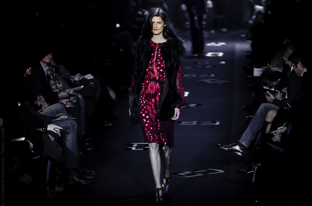 Revival 70’s pour Diane Von Furstenberg qui nous a présenté à New York une collection automne hiver 2013-2014 flower power et vitaminée. Imprimés psychédéliques, plastrons dorés, léopard, python. DVF prône la féminité, marque les silhouettes à la taille. Une mode vitaminée aux soupçons de LCD !