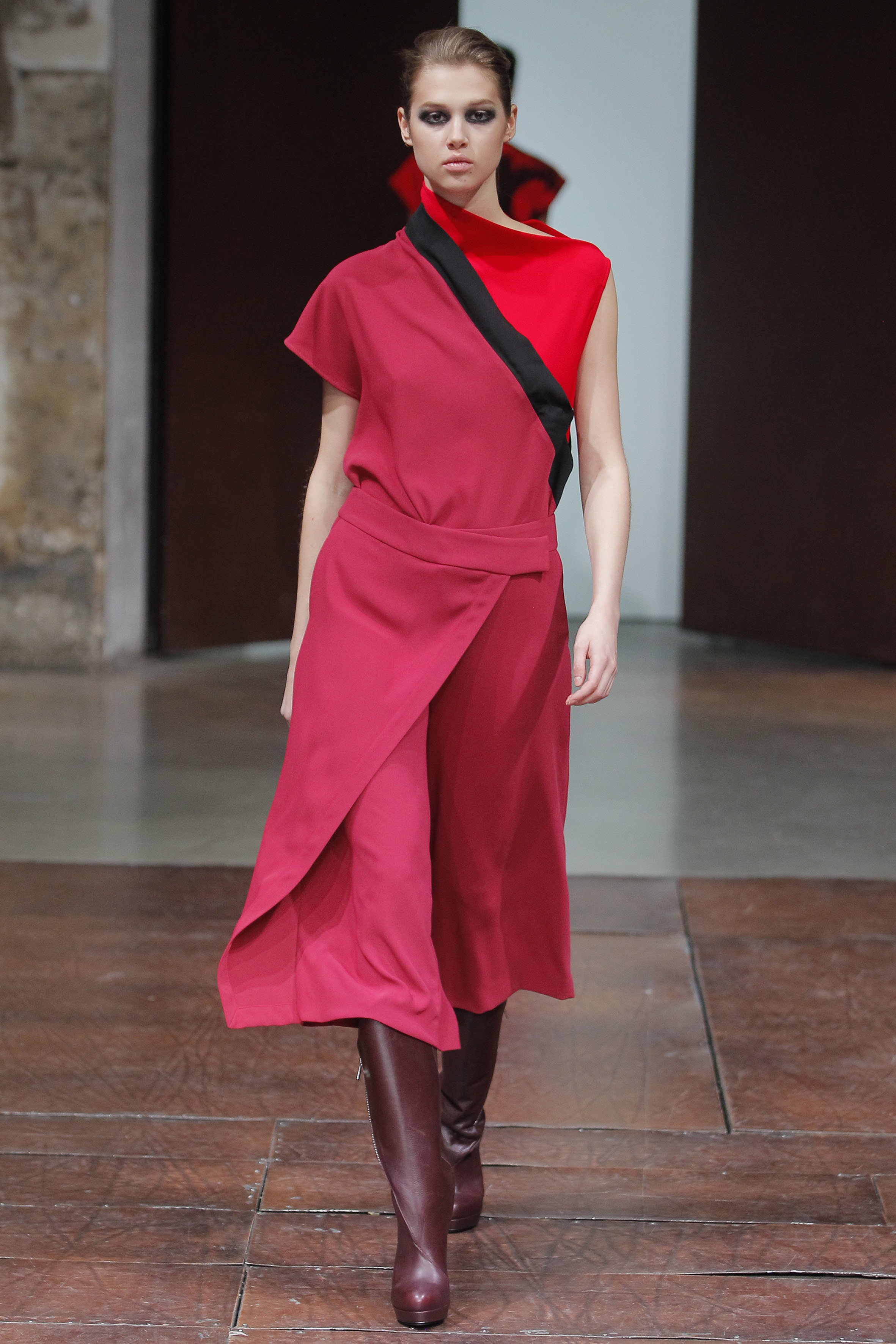 Pour cet hiver 13/14, Luis Buchinho propose une collection sur le thème de l’identité et notamment l’identité forte de la révolution portugaise. Le rouge et le noir rappelant la violence, cette collection est provocatrice et moderne de par l’utilisation des détails asymétriques et des constructions géométriques chères à Luis Buchinho. Les épaules sont marquées donnant un aspect rétro/moderne. Les matières utilisées sont variées, on y retrouve la peau, le tweed et la laine feutrée.