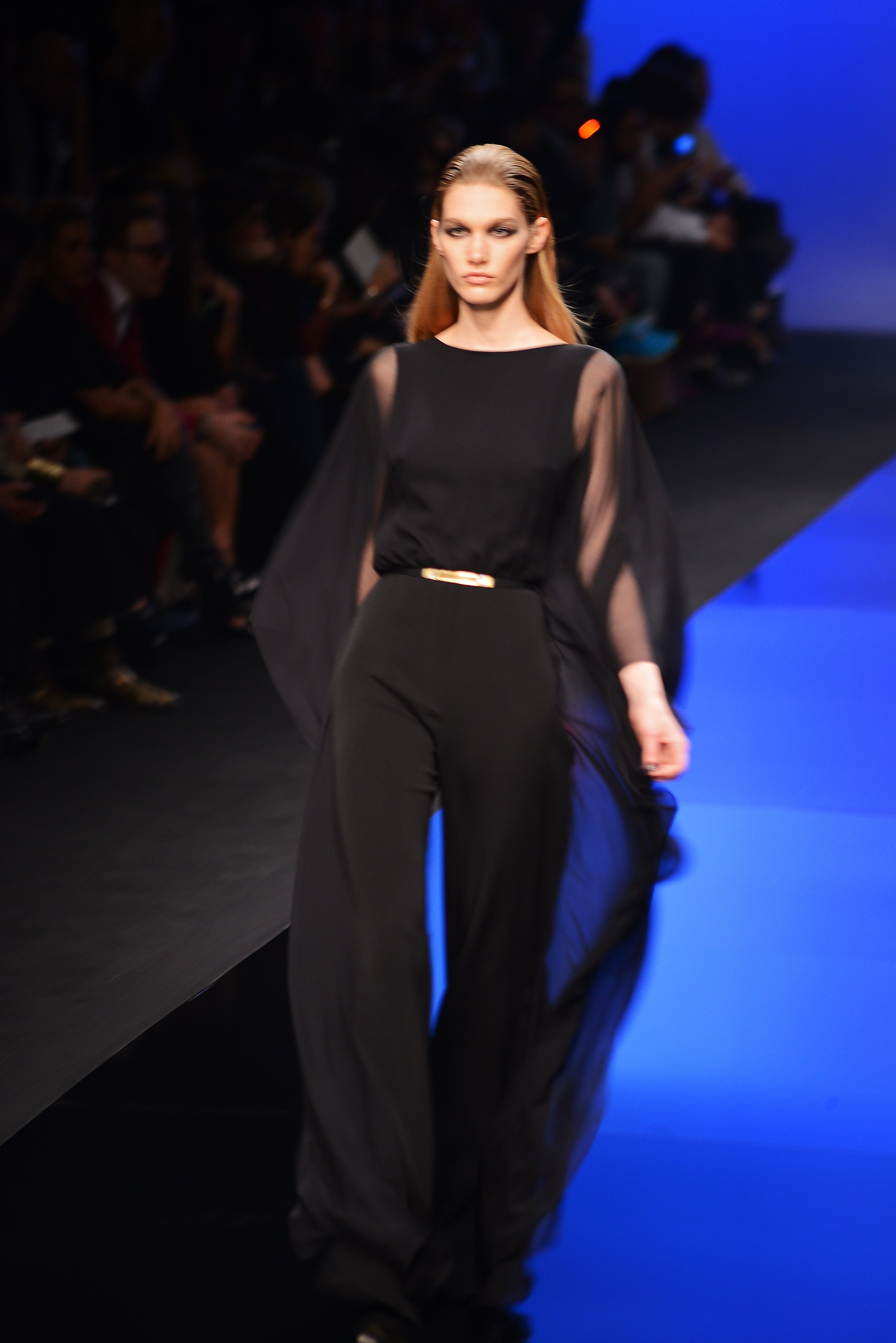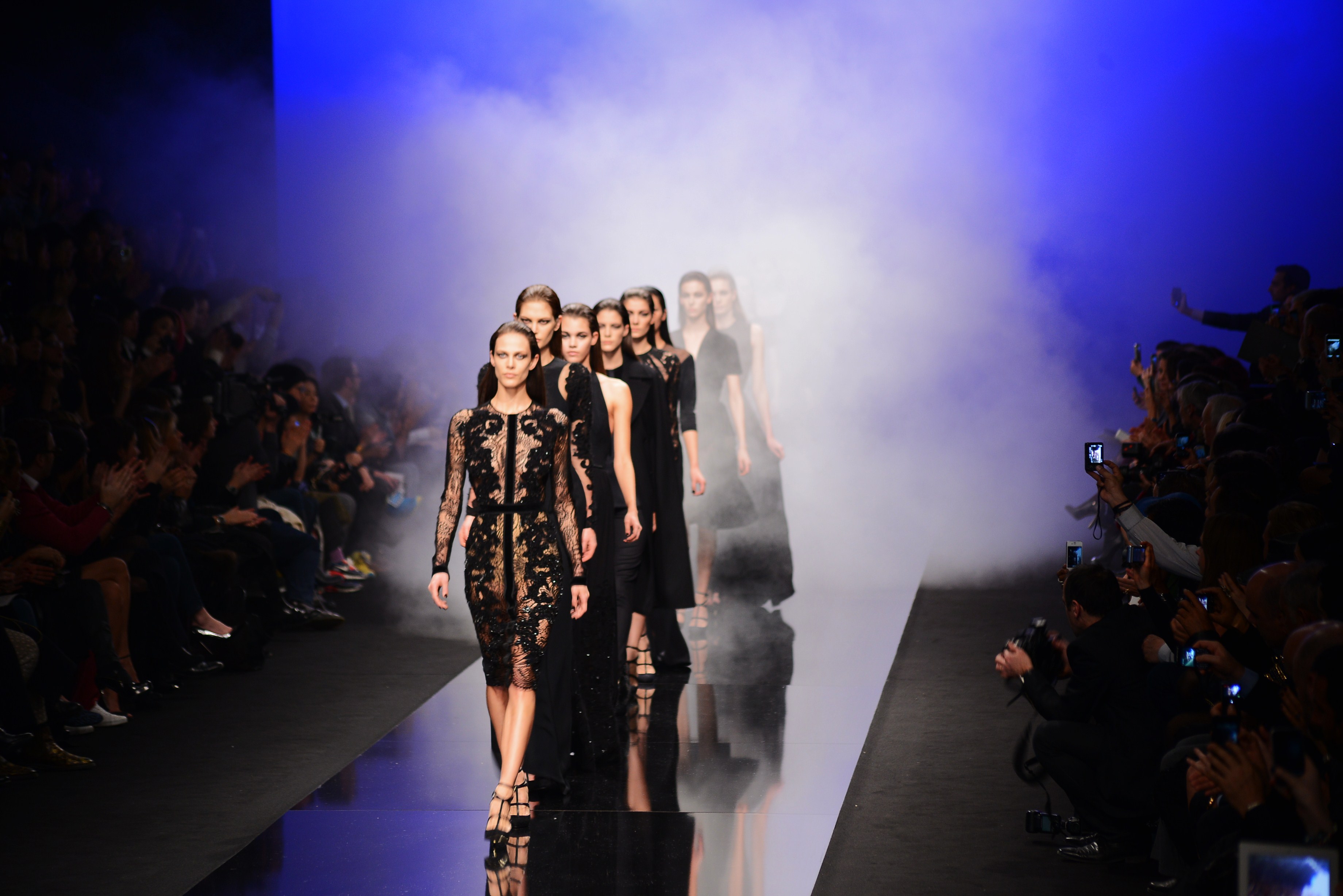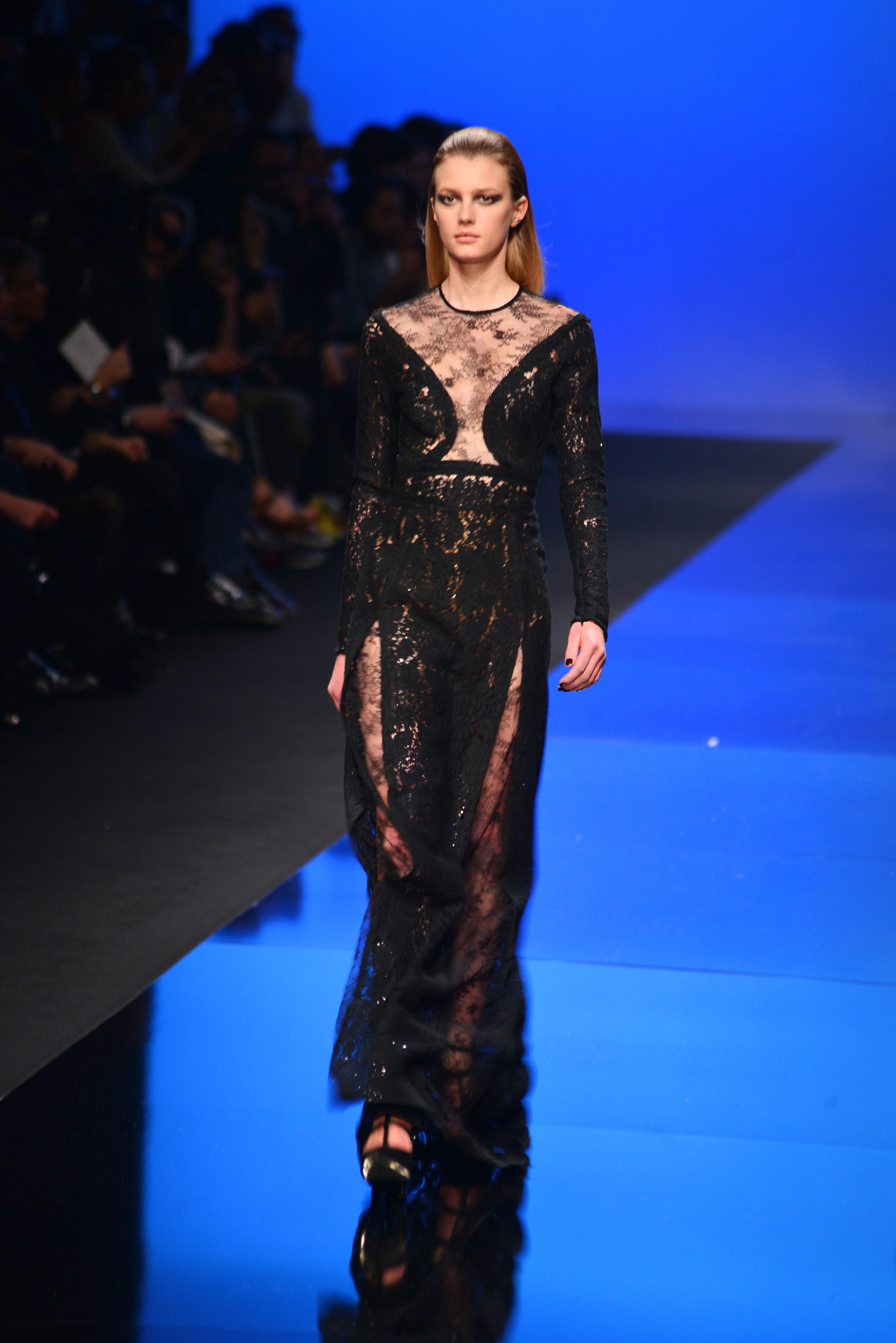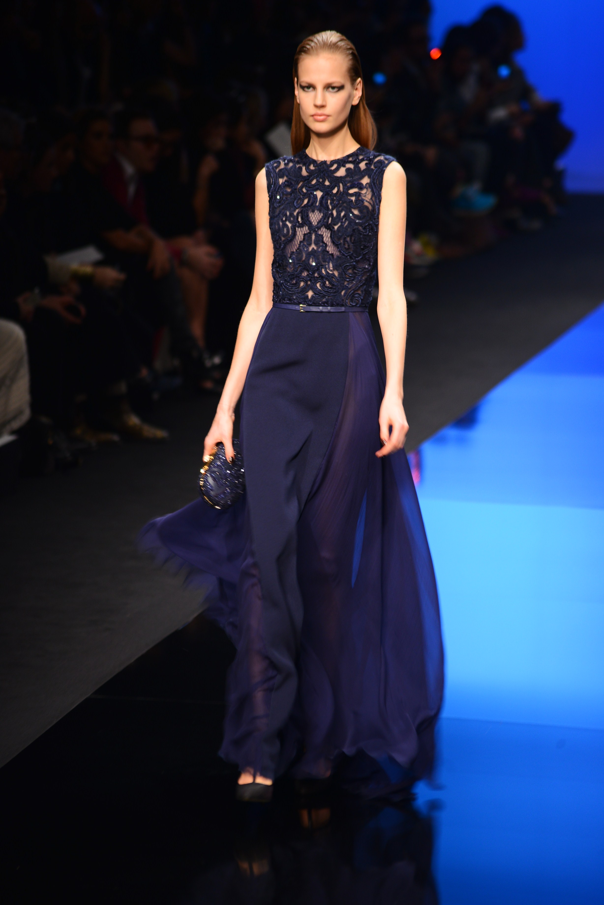 Du noir et du bleu marine ouvrent le défilé sur des looks plus masculins que ce à quoi nous avait habitué notre créateur favori. Les silhouettes sont structurées, sans superflu et le seul aspect décoratif qui pourrait transparaître vient des drapés. Les chemises, transparentes, nous rappellent cependant la véritable nature de la femme Élie Saab : séductrice et fatale.