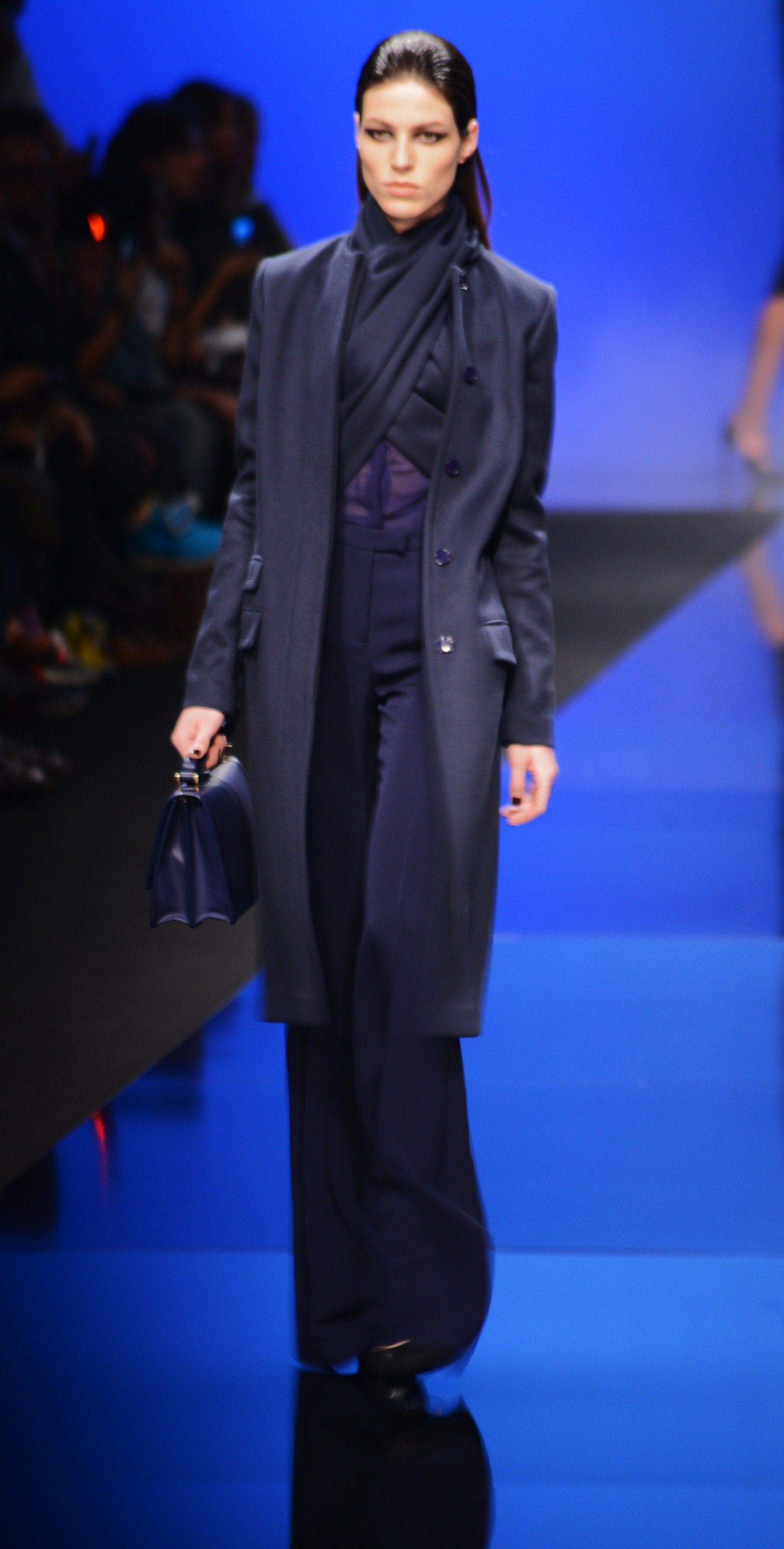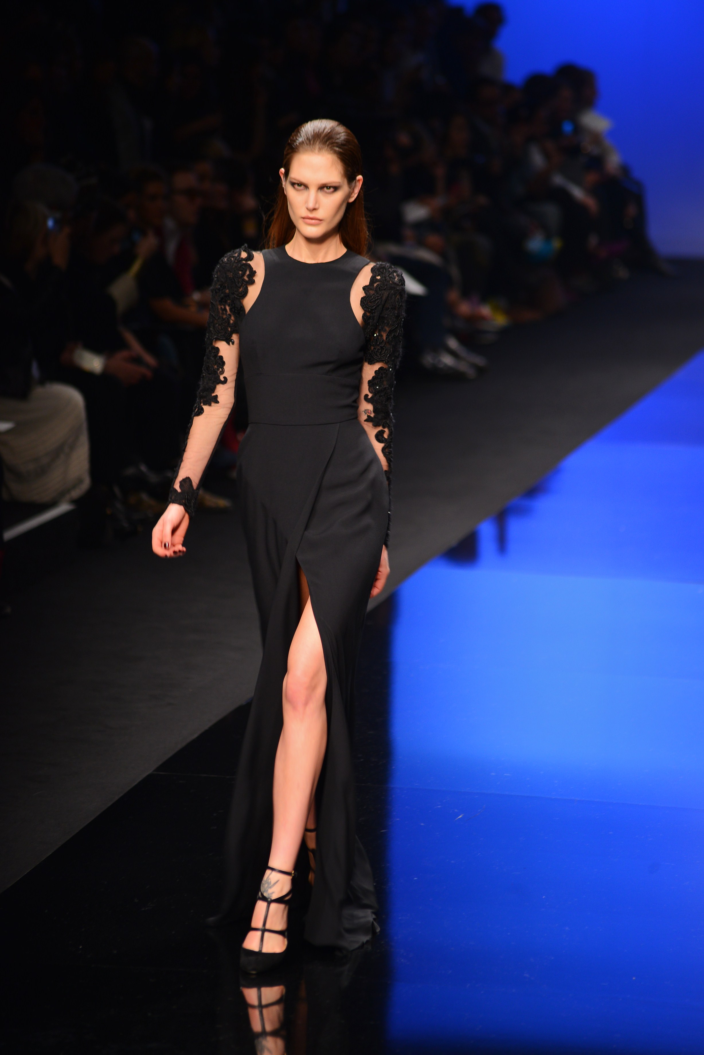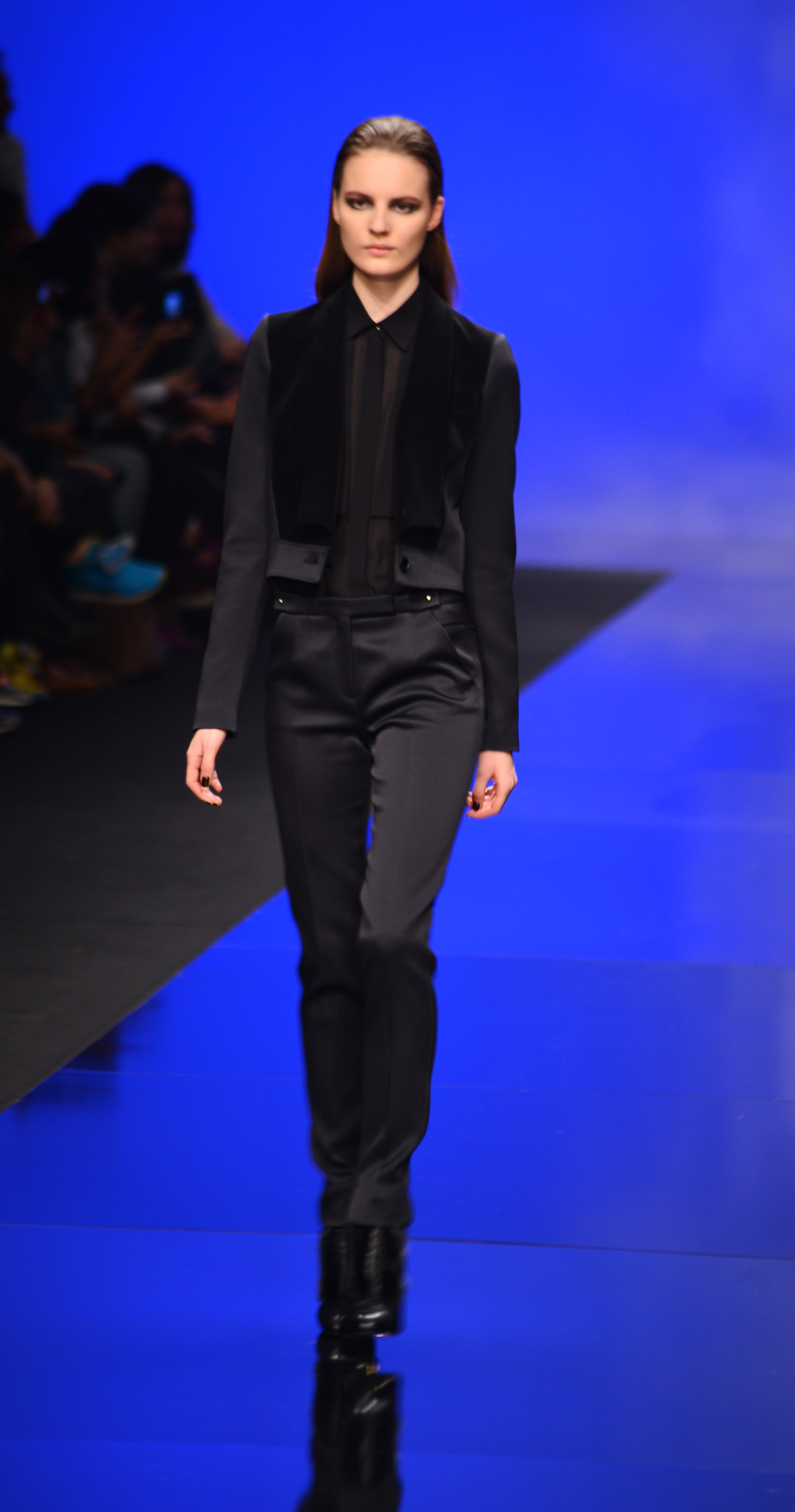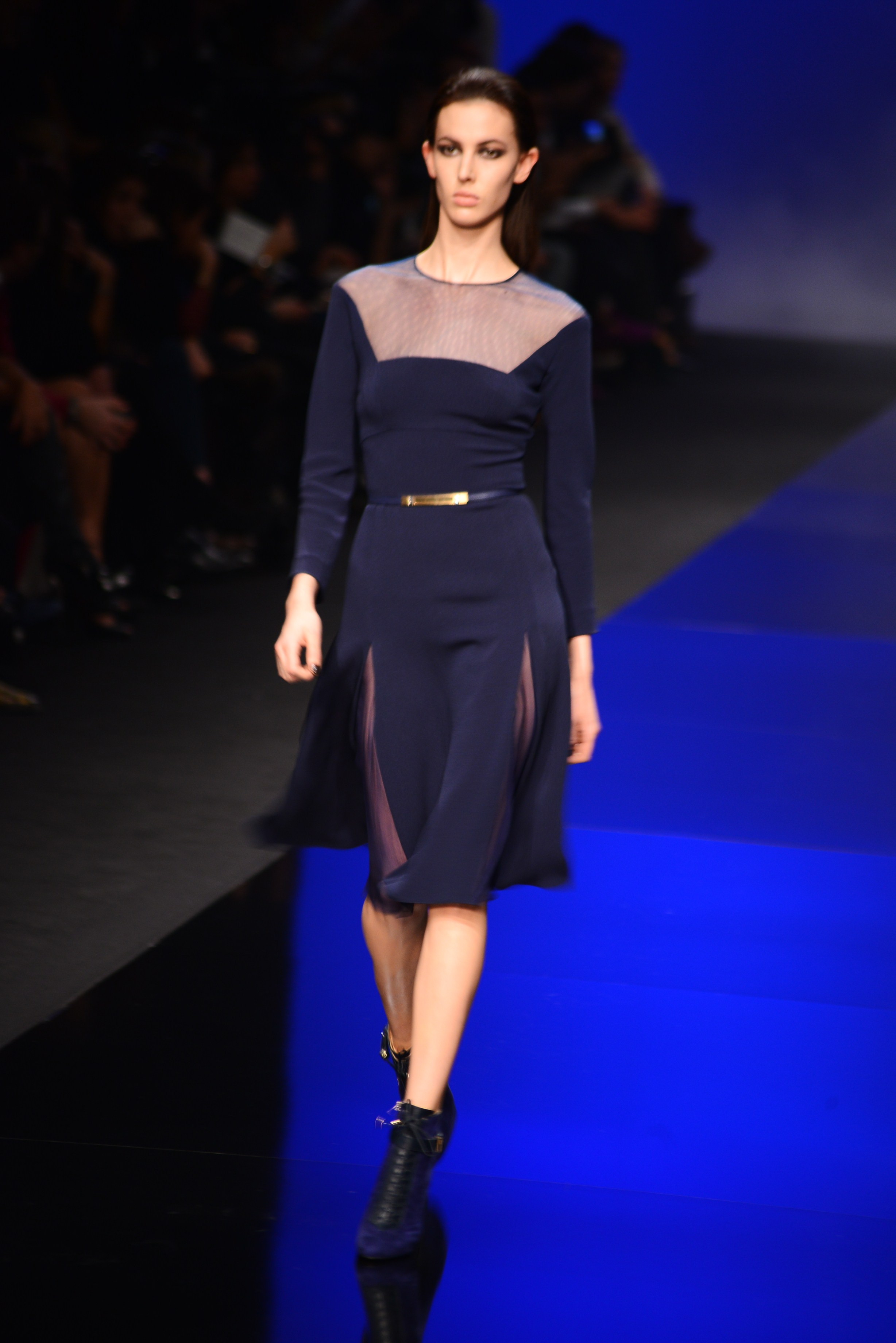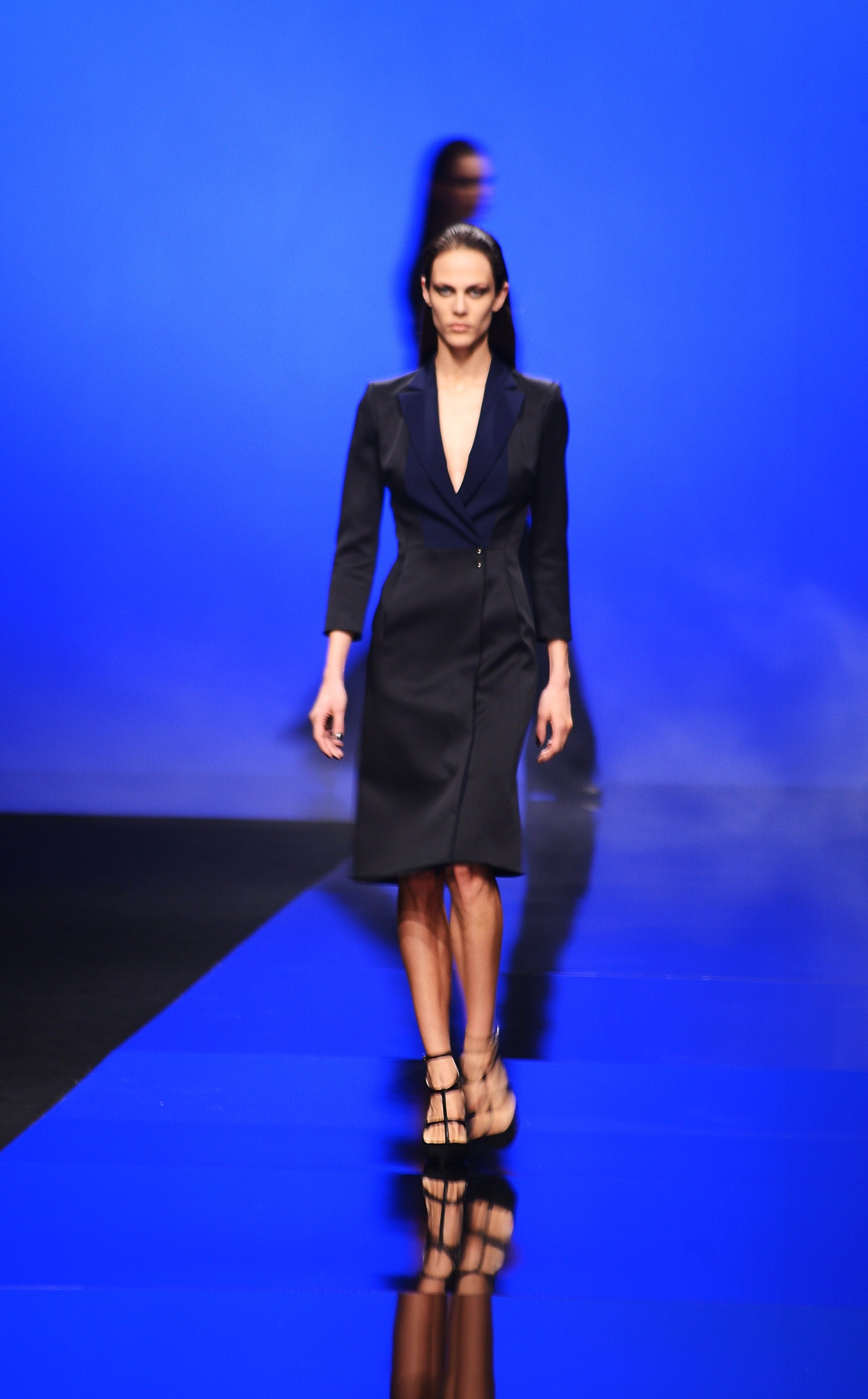 Du noir et du bleu marine ouvrent le défilé sur des looks plus masculins que ce à quoi nous avait habitué notre créateur favori. Les silhouettes sont structurées, sans superflu et le seul aspect décoratif qui pourrait transparaître vient des drapés. Les chemises, transparentes, nous rappellent cependant la véritable nature de la femme Élie Saab : séductrice et fatale.