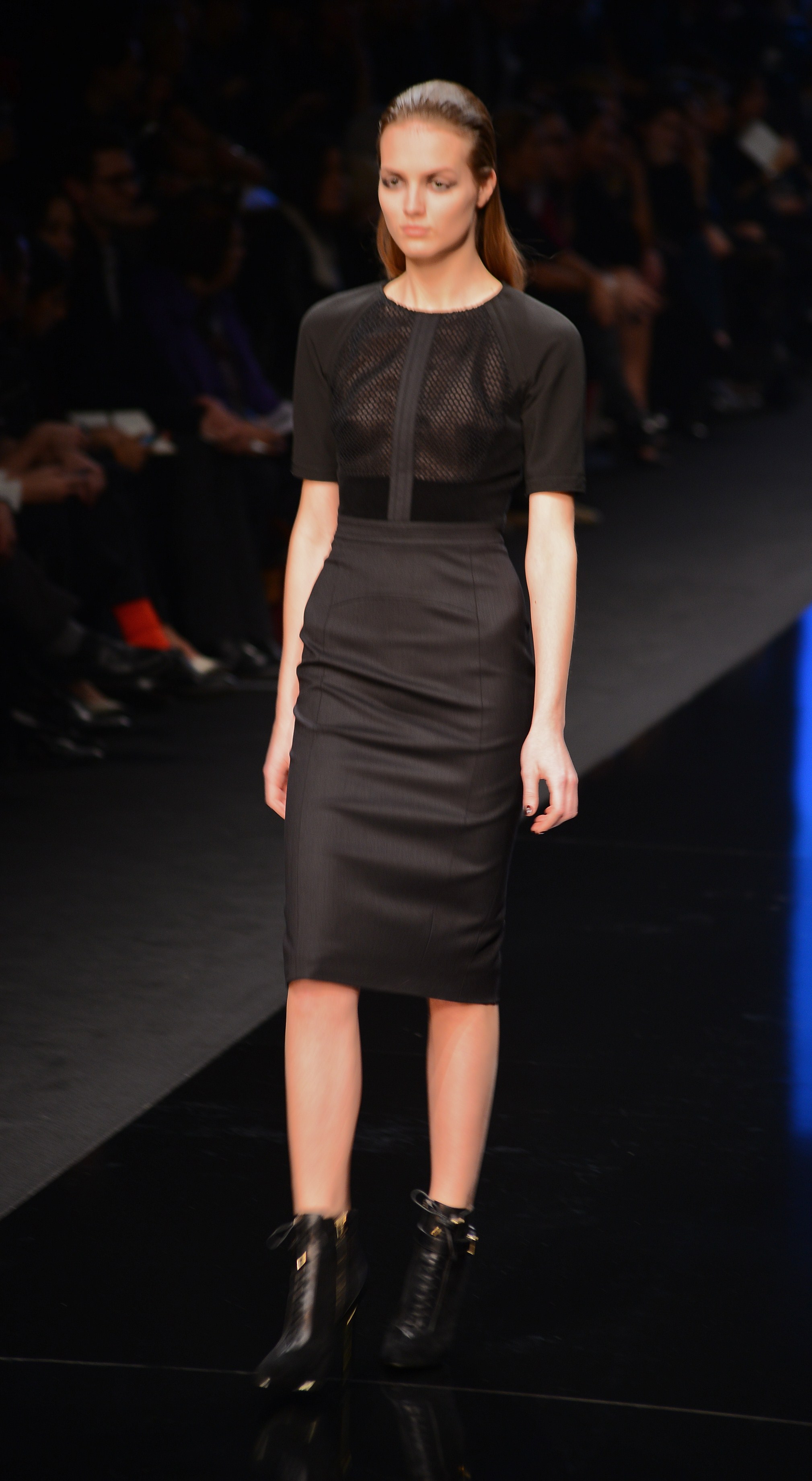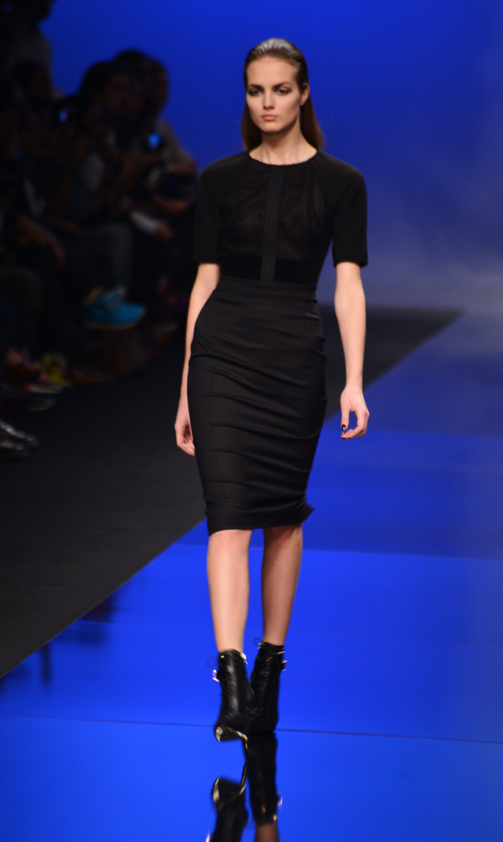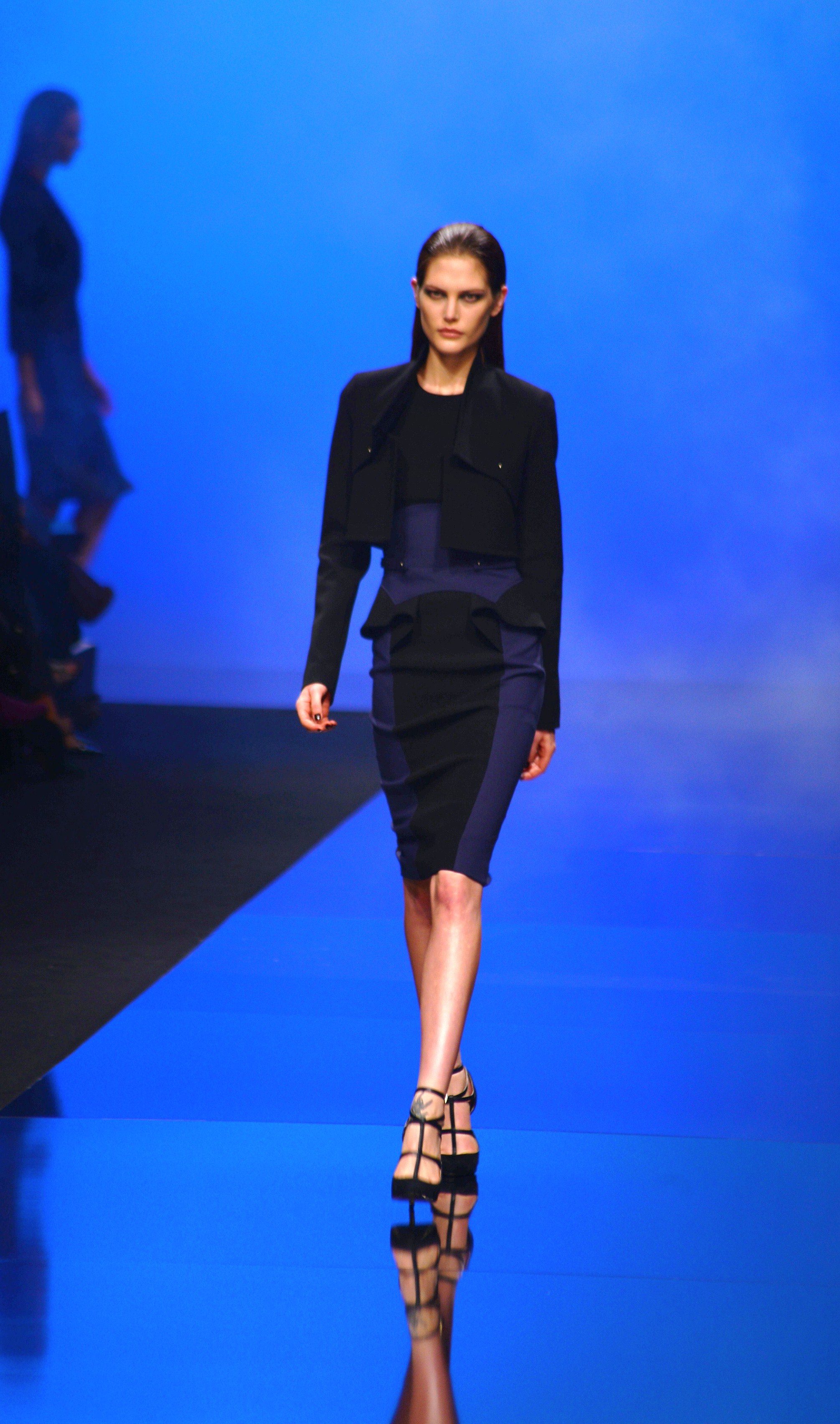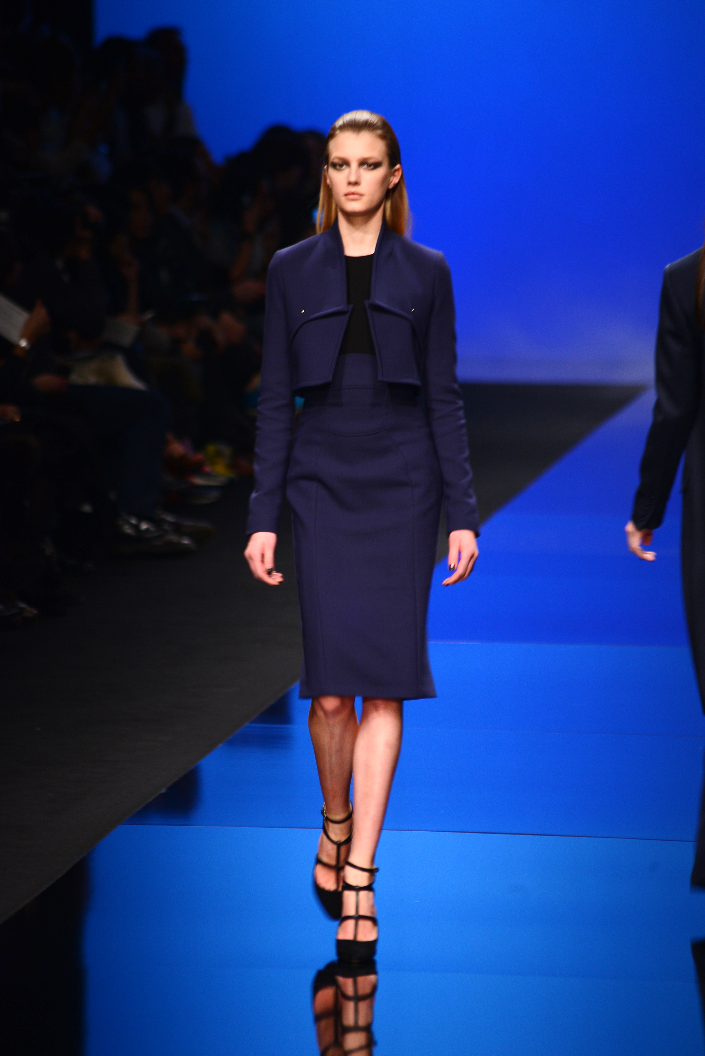 Du noir et du bleu marine ouvrent le défilé sur des looks plus masculins que ce à quoi nous avait habitué notre créateur favori. Les silhouettes sont structurées, sans superflu et le seul aspect décoratif qui pourrait transparaître vient des drapés. Les chemises, transparentes, nous rappellent cependant la véritable nature de la femme Élie Saab : séductrice et fatale.