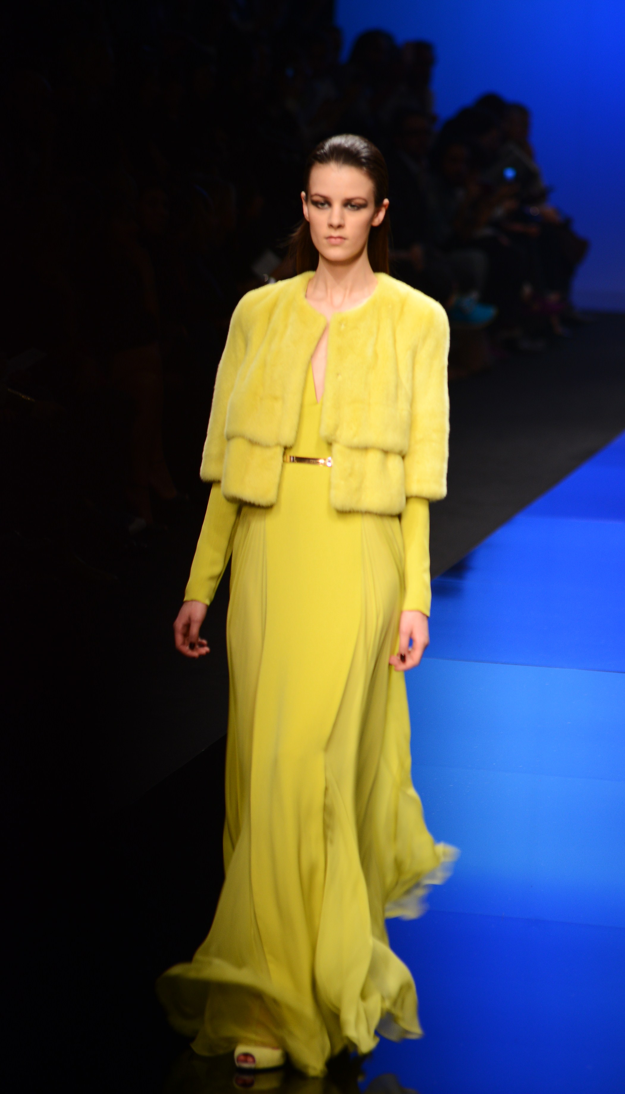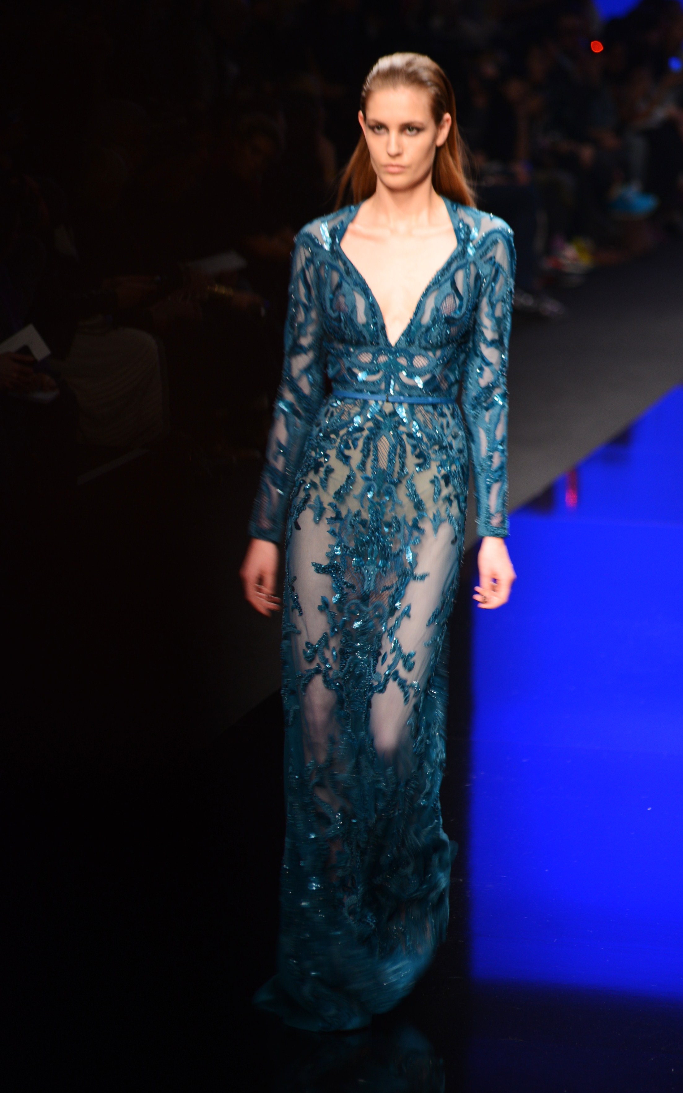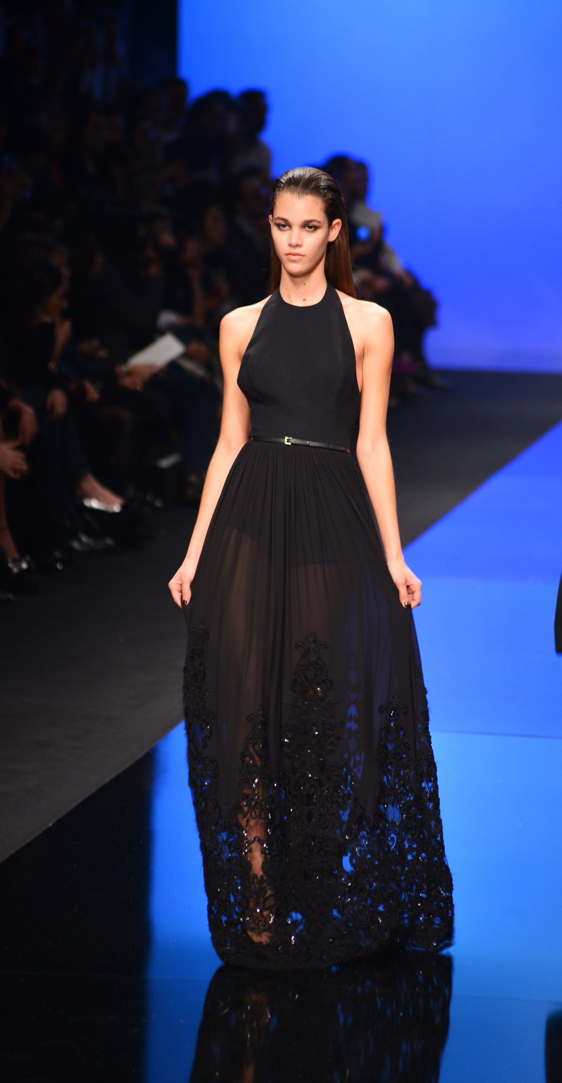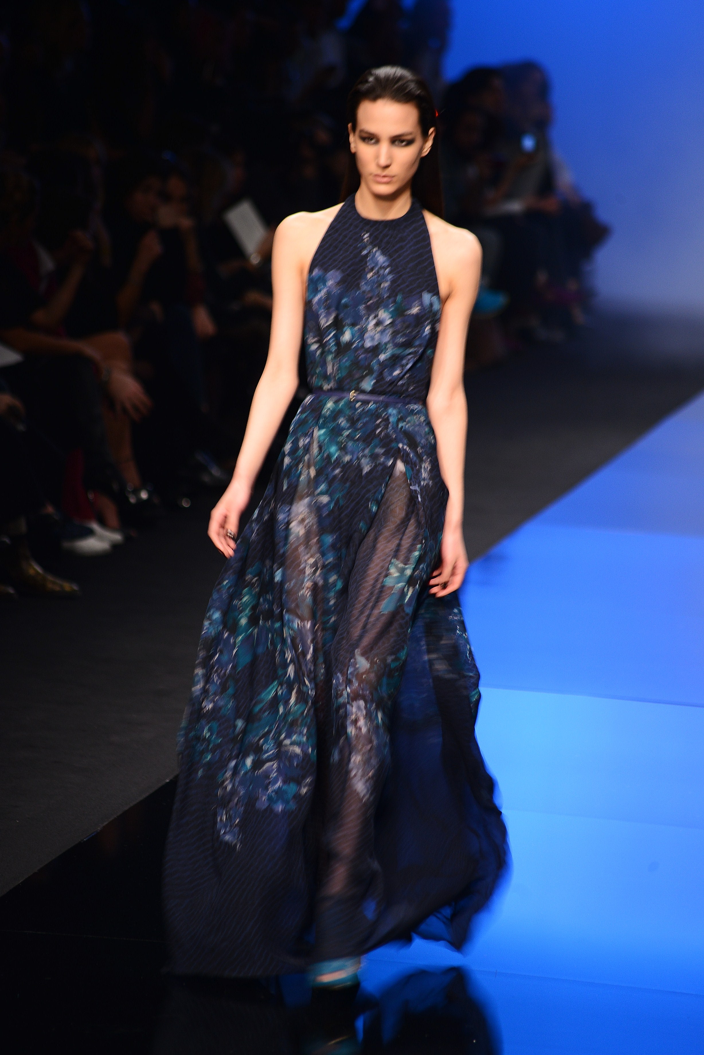 La longueur est de rigueur, nous sommes bien en présence d’une collection d’hiver, et le mouvement s’en retrouve souligné de façon quasi-chorégraphique. Les vêtements en sont d’autant plus dramatiques et théâtraux car cette longueur si chère à Élie Saab dégage une aura de sophistication et de noblesse monstre, comme venant d’une autre époque, une époque de glamour.