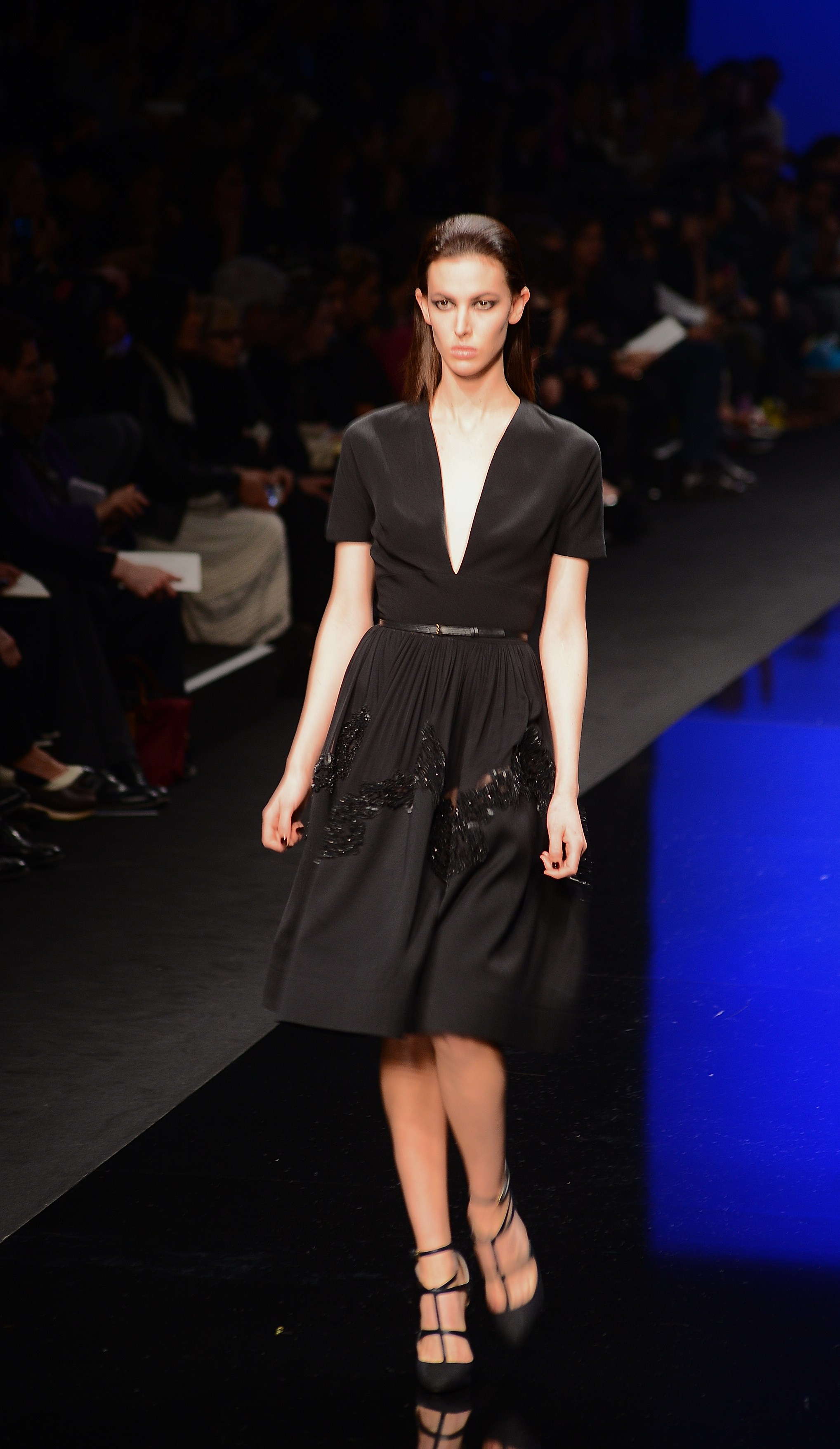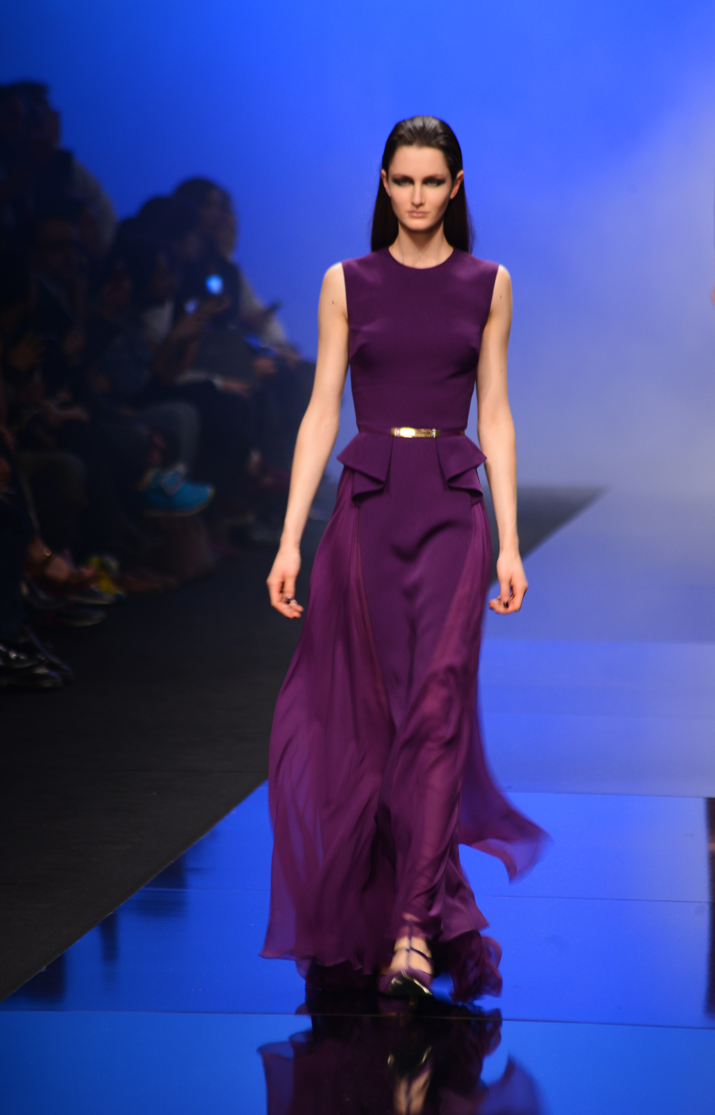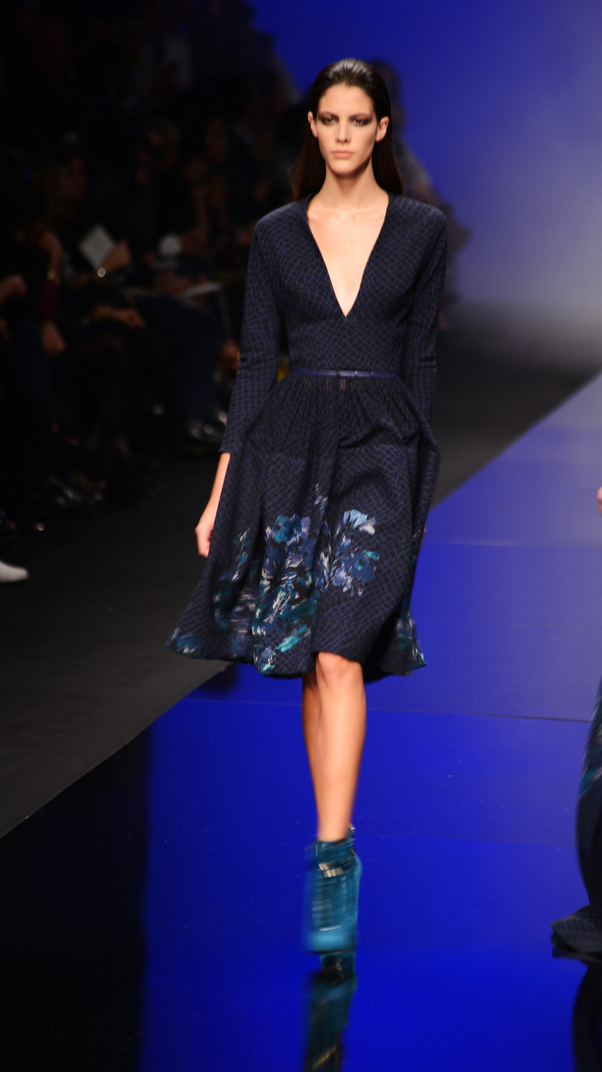 La longueur est de rigueur, nous sommes bien en présence d’une collection d’hiver, et le mouvement s’en retrouve souligné de façon quasi-chorégraphique. Les vêtements en sont d’autant plus dramatiques et théâtraux car cette longueur si chère à Élie Saab dégage une aura de sophistication et de noblesse monstre, comme venant d’une autre époque, une époque de glamour.