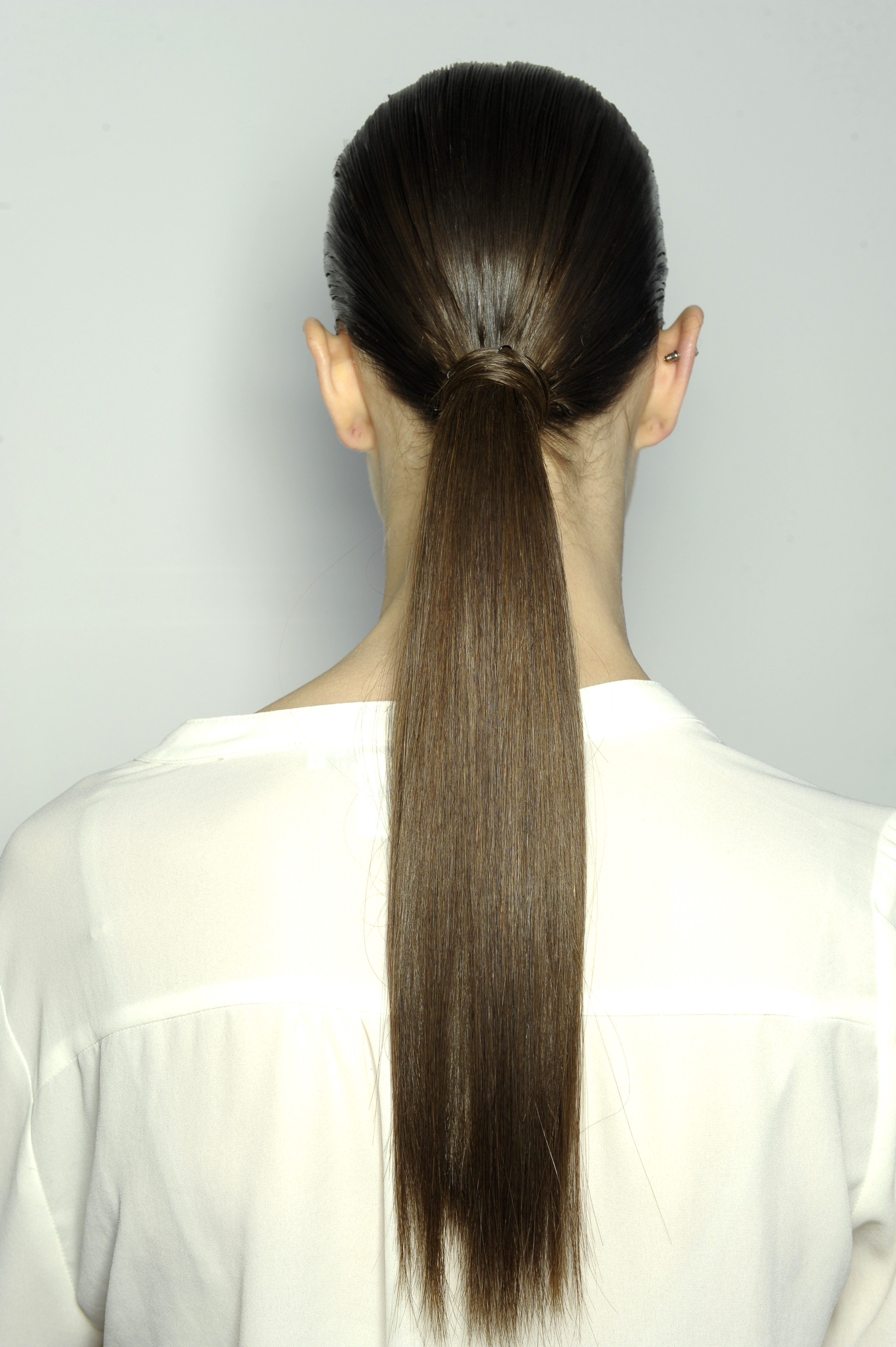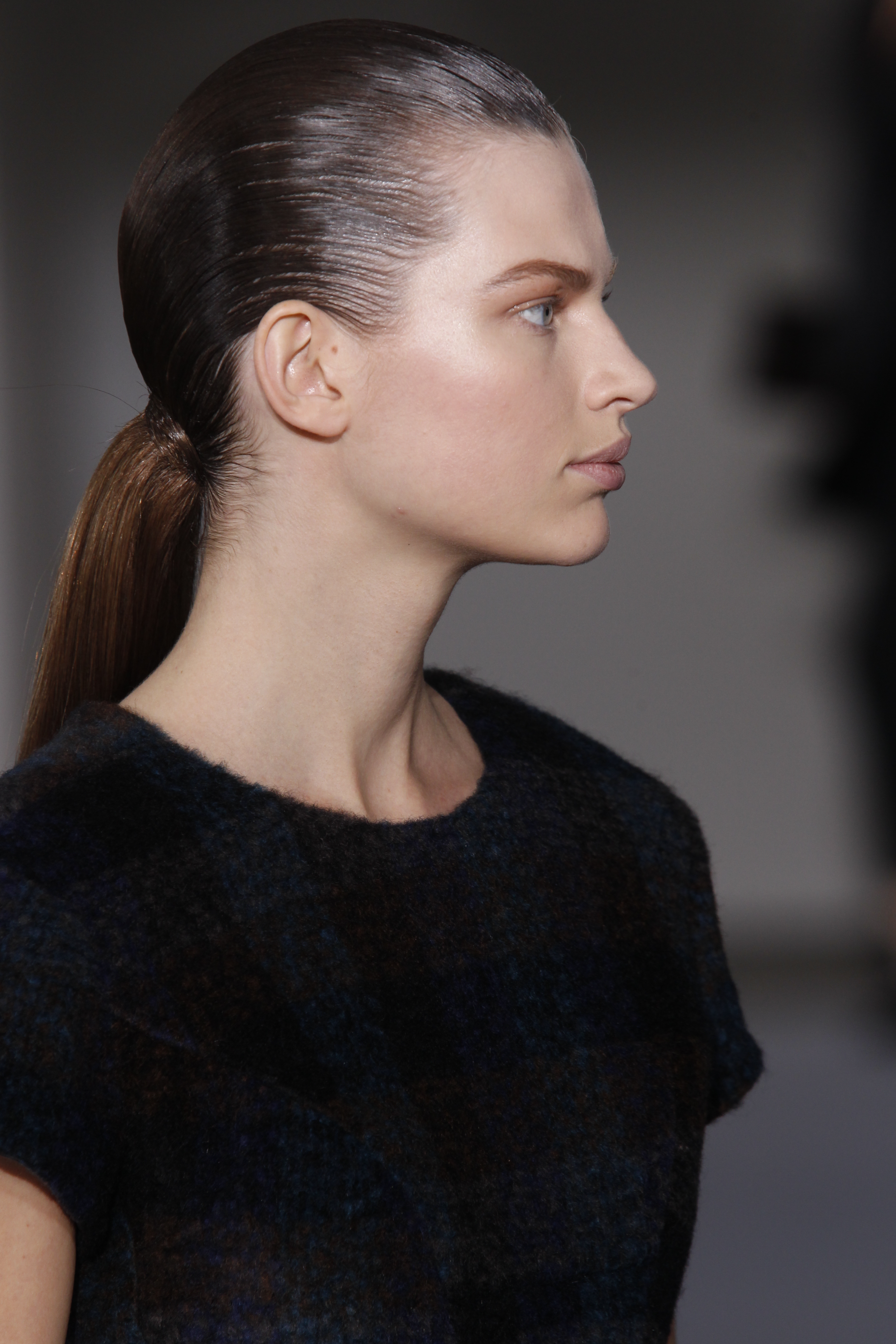 Il y a quelque chose de pure, de minimaliste chez la « Jil Sander girl »: des racines ultra « wet », une longue queue de cheval basse avec mèche autour de l’élastique, cette partie low sur cheveux secs pour créer un contraste. Pour que l’effet mouillé dure, il faut en appliquer sur chaque mèche que l’on souhaite travailler, dès la racine. Si on se contente de n’appliquer le gel que sur le dessus, l’effet s’estompe rapidement et on perd l’idée de contraste. Le maquillage reste très sobre, pour ne pas dire inexistant.