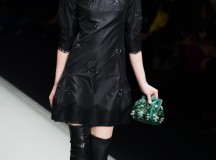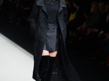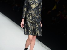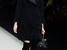 Le velours se retrouve la plupart du temps sur les bottes et les ensembles en brocart. Les looks noirs se veulent sophistiqués et sérieux et légèrement plus masculins que le reste de la collection (vestes sans manche, manteau long). D’ailleurs, à propos des manteaux, un choix surprenant de textiles est fait cette saison, on retrouve du lurex sur les ensembles et les manteaux.