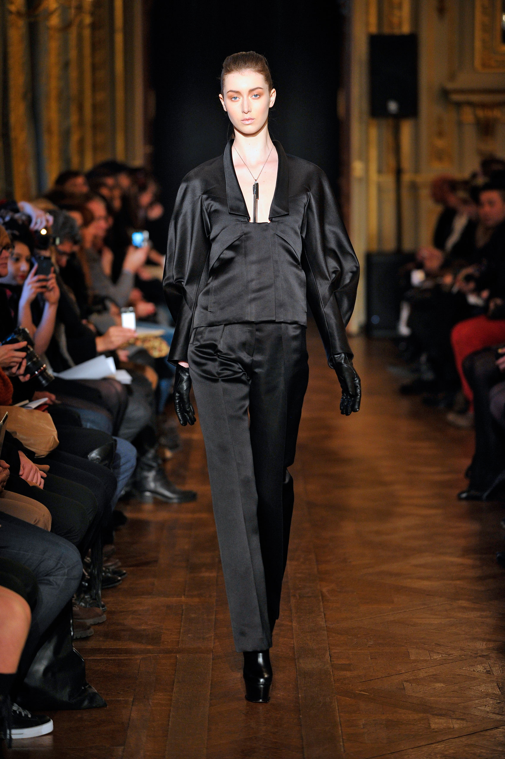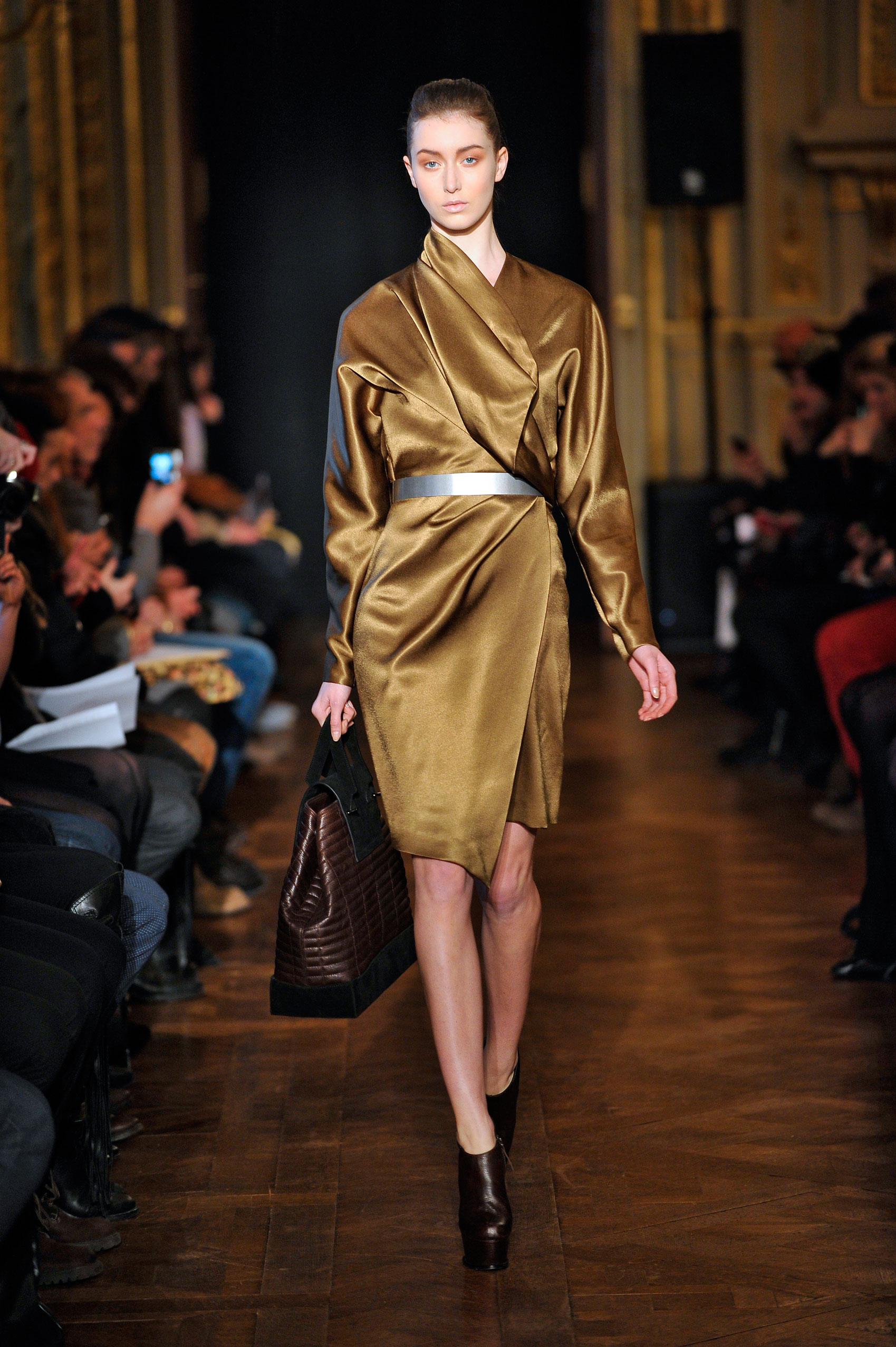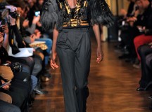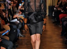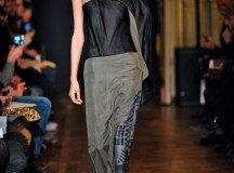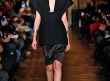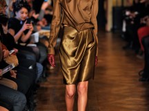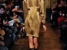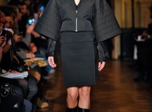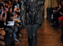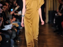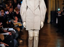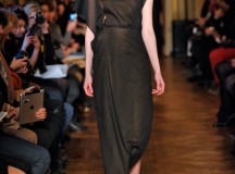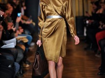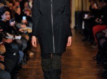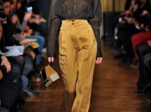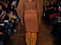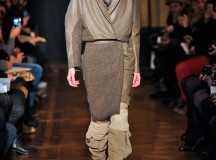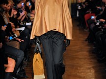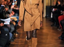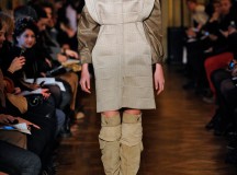 Beige, camel, noir, taupe et chocolat sont les couleurs de la saison. Le défilé s’ouvre sur des vêtements matelassés, plus précisément des manteaux et des pantalons en cuir matelassé. Les tons terreux sont à l’origine d’une inspiration naturelle et la créatrice est cohérente dans son choix de matières…même les détails des talons sont étudiés étant donnés qu’il sont en bois.